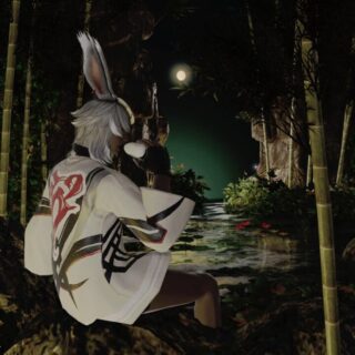 碧々と生える竹林の奥にあるひっそりと月に照らされた池