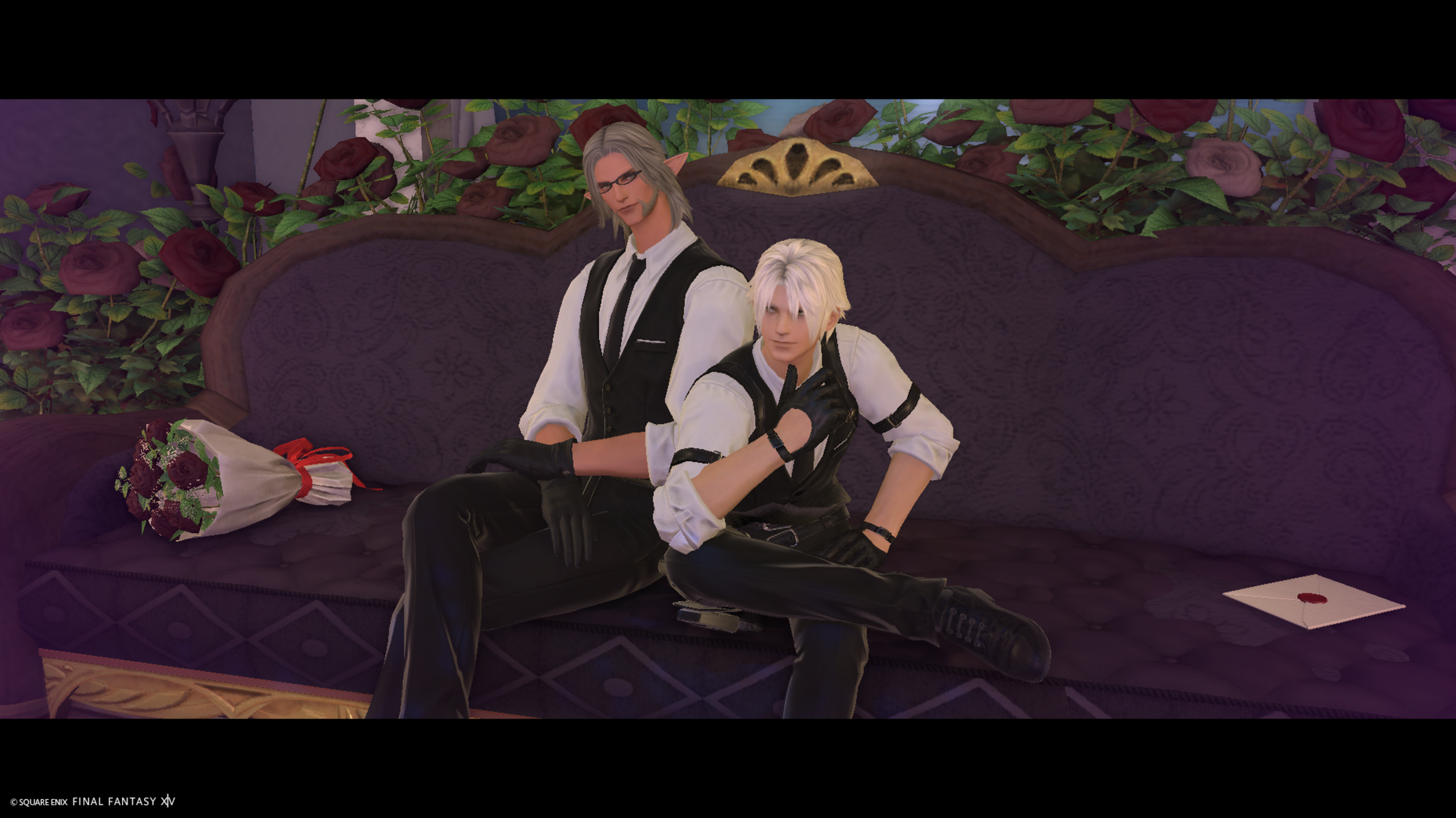 深紅の薔薇と月の光のスタジオ「13th FLOOR with MOONSHINE」では中央の椅子に二人で肩を預けて座る事が出来ます!(座り方のコツは画像2枚目参照)