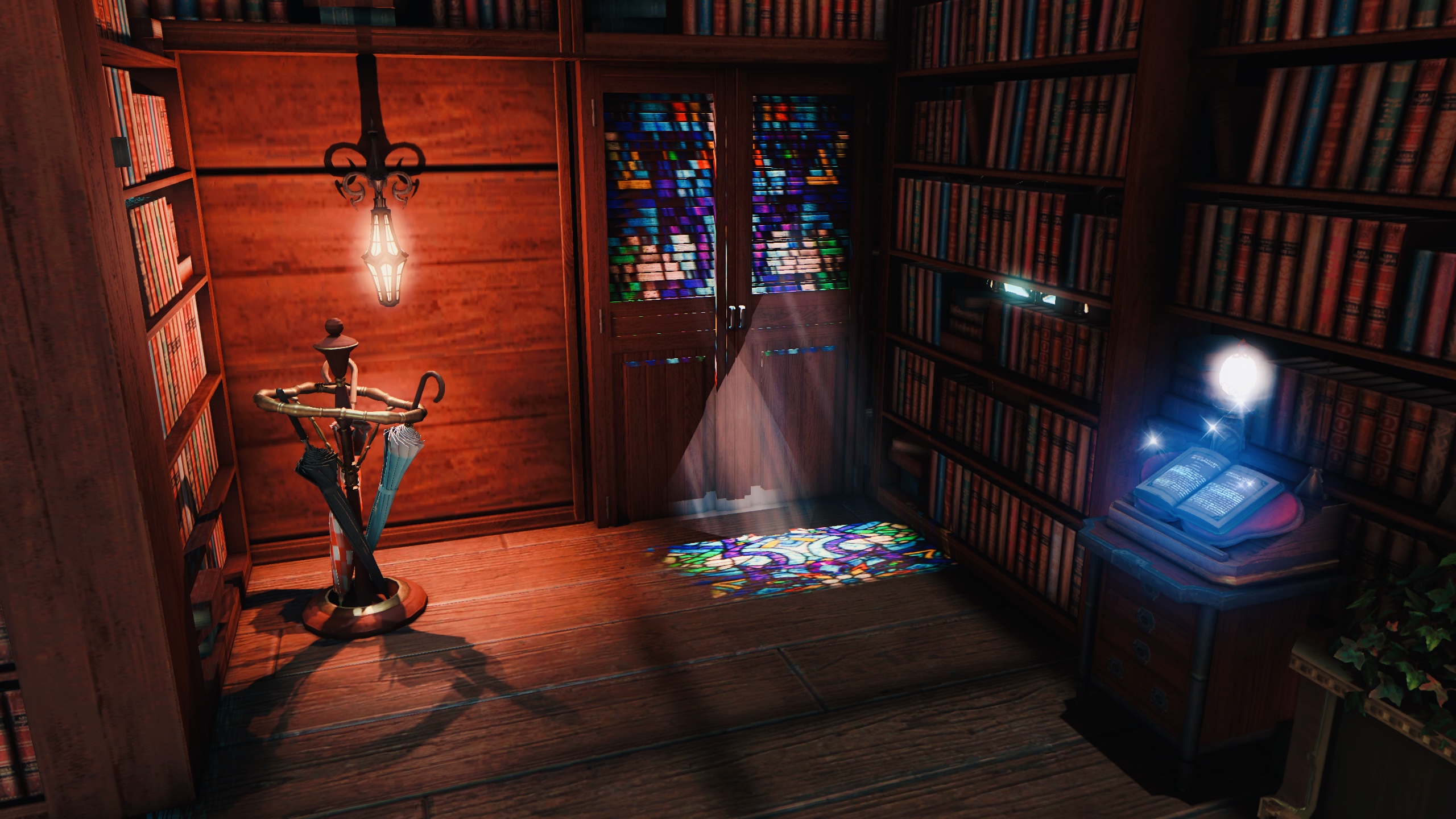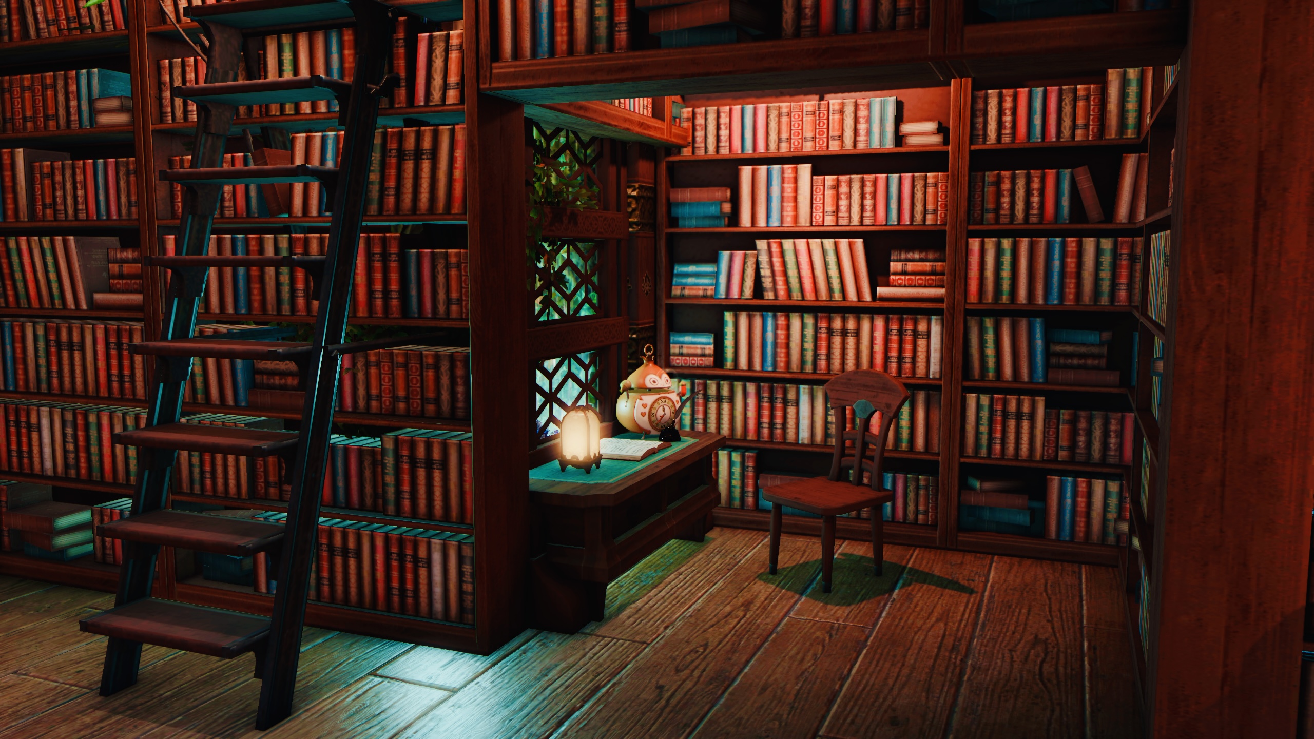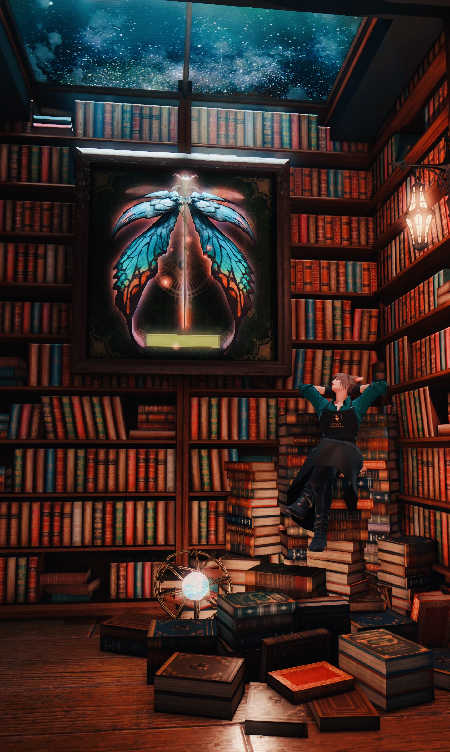 積まれた本二か所仕込み椅子あり。奥の部屋の窓の右側から外に出られる所の撮影もおすすめ。時間帯によって雰囲気が変わる様にしたので、朝昼晩でそれぞれ楽しめるかと思います。