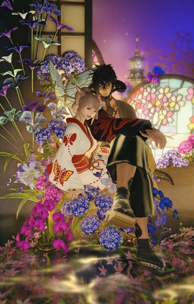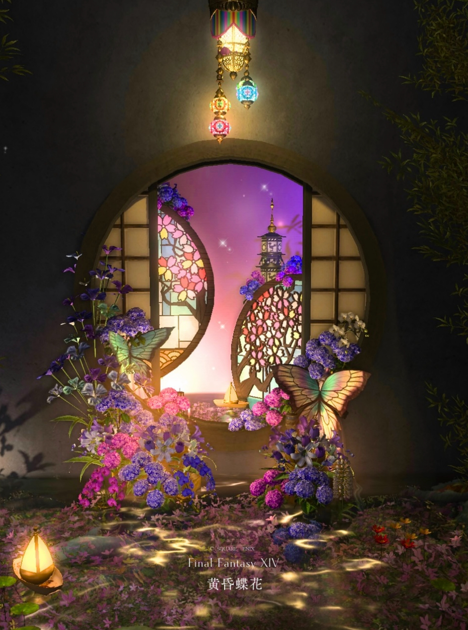黄昏蝶花 by kamiyu(||BR||)🌐Meteor / Yojimbo(||BR||)📍シロガネ7区(||BR||)アパルトメント(拡張街)4号室(||BR||)太陽が水面に沈む黄昏時をグラデーションで表現しました。(||BR||)花と蝶、輝く空と水面が織り成す和風スタジオです🦋(||BR||)撮影訪問大歓迎です✨️(||BR||)蝶の下にそれぞれ仕込み椅子がありま(||BR||)#HousingNoah(||BR||)https://studio-xiv.com/studio/66098/