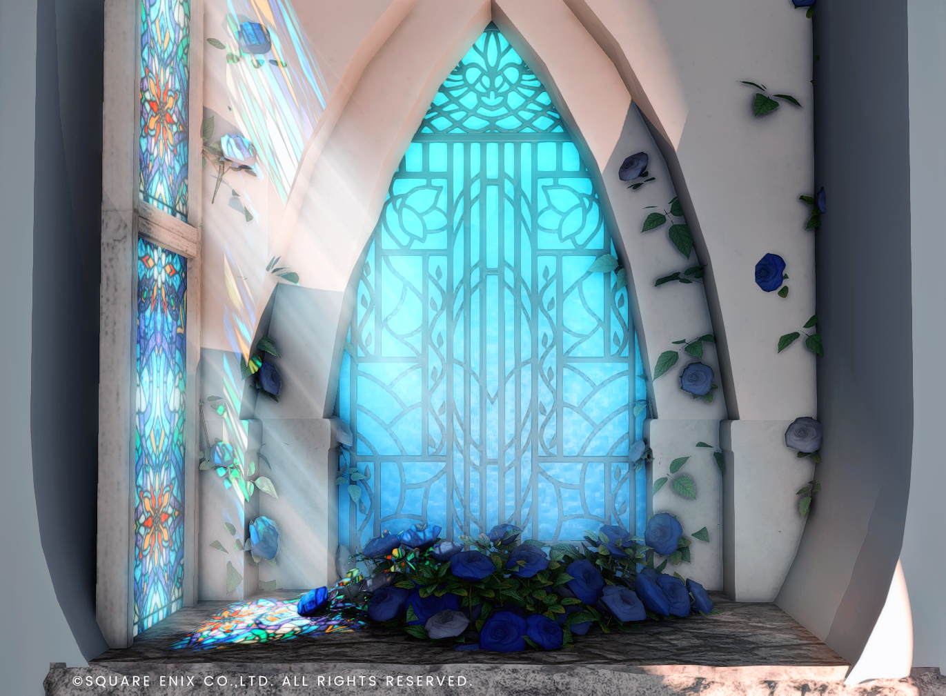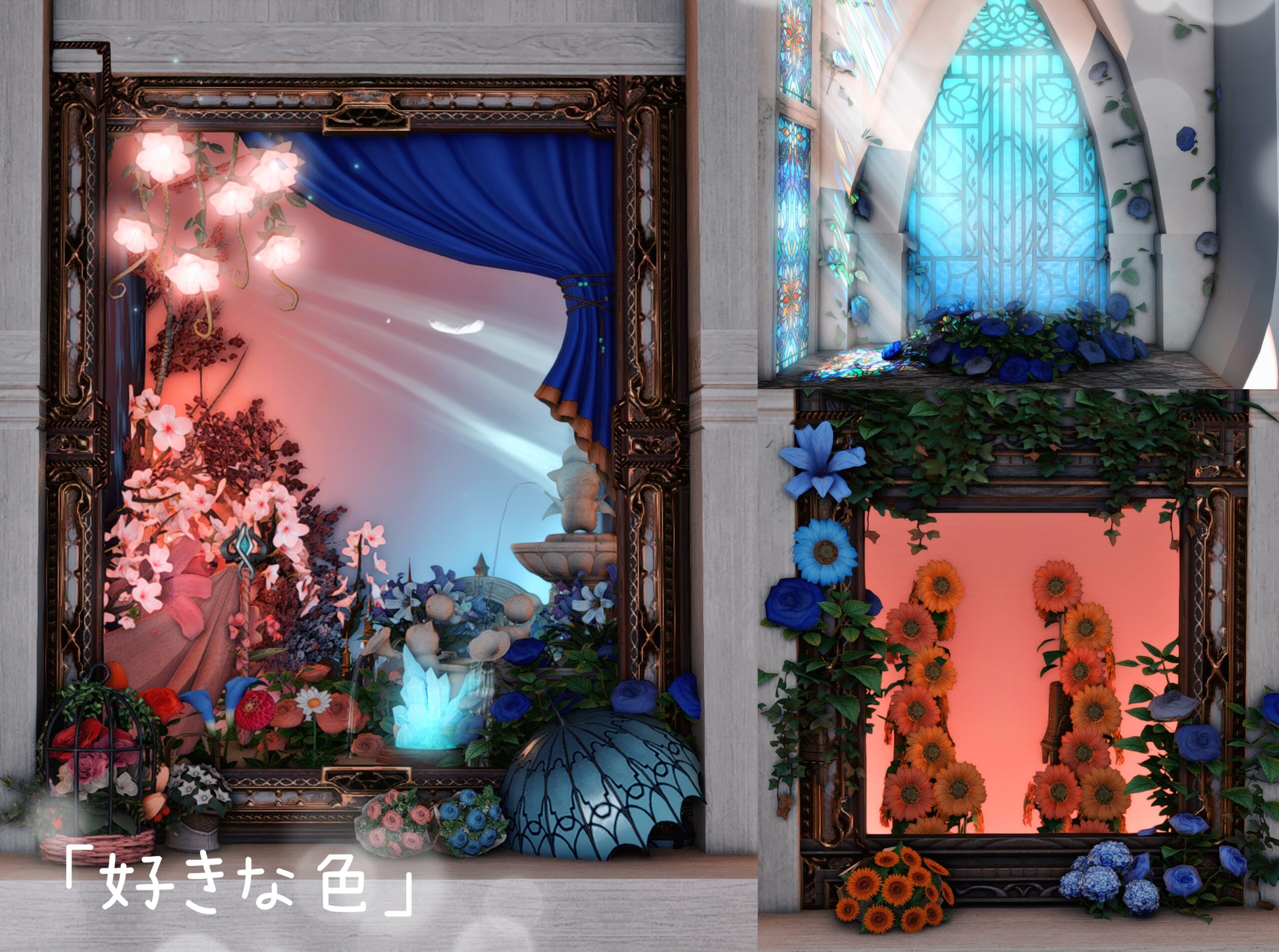 「青」ー ステンドグラスのライトの遊びです。眠り・座りギミックなし。ET 10:00 - 18:00 オススメです。左側のステンドグラスはET 10:00 - 13:00まで、後ろの方はET 13:00 - 18:00まで。