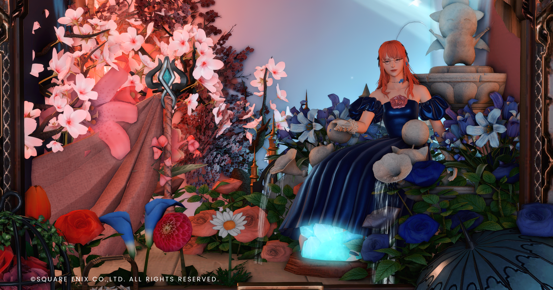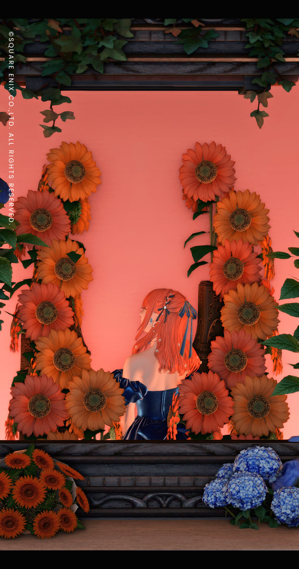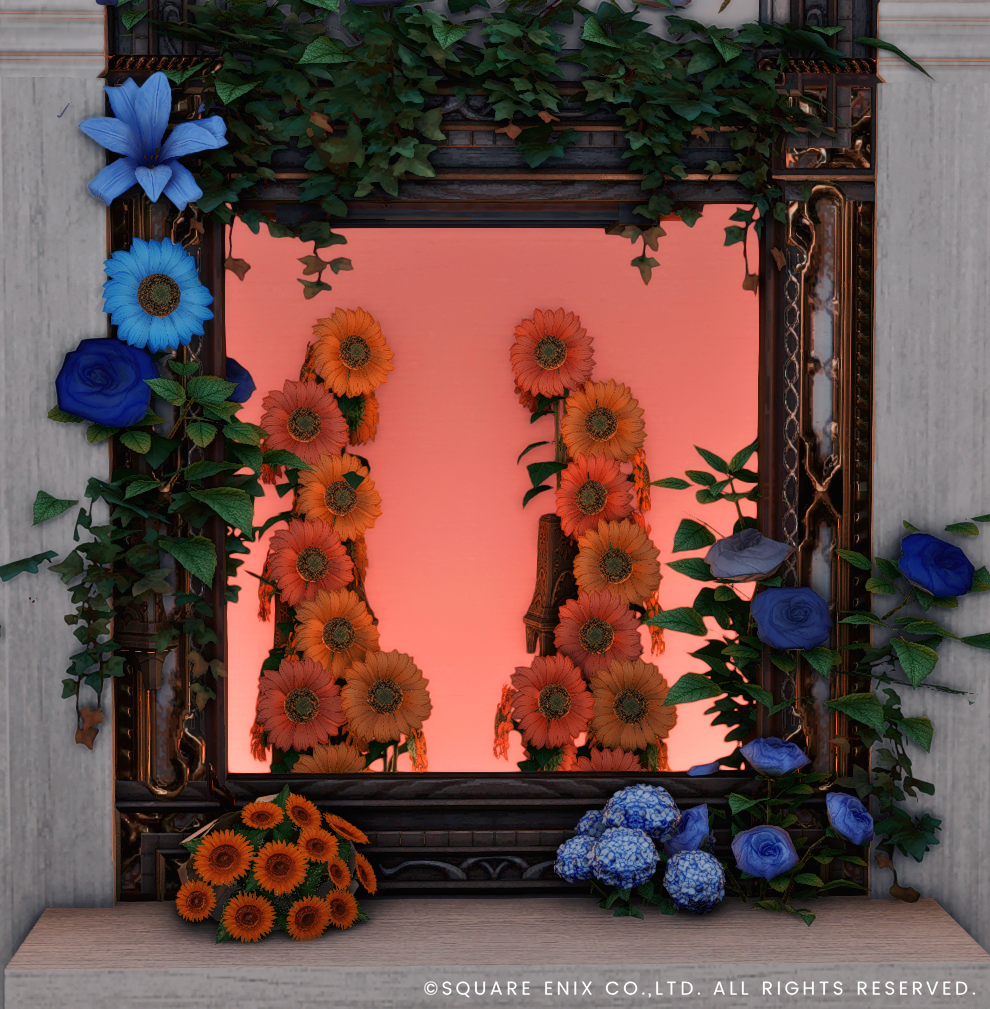 「2」ー フレームの前に座りことができます。後ろに立つか、前に座るかは自分のキャラに調整してください。後ろの花をルガ族でも埋めます。小さい種族(メスラ、メスッテ、背が低いミドラン、ララフェル)はテーブルの上に立つのオススメします。