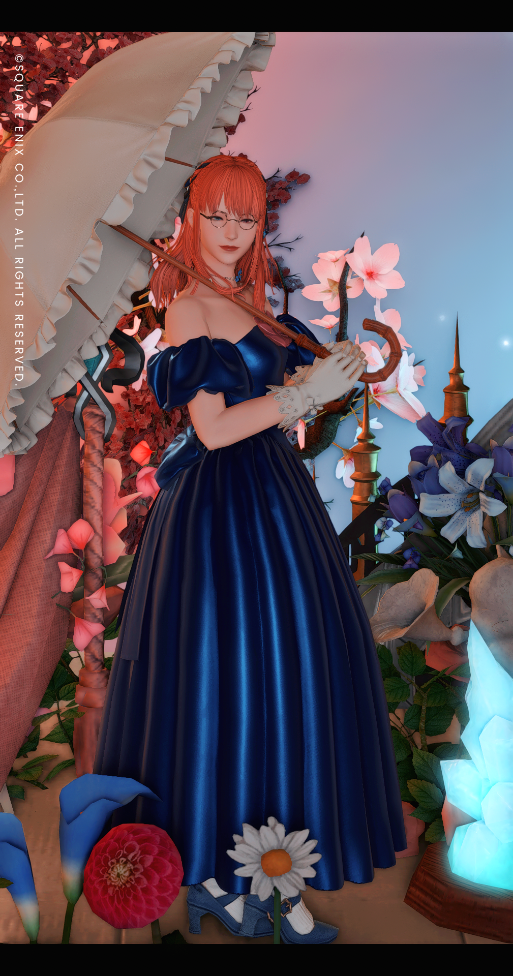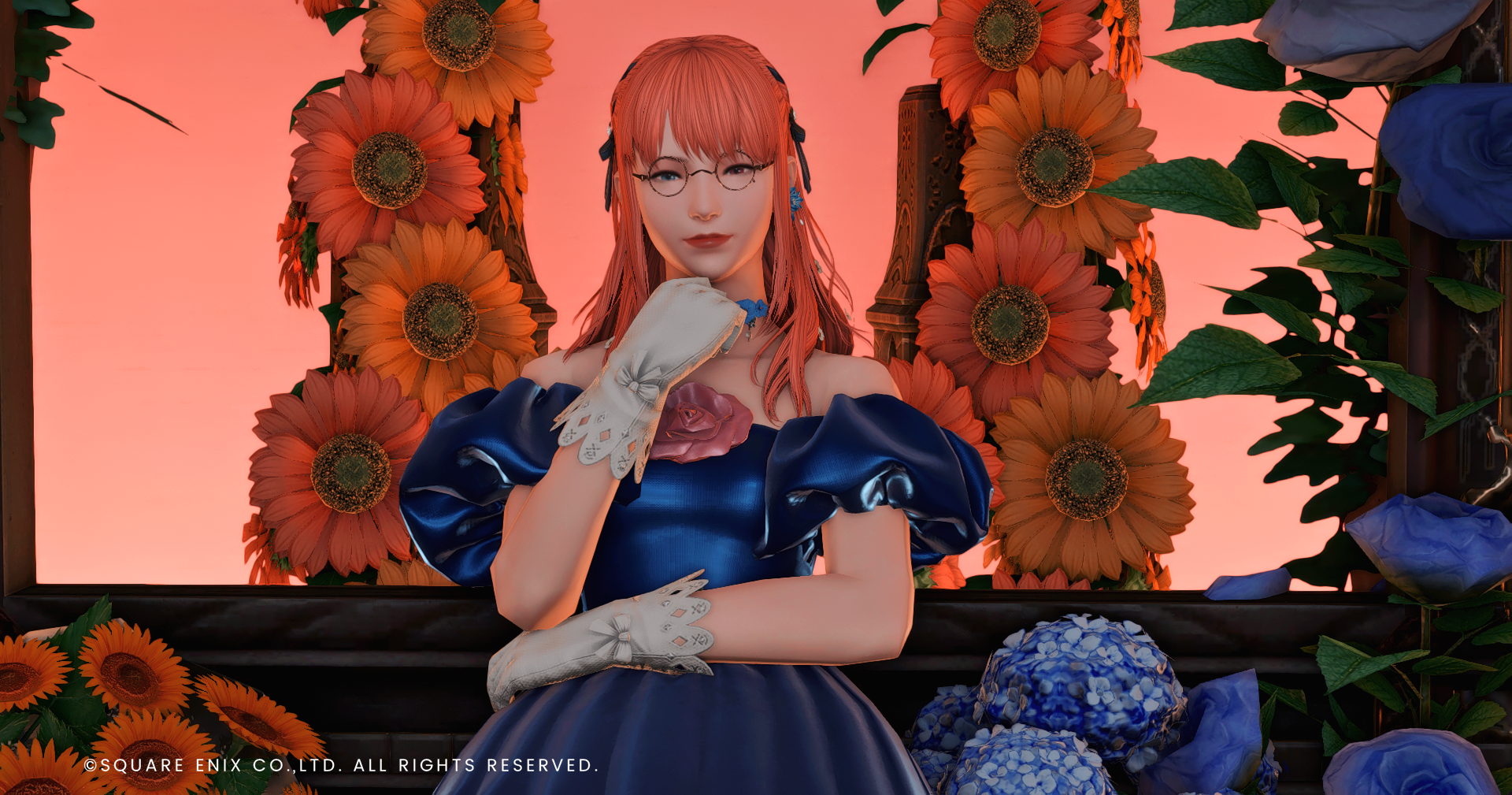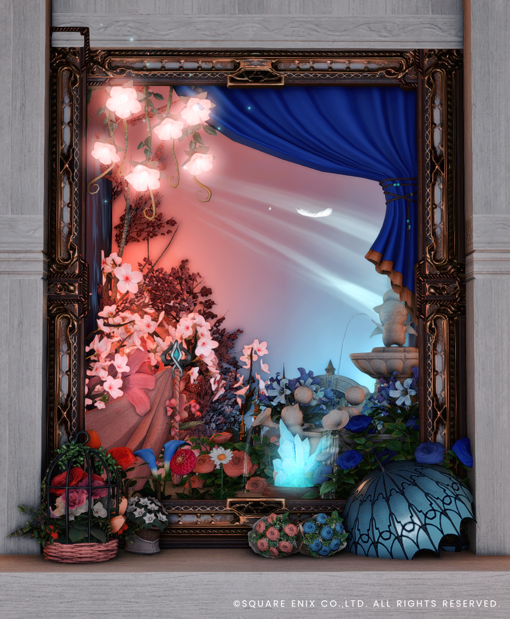 「2」ー フレームの前に座りことができます。後ろに立つか、前に座るかは自分のキャラに調整してください。後ろの花をルガ族でも埋めます。小さい種族(メスラ、メスッテ、背が低いミドラン、ララフェル)はテーブルの上に立つのオススメします。