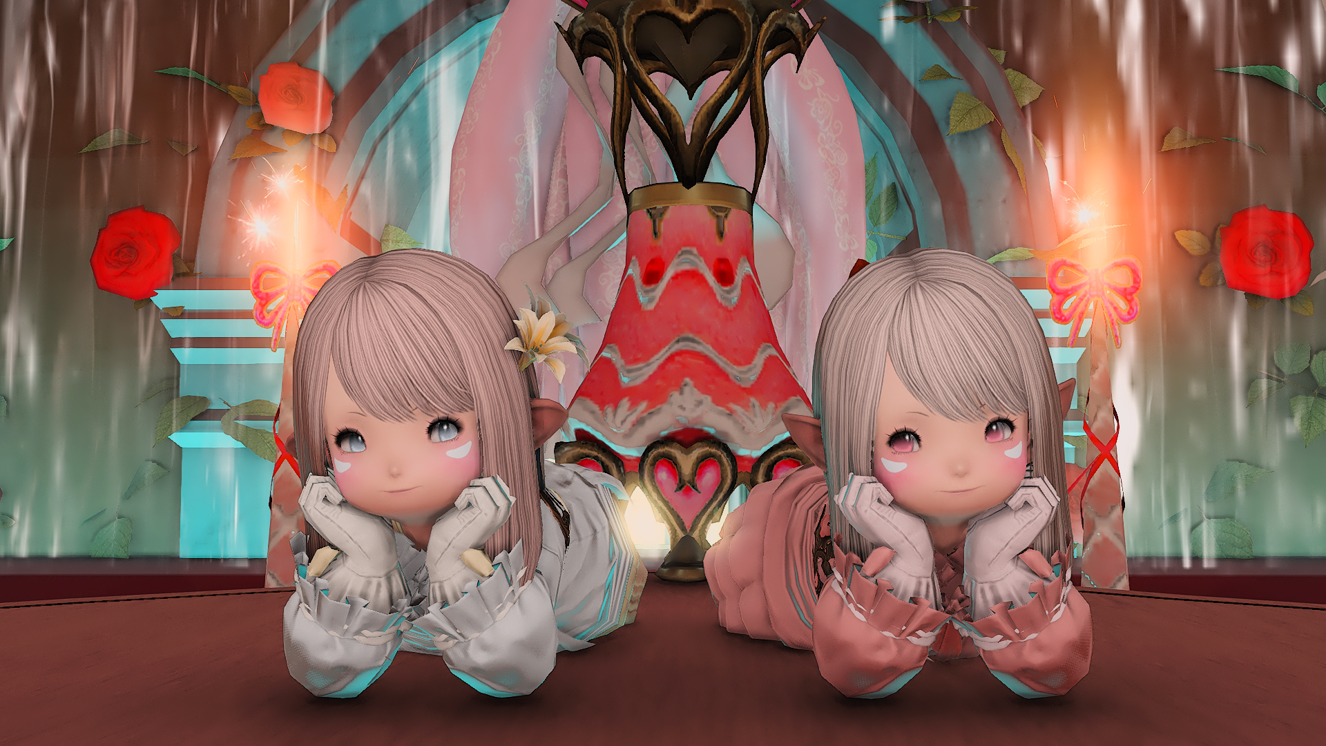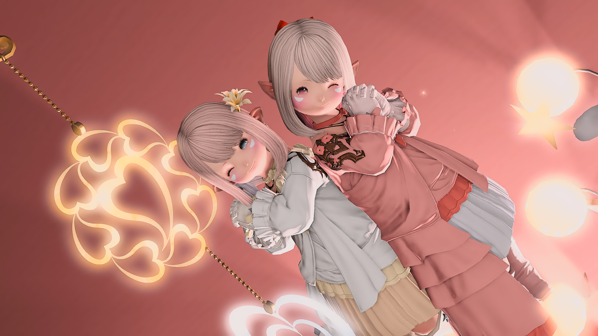 写真1枚目『With You&Me』 ララフェル最小サイズ同士であれば、頭ごっつんこ、見つめあうことができます。居眠りは4人まで、座って複数人での撮影が可能です。特にモーグリランプ上での撮影がオススメです!