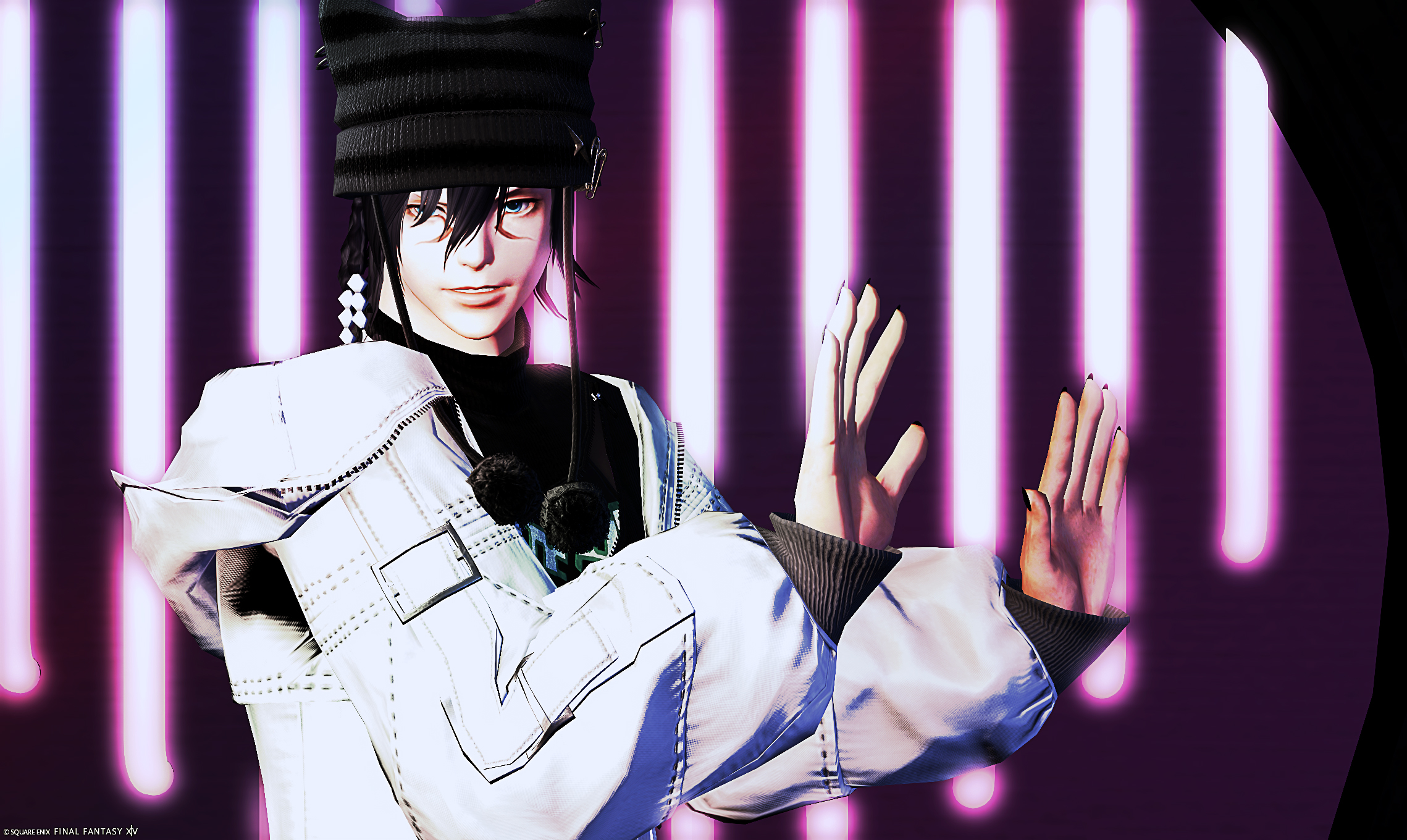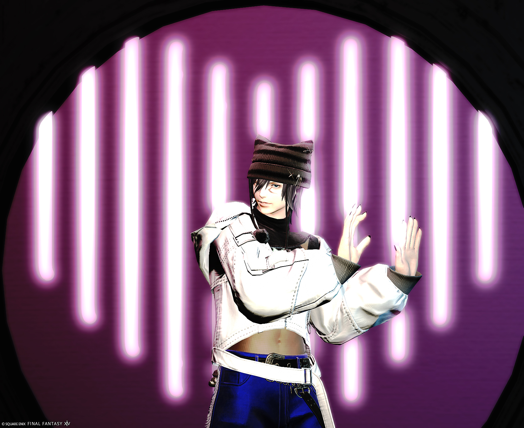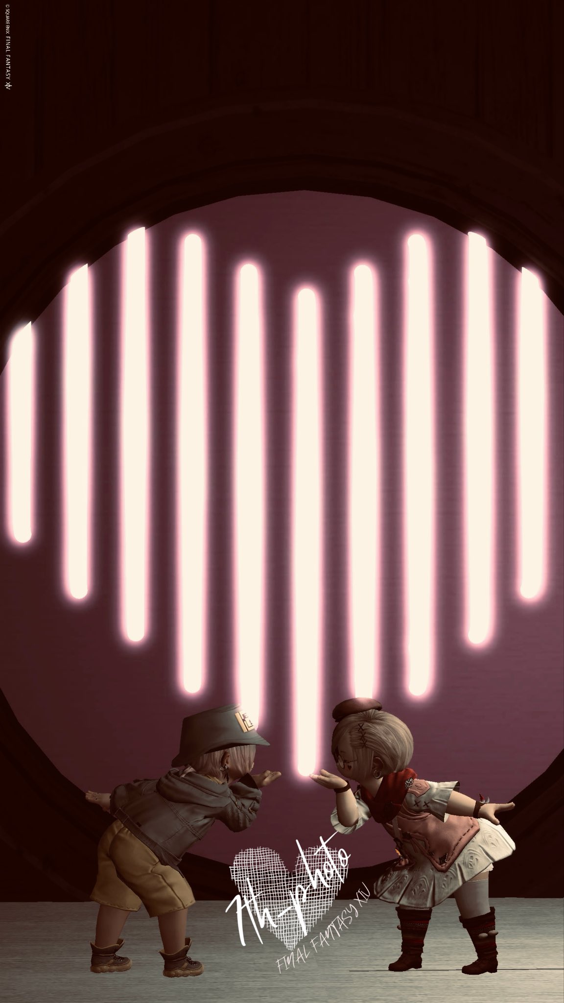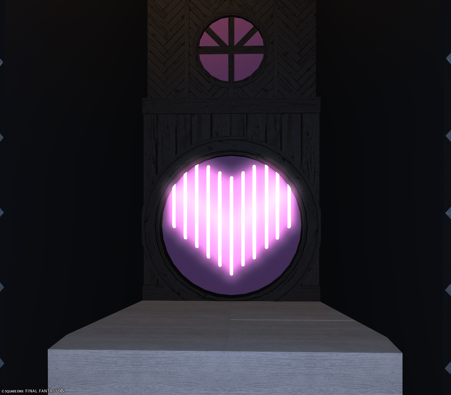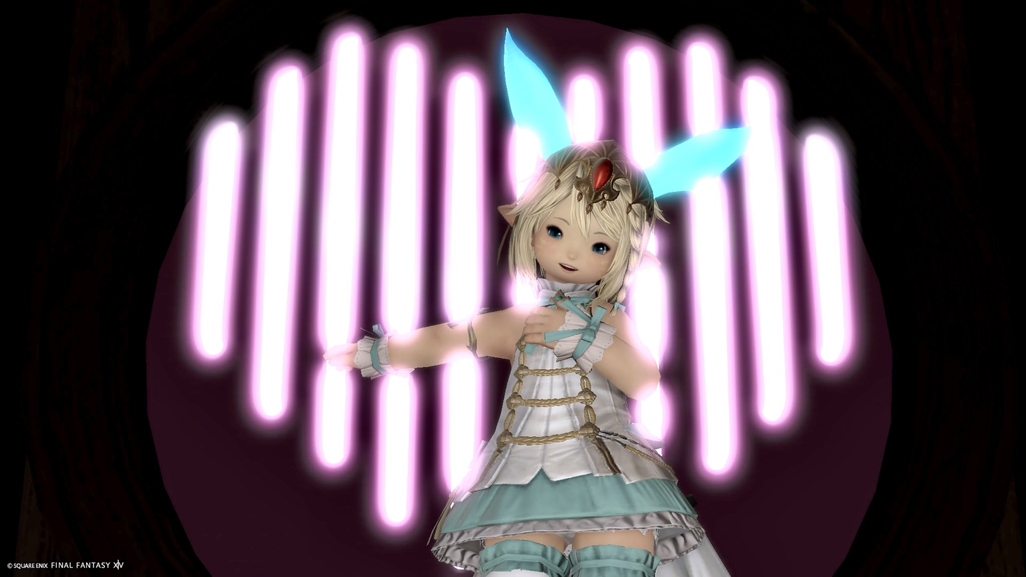 写真3:利用者様がかわいいアイドルになってくださいました!ネオンを幅広にふんわり撮るか、細くシャープに撮るかが全体の印象を左右します。カーバンクルブルーの耳がいいスパイスになるように、♡の大きさをやや小さく撮っています!ララフェルさんは足場ステージの手前に立つと、♡全体を入れられるよ!逆に背の高い種族の方は、なるべく♡の近くで撮ってみてね!