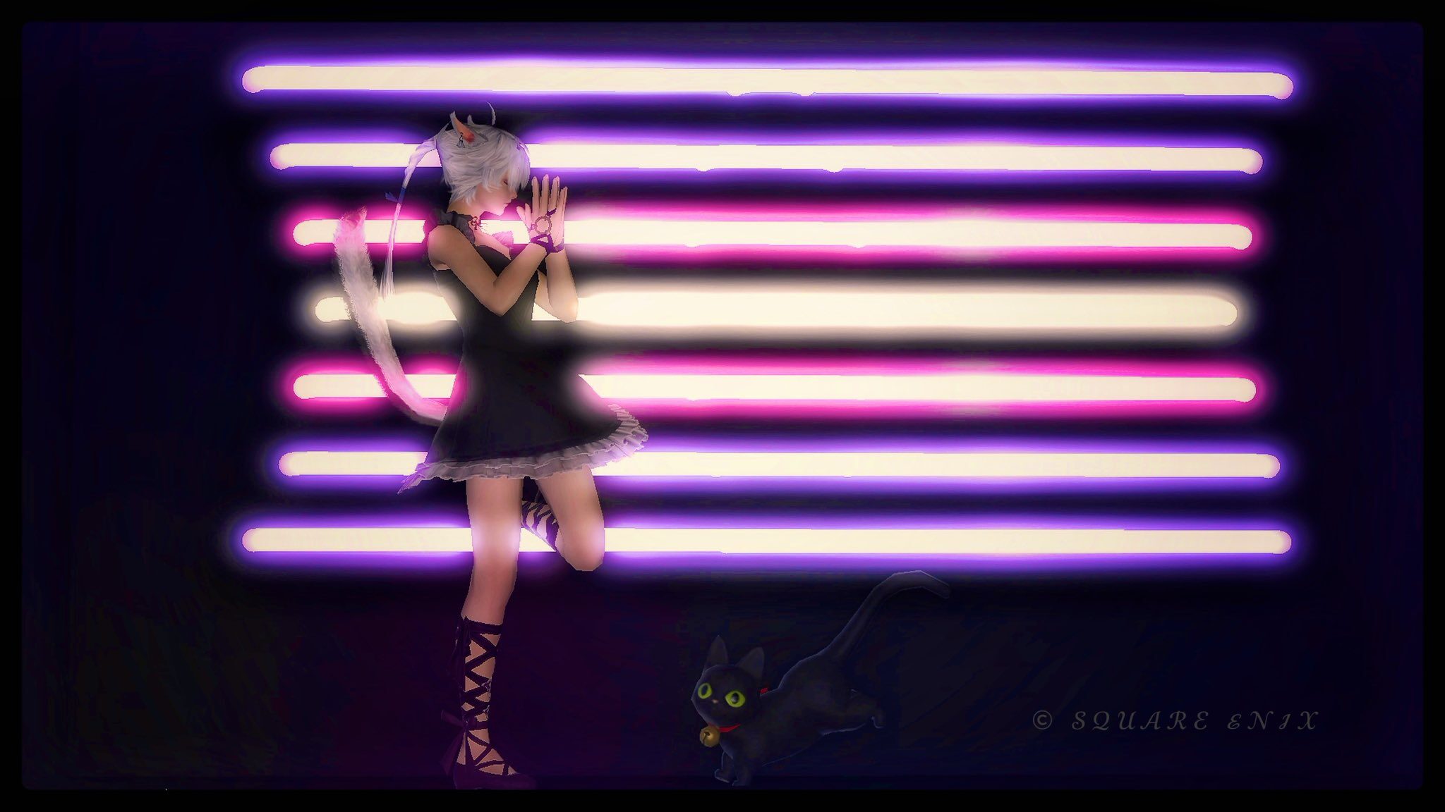 写真1枚目:利用者様がネオンを鮮やかな色味で撮影してくださいました!ネオンの前で映えるポーズと黒猫ちゃん、エスプリの効いたSSに魅了されます!