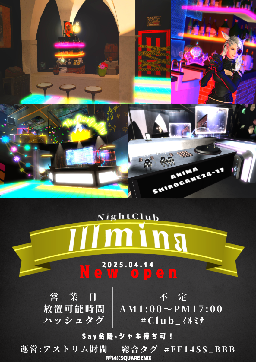 B.B.B-Illmina- by まくも(||BR||)🌐Mana / Anima(||BR||)📍シロガネ24区17番(||BR||)スタジオナイトクラブオープン💃(||BR||)お立ち台、DJブース完備。(||BR||)朝まで踊り明かそうぜ〜!(||BR||)会話.シャキ待ち.放置〇(||BR||)放置可能時間AM1〜PM5まで。(||BR||)お店用タグ #Club_イルミナ(||BR||)#アストリム家(||BR||)https://studio-xiv.com/studio/76024/