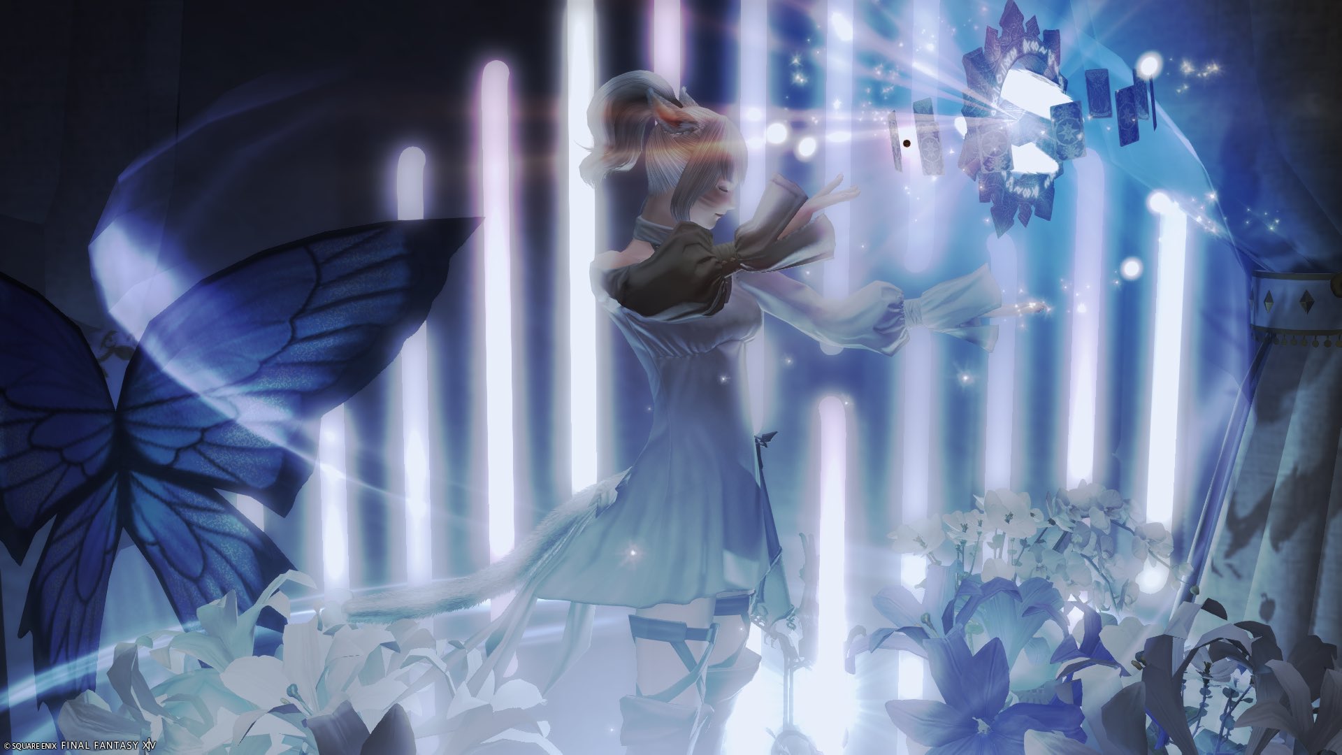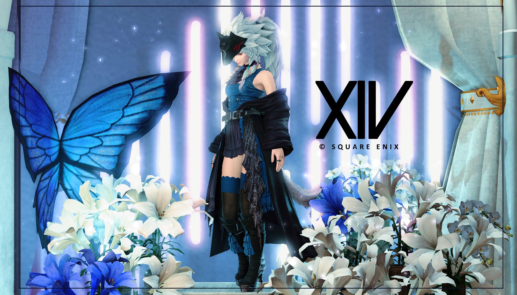 画像6:利用者様作品です。シルエットの端正さ、蝶の羽の青から逆光のドレスに連なる青色、手前の花弁の透ける風合い、静かな美の哲学を感じる一枚です。ネオンの光によってほんの少し顔が照らされているところが、このブースの特性を生かして撮っていただいた証左で、僕は感動します。