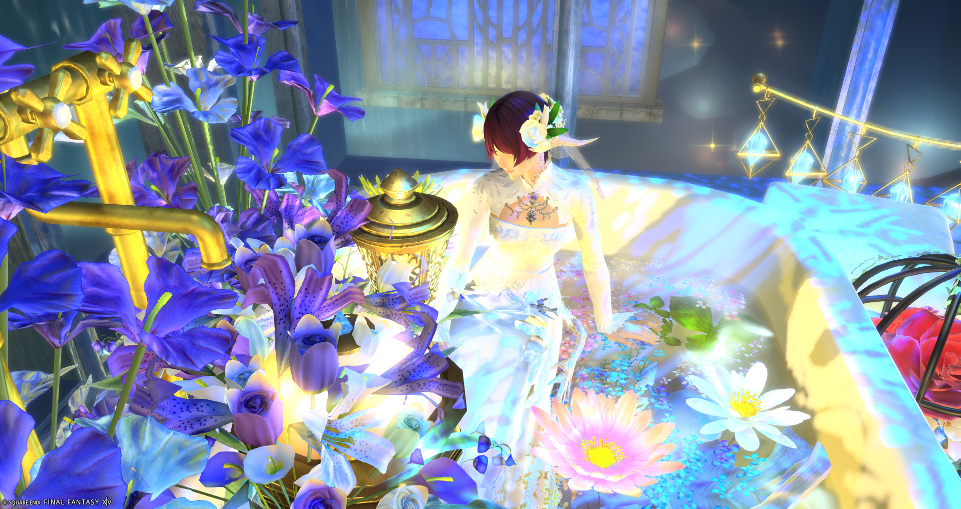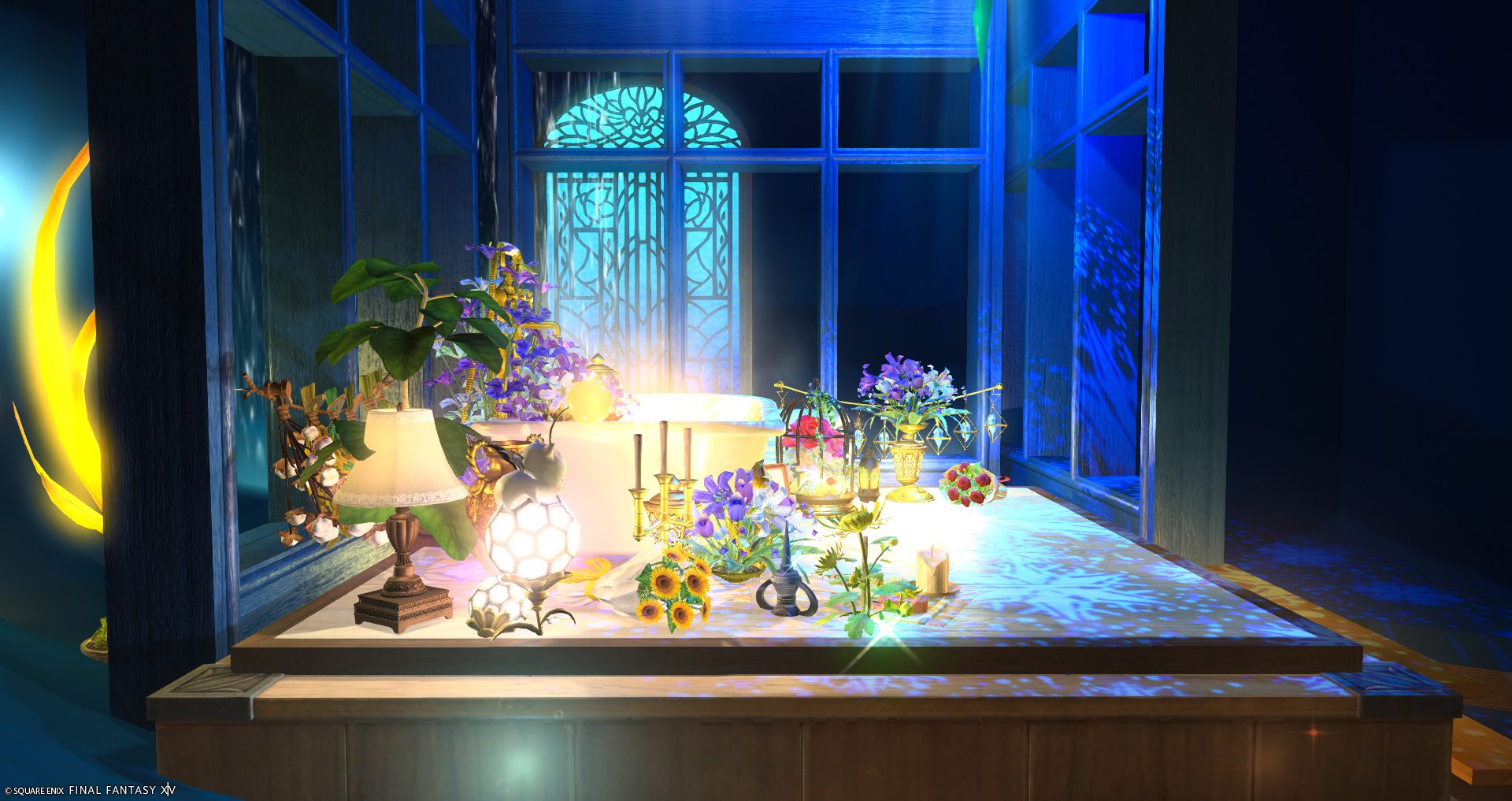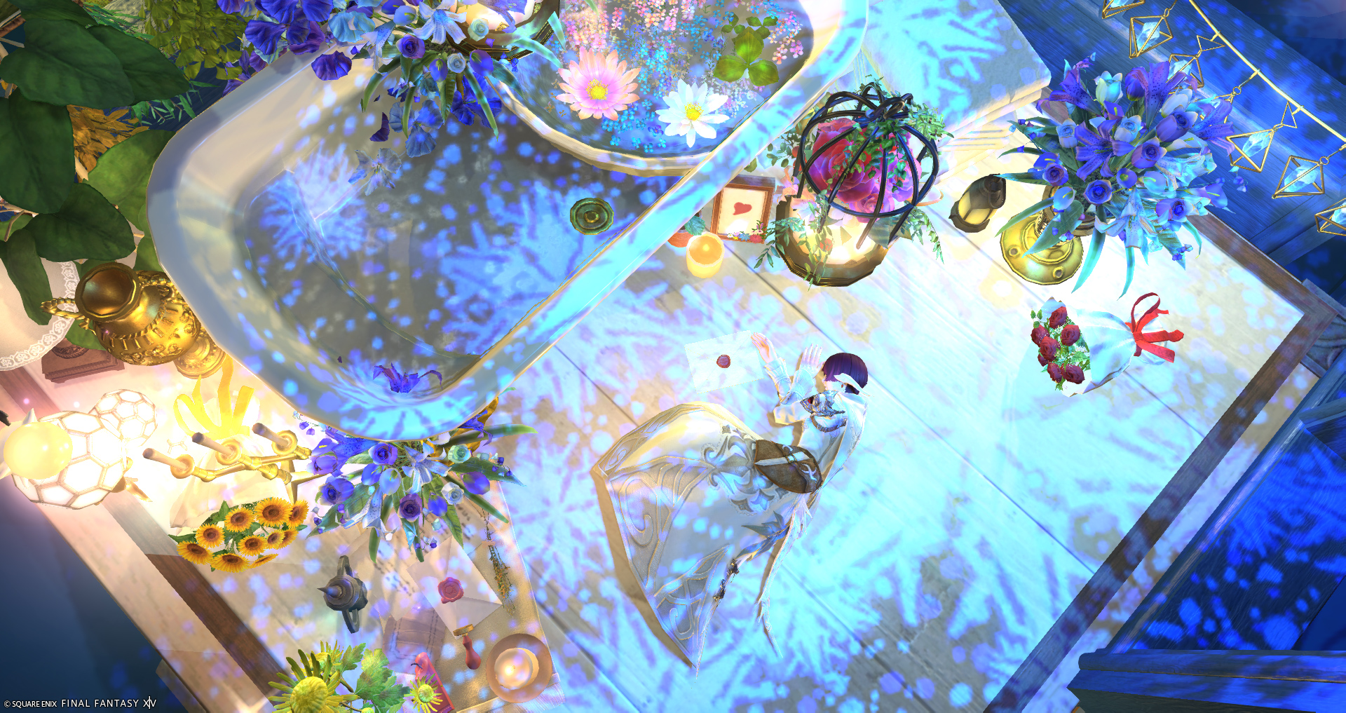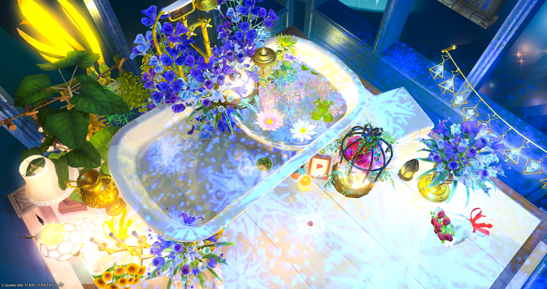 「月明かりと花の灯りが、静かな夜のバスルームを包み込む。