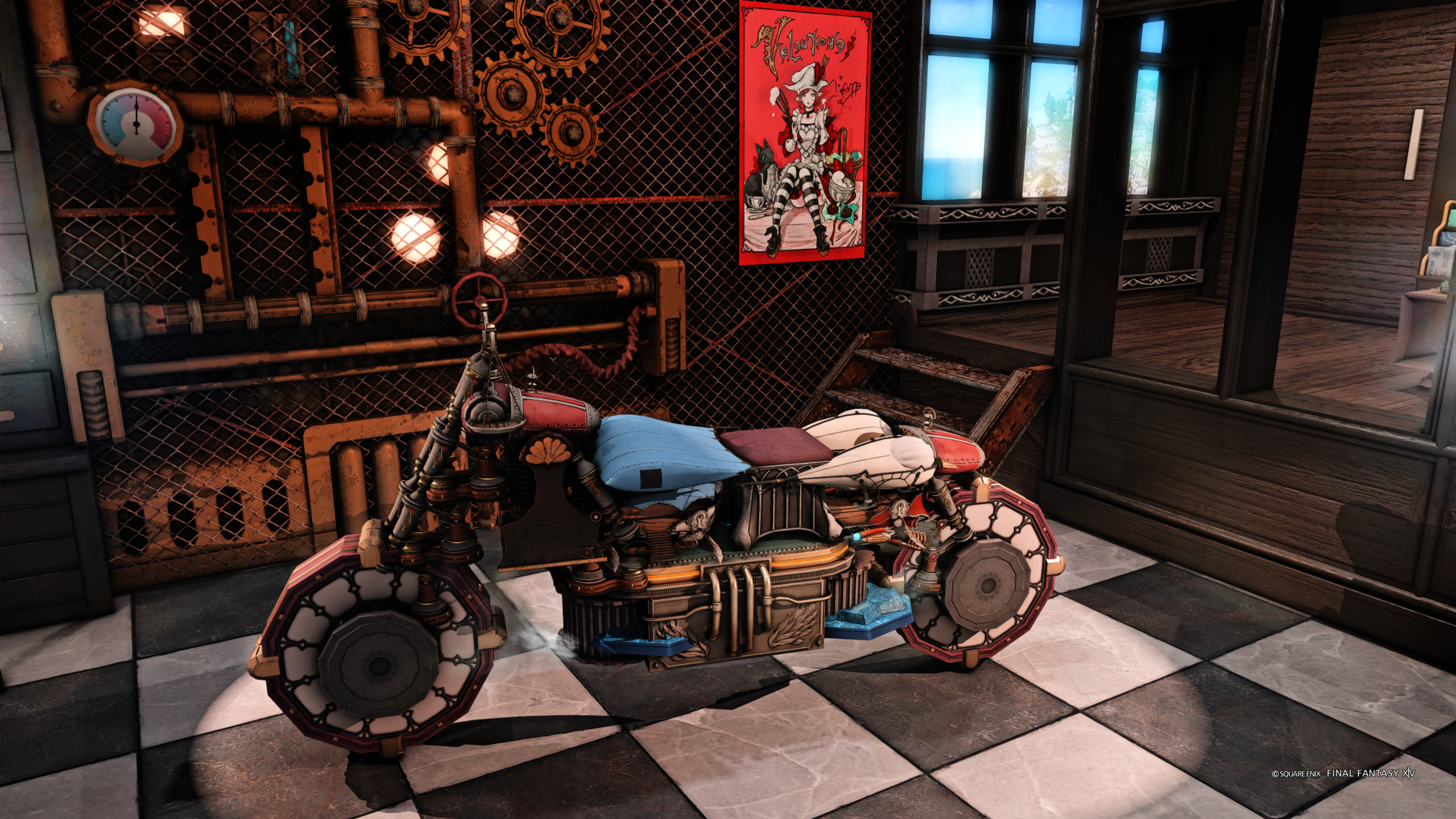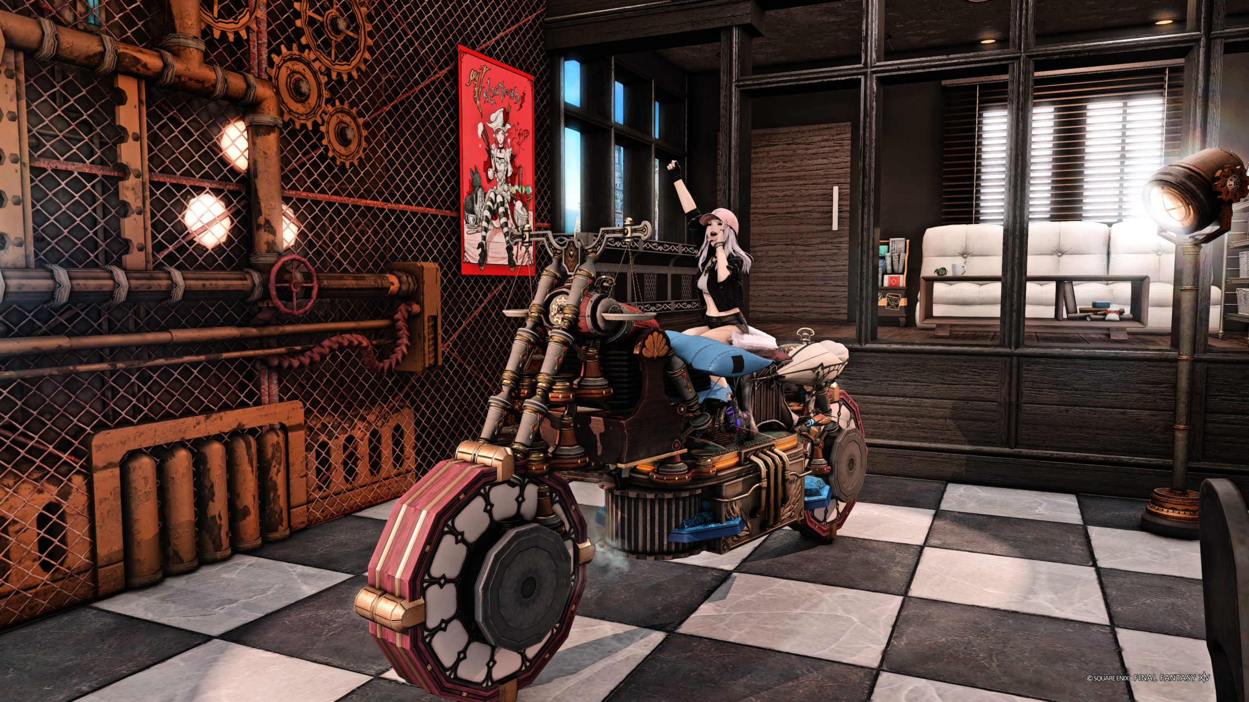 バイクは一人乗り用で紫の部分に立ってから椅子に座るをすると、画像のように座ることができます。