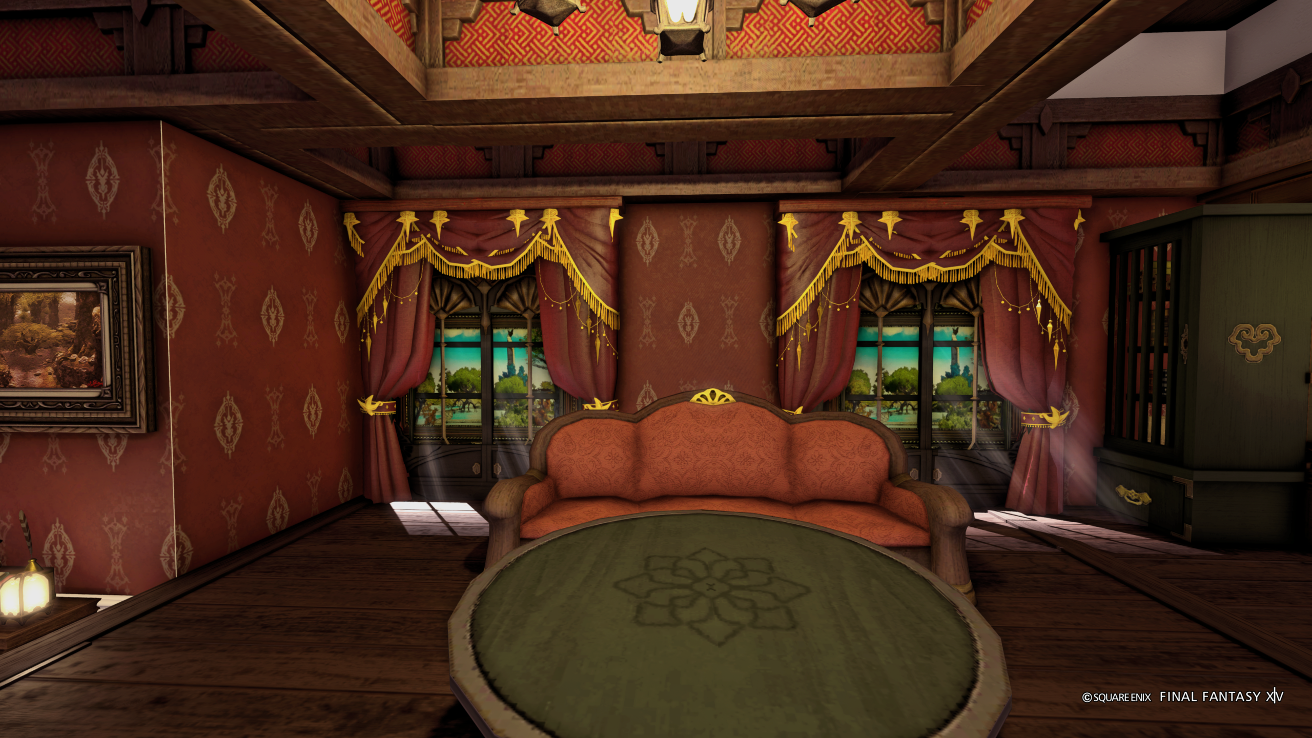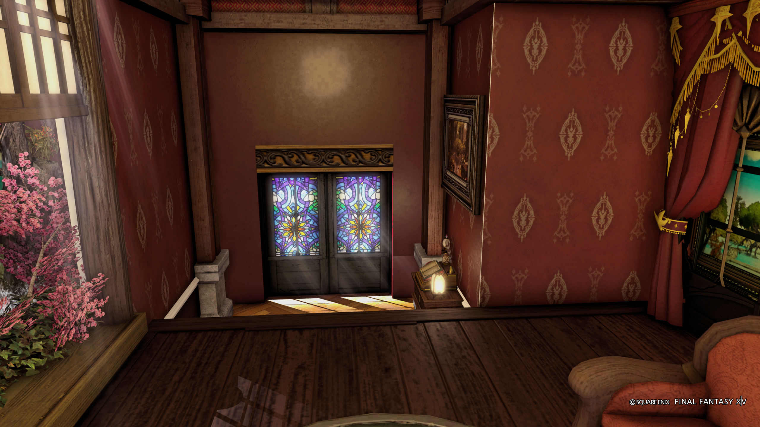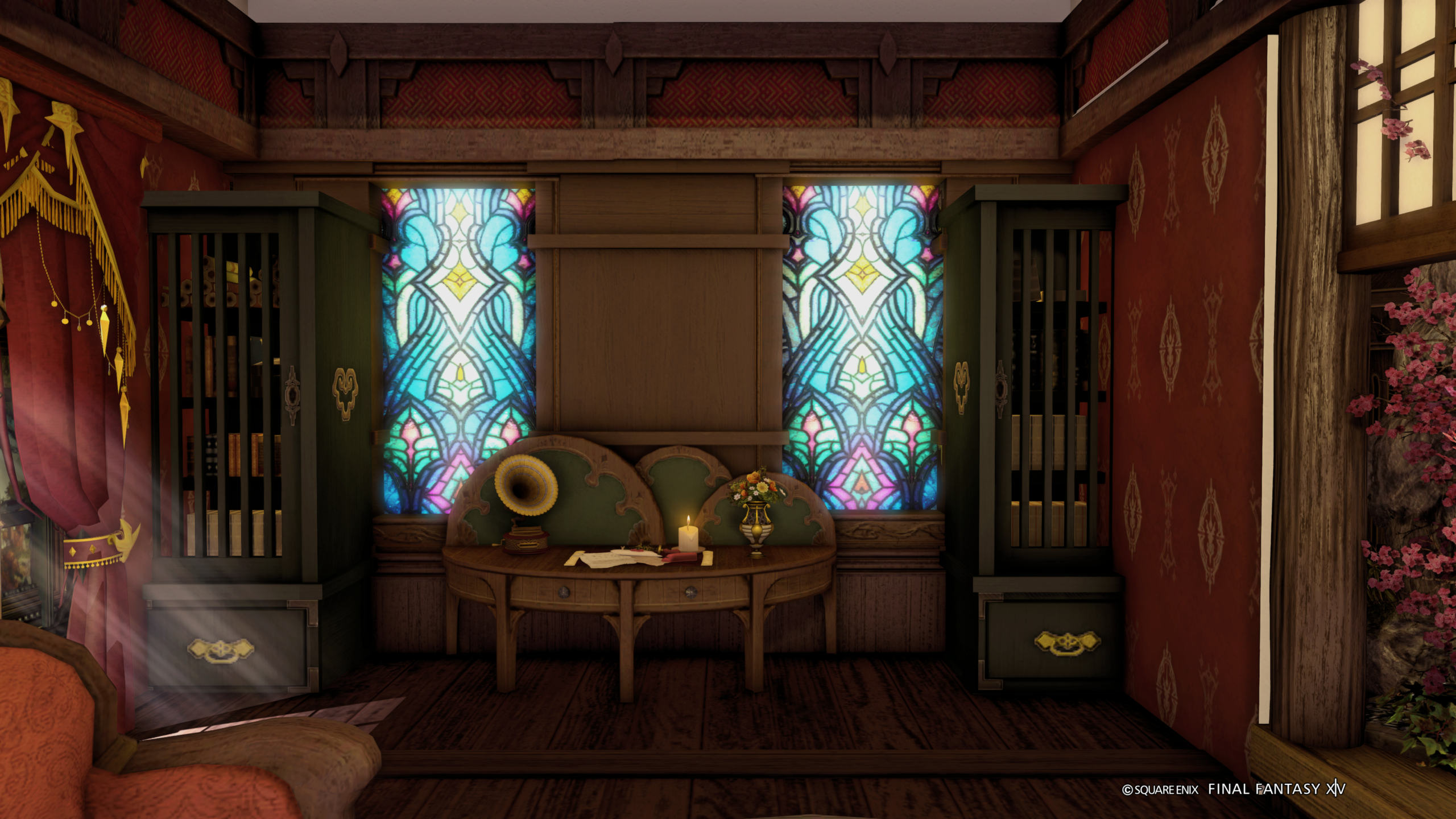 大正浪漫を意識してワインレッドの壁紙、ディープグリーンの窓でお部屋を作成しました!