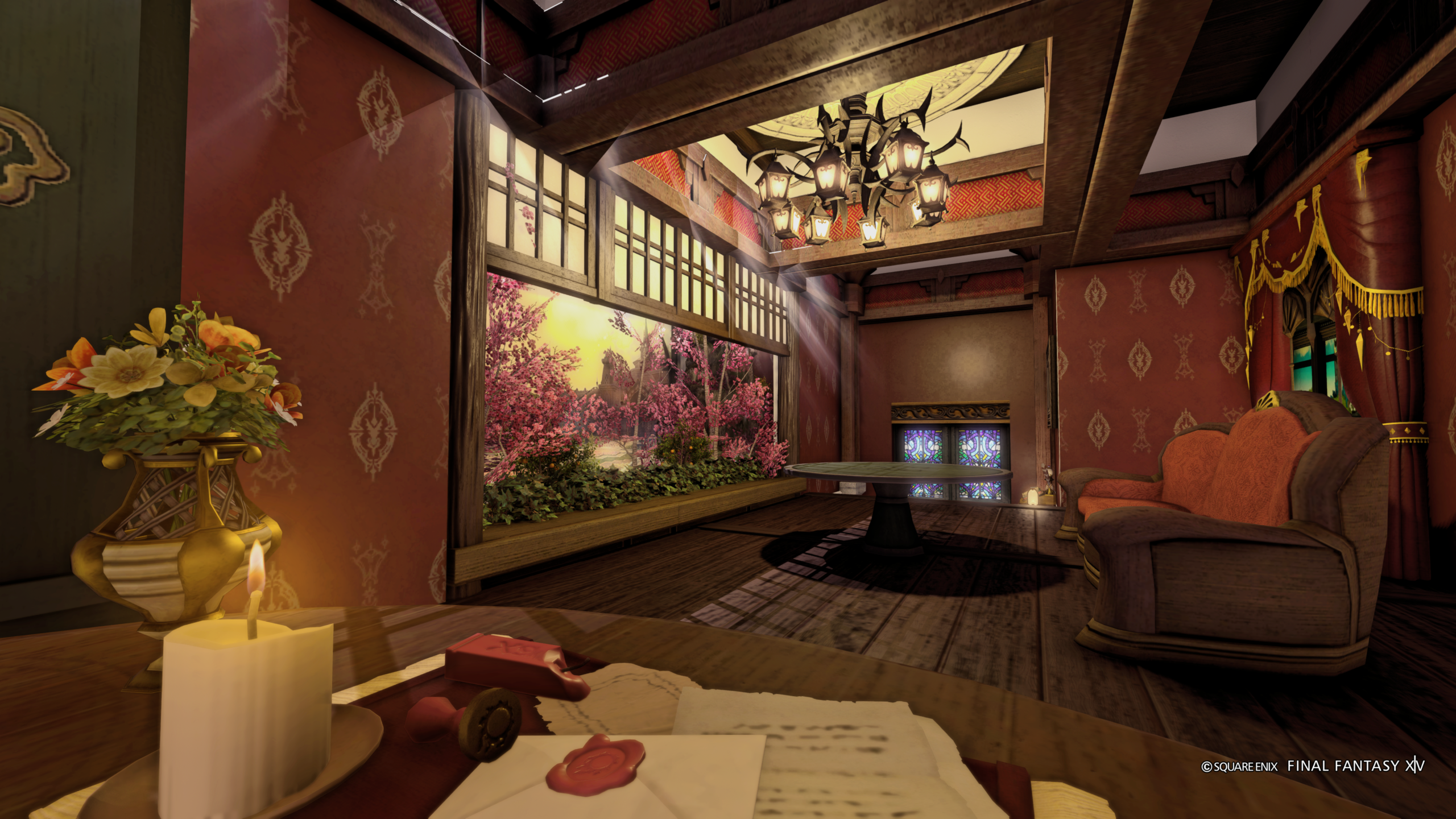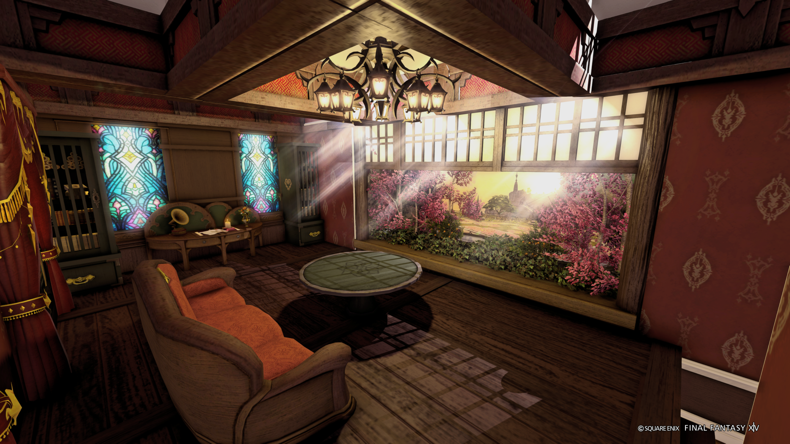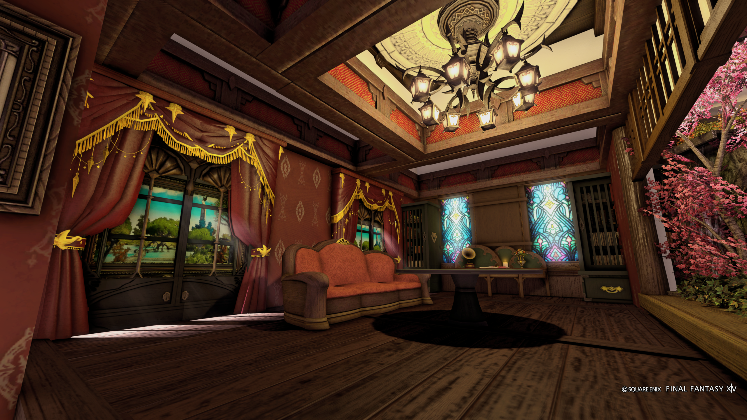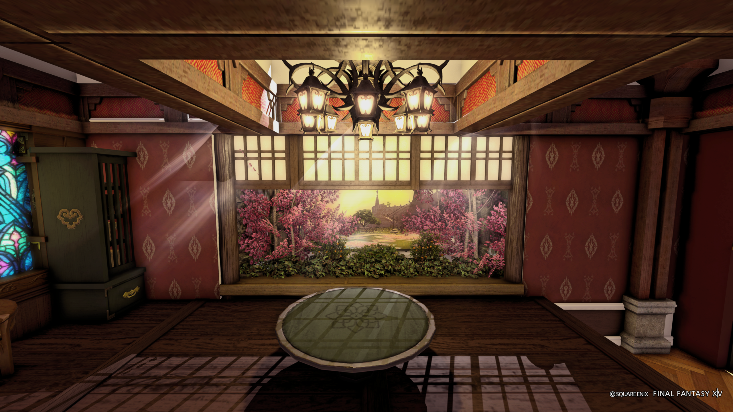 大正浪漫を意識してワインレッドの壁紙、ディープグリーンの窓でお部屋を作成しました!