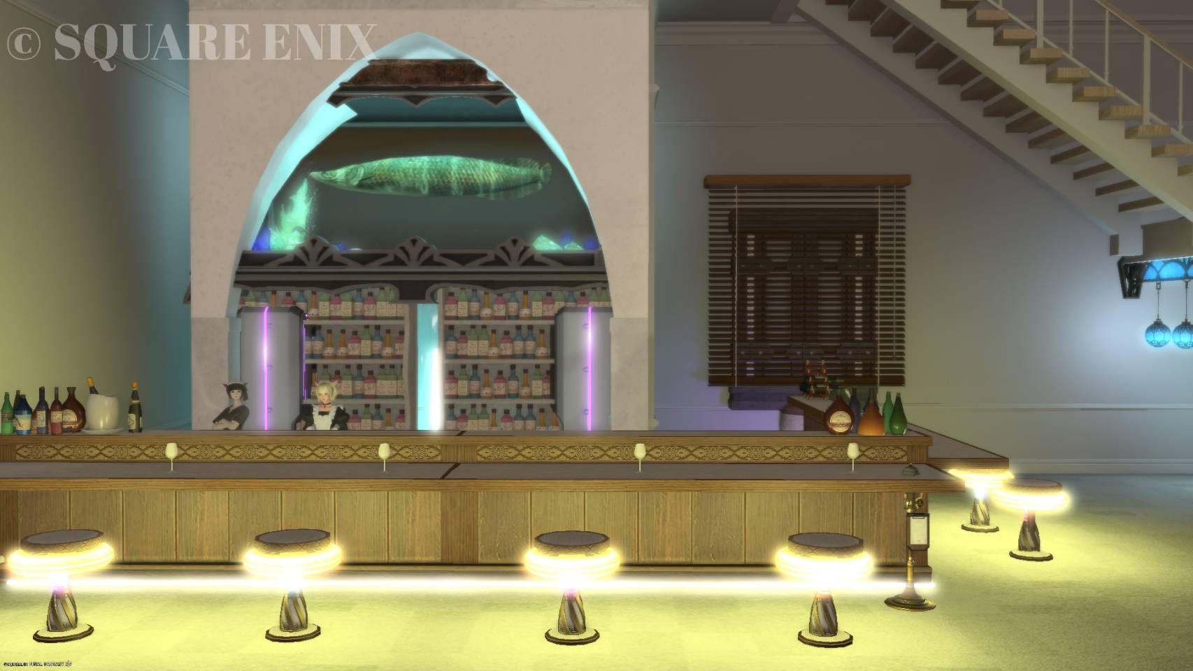 1Fも大幅にリニューアルしました。ネオンの照明と白基調のラウンジバーにリニューアル! もちろんピラルクが主役は健在です!