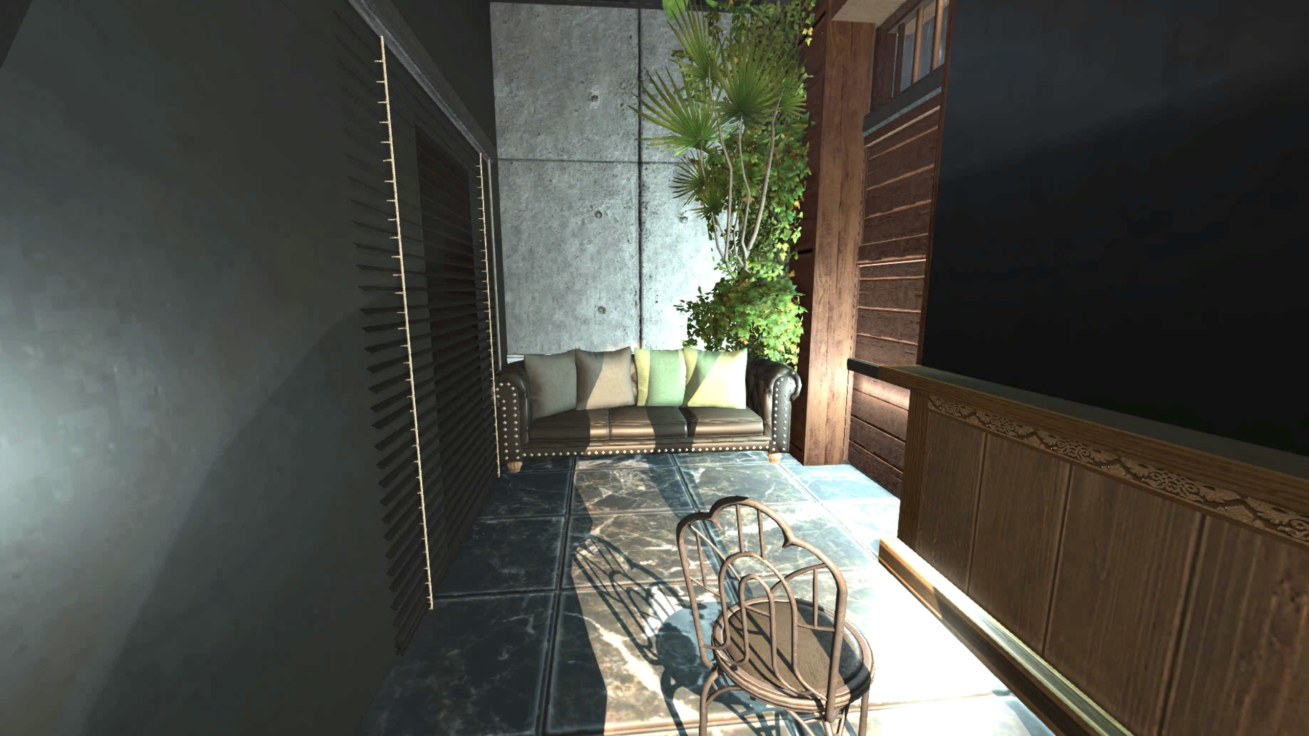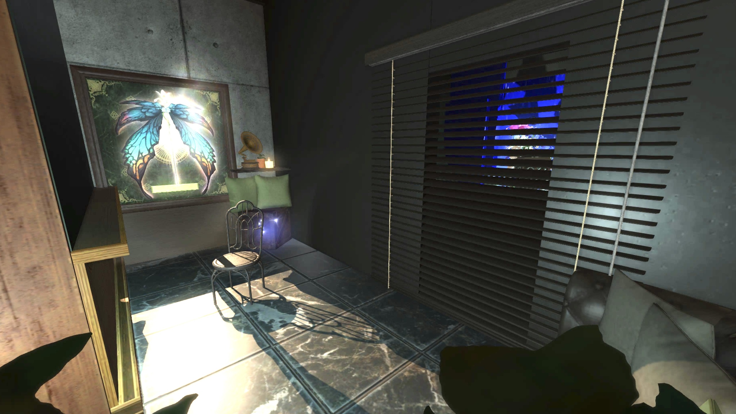 影絵のあるブラックと青基調の小さなブースです。室内は無音となっております。