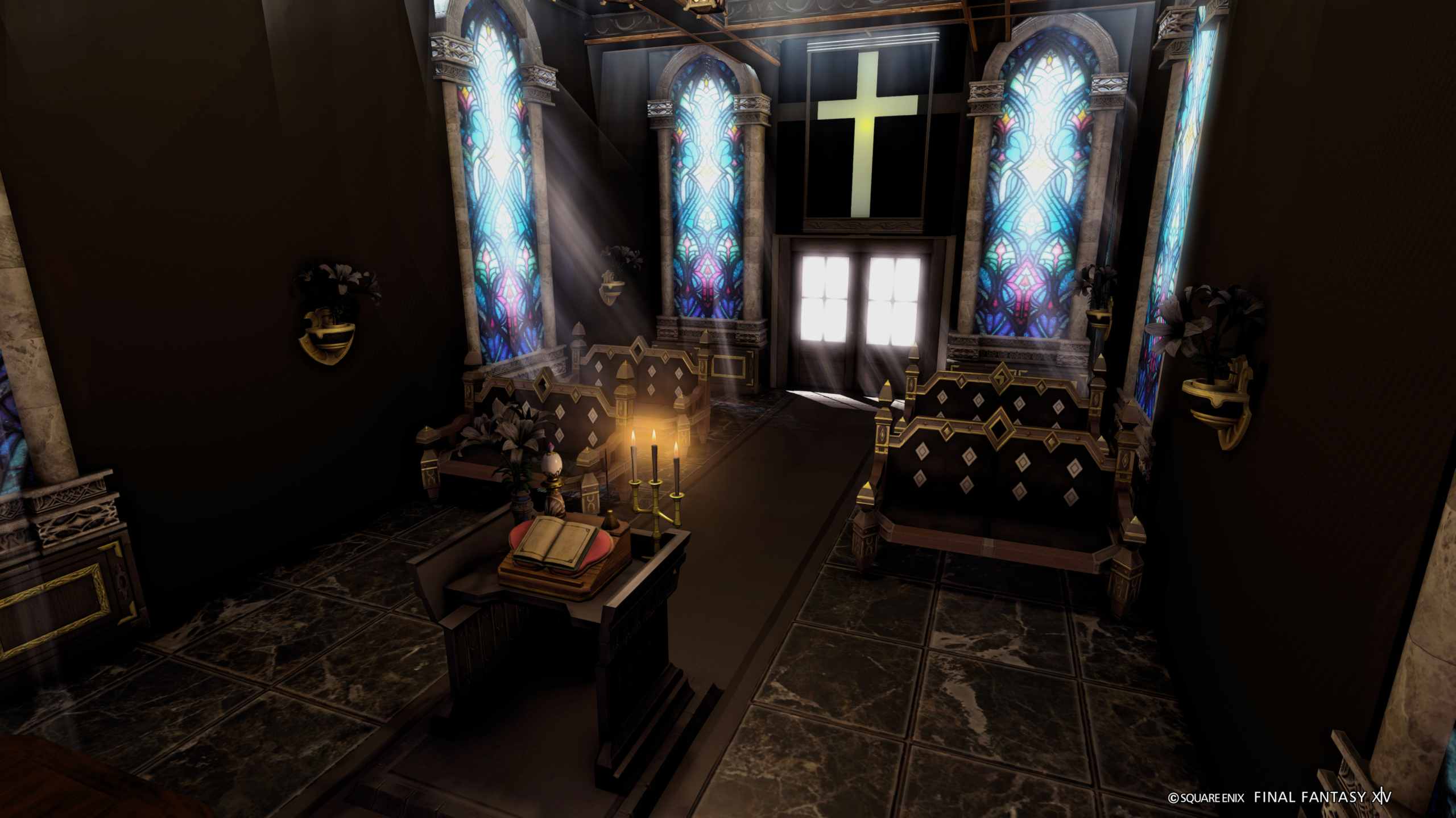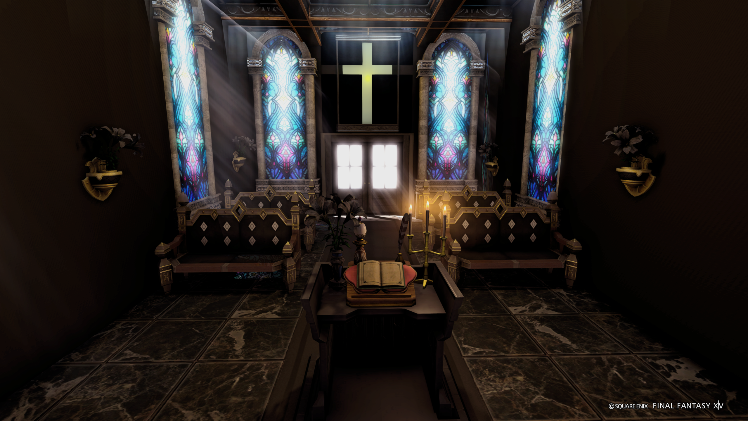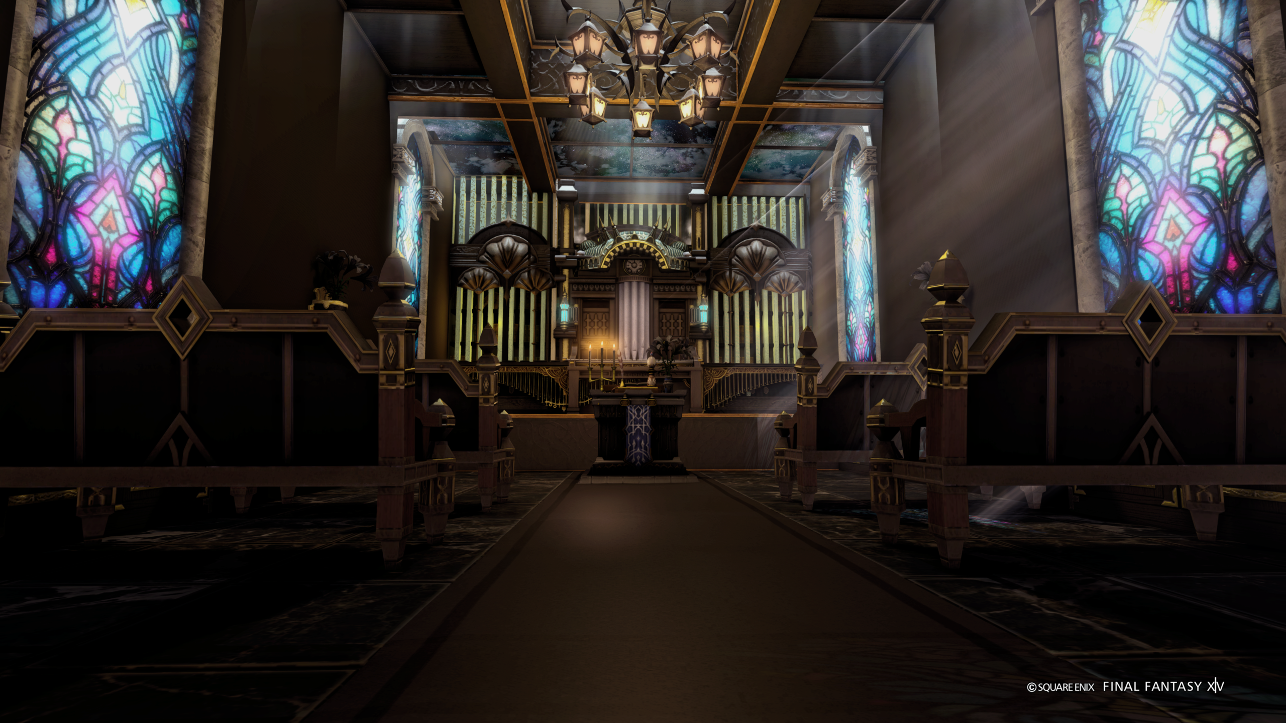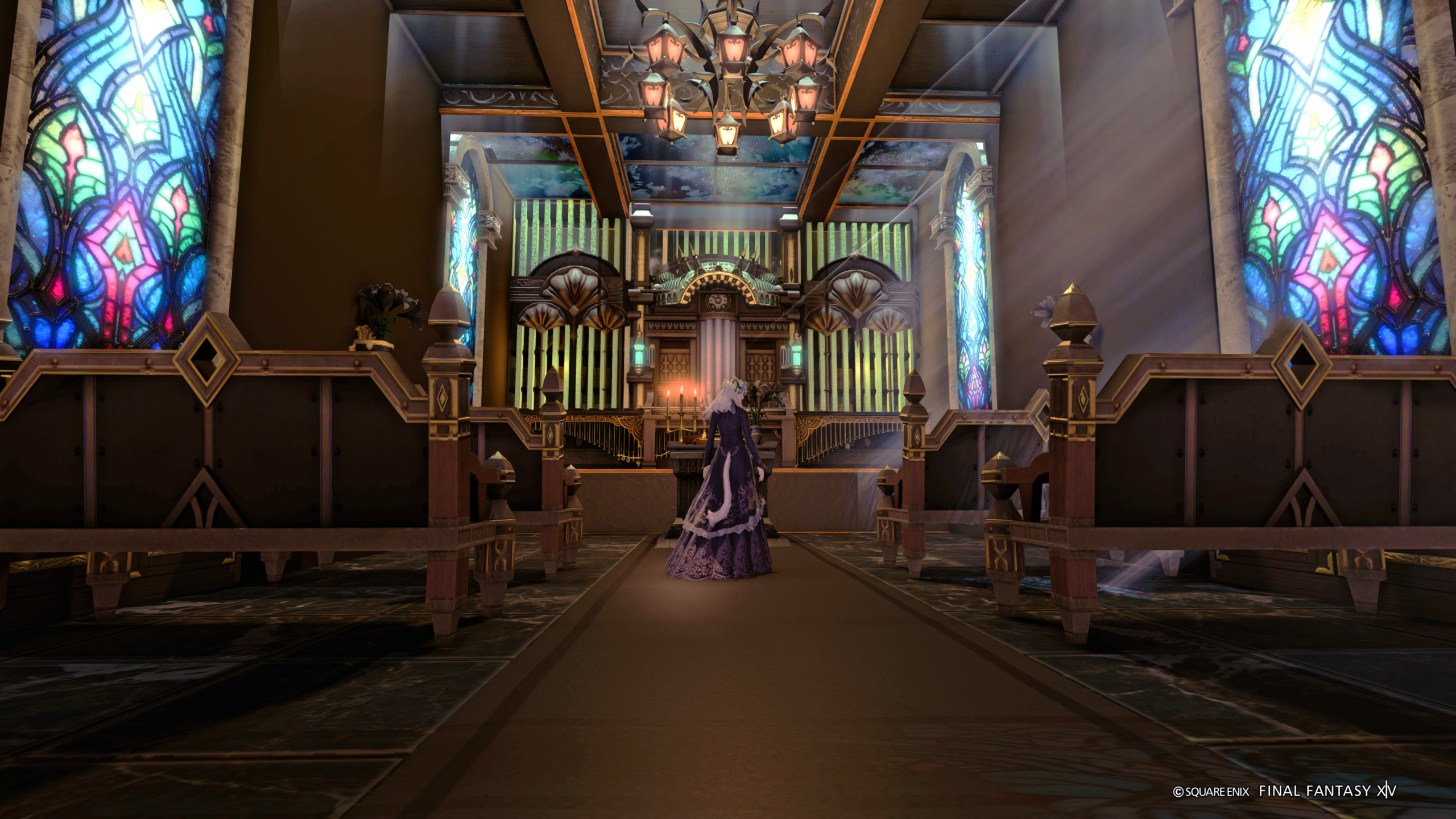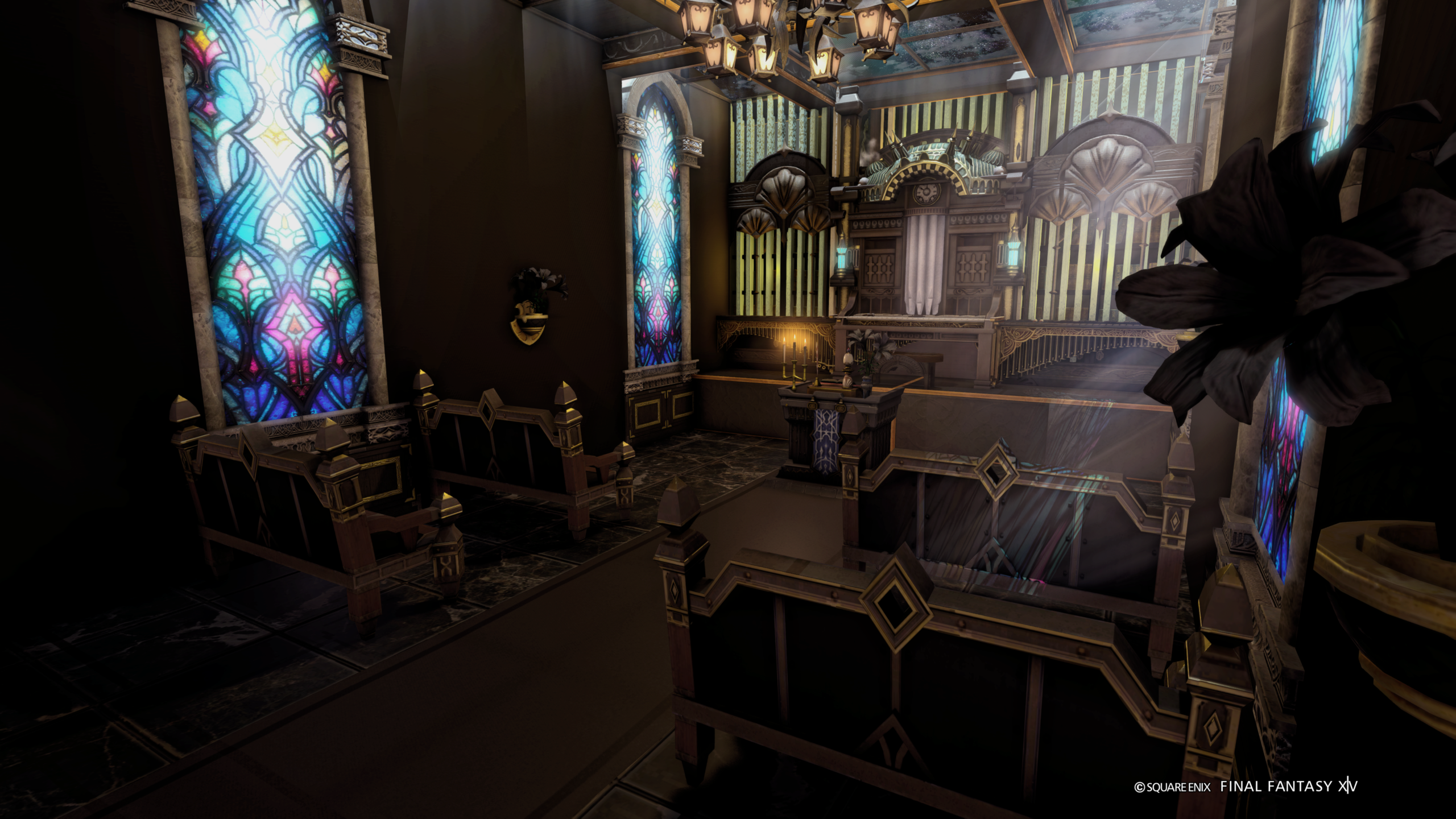 ステンドグラスと黒だけの色味、夜空のもとで奏でるパイプオルガンとシンプルな教会です。