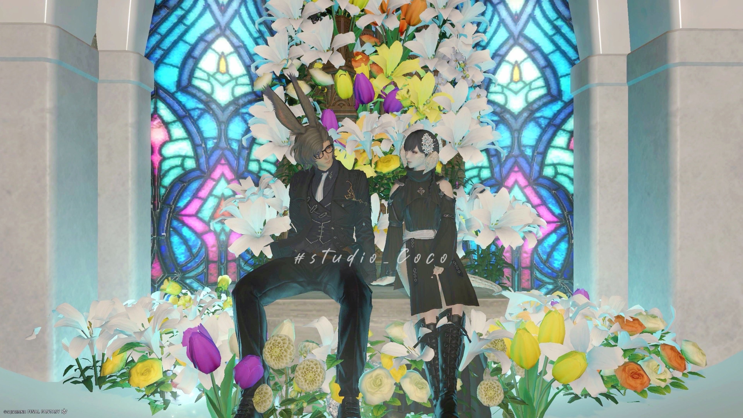 白のブースは真ん中の台座に2人、黒のブースはベンチと階段に座れます。