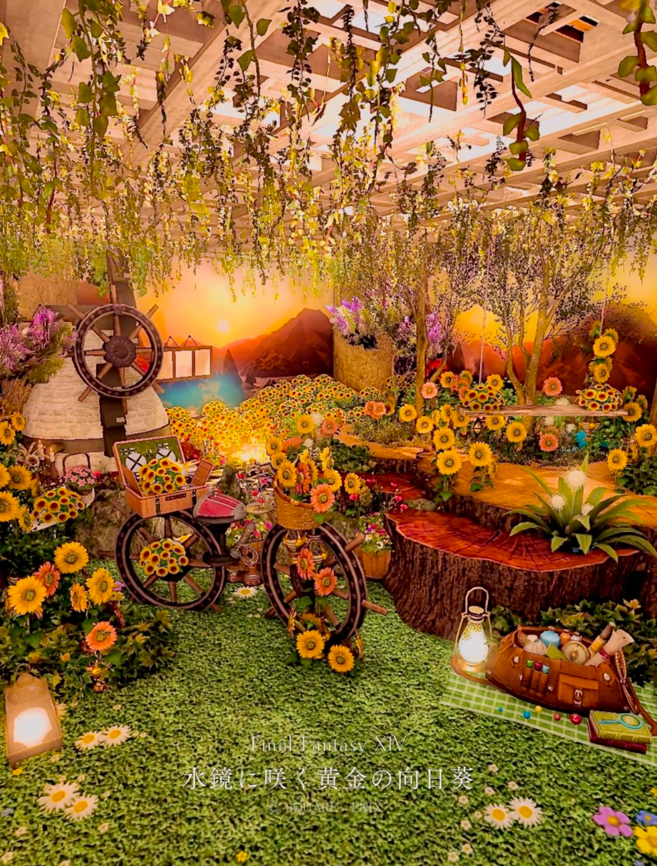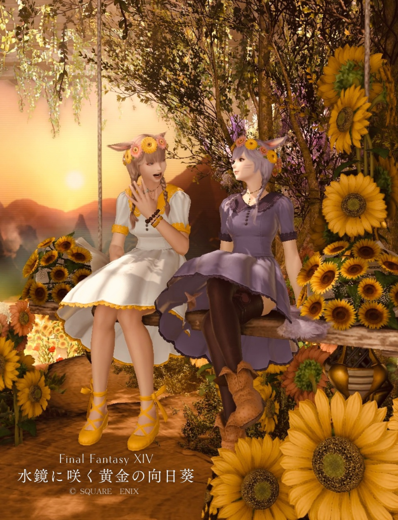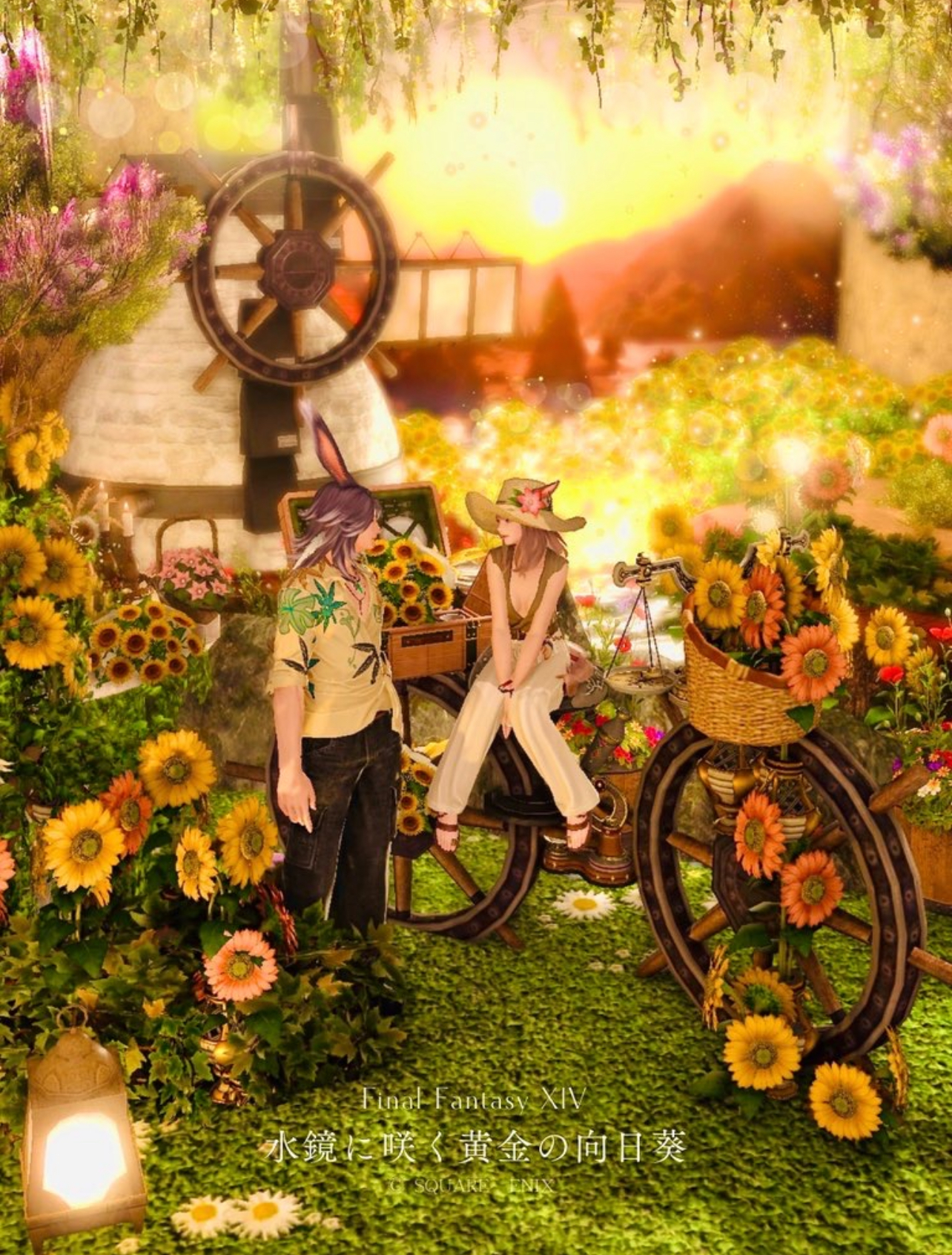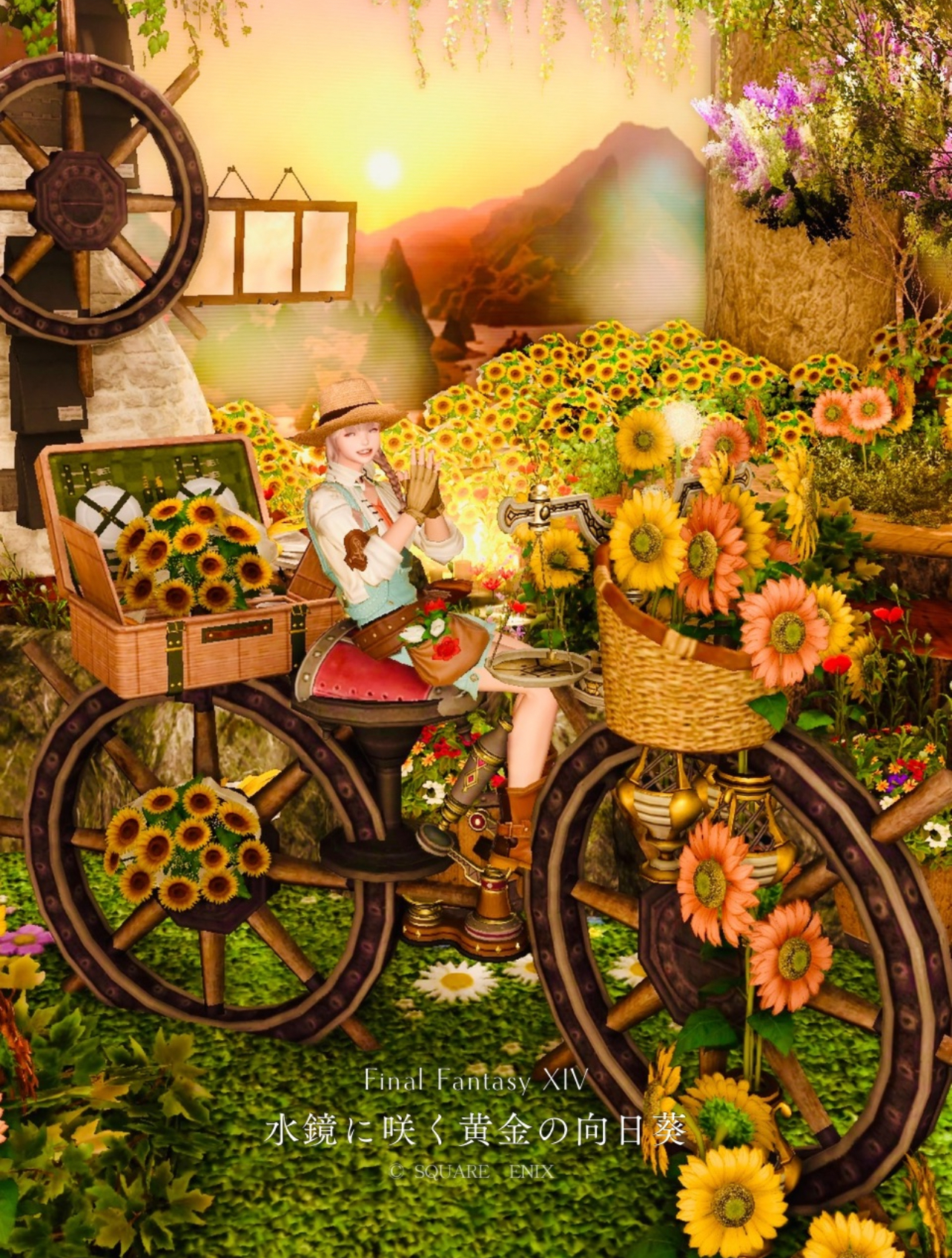 水鏡に咲く黄金の向日葵 by Kamiyu(||BR||)🌐Meteor / Yojimbo(||BR||)📍ゴブレットビュート16区47番(||BR||)夕日に染まる向日葵と水面の煌めきを表現したハウジングです。(||BR||)自転車やブランコに座ってお楽しみいただけます🚲♬.*゚(||BR||)撮影、訪問大歓迎です📸(||BR||)#HousingNoah(||BR||)https://studio-xiv.com/studio/80914/