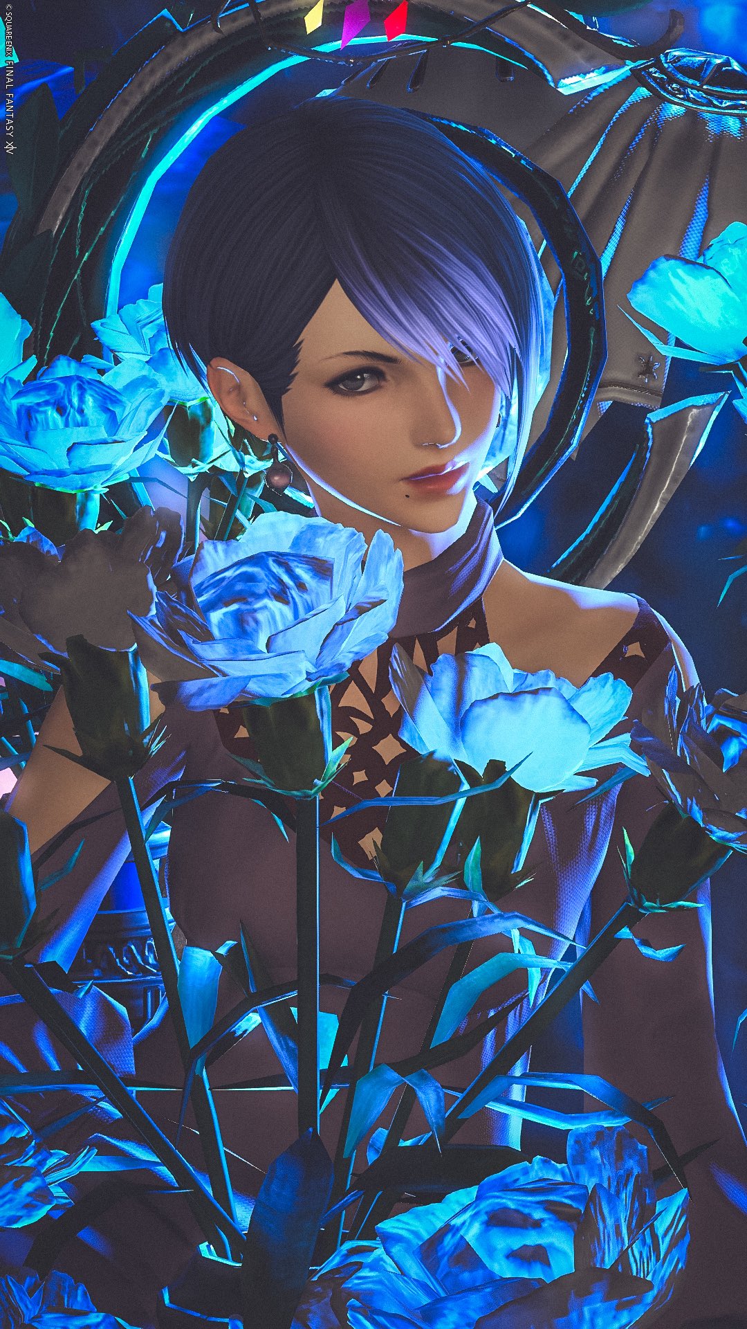 写真5:利用者様の傑作です!青い光のラインと透き通るカーネーションを呼応させたうえで、美しい表情の一瞬をリアルな色彩で切り取っています。ソリッドな輪郭がかっこよすぎる一枚…!もちろん髪色も変化していて、ただただ感涙です…