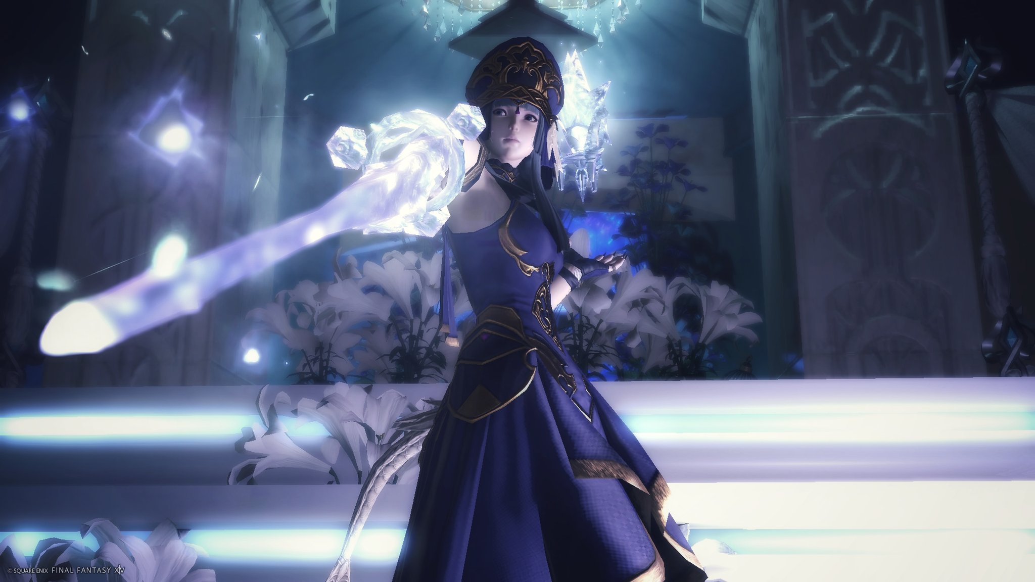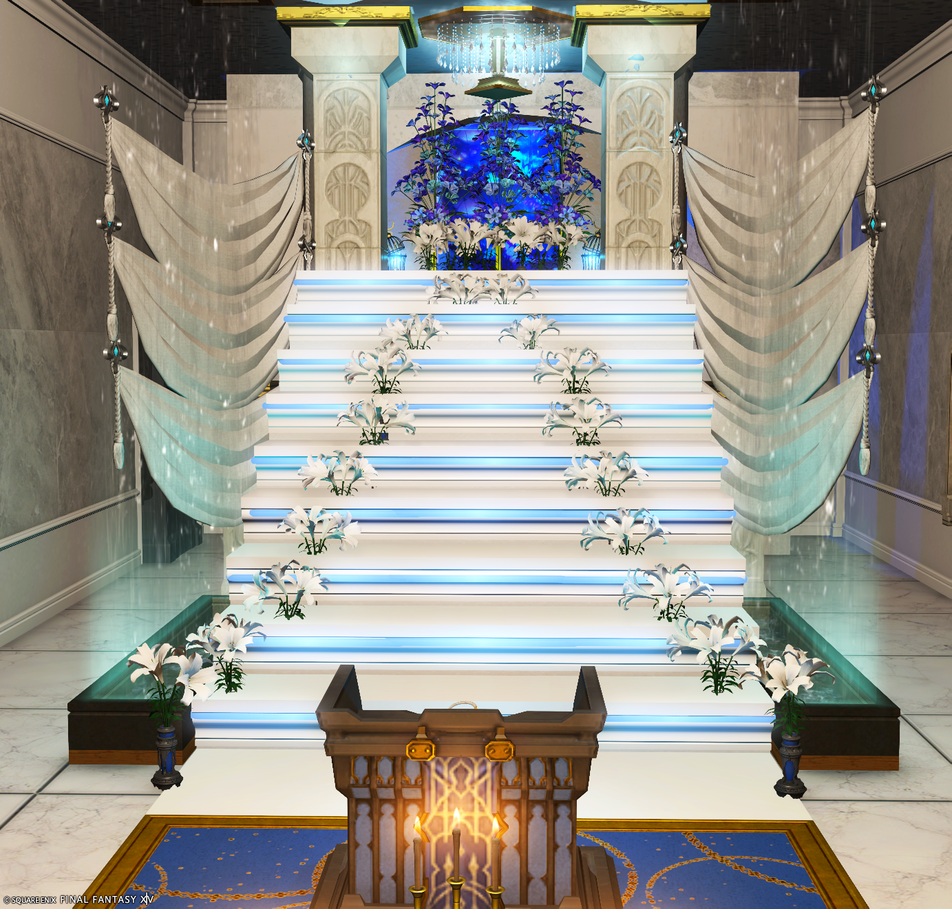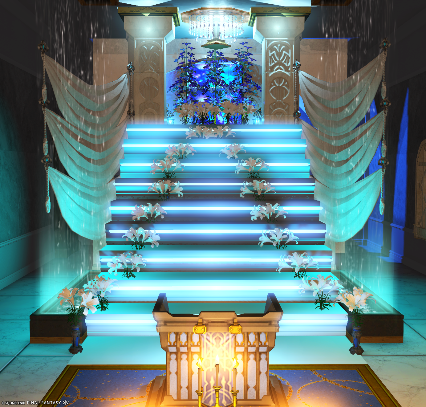 白い階段に淡い青のネオンで縁取りを…イメージカラーはシンデレラですが、教会ぽいです。