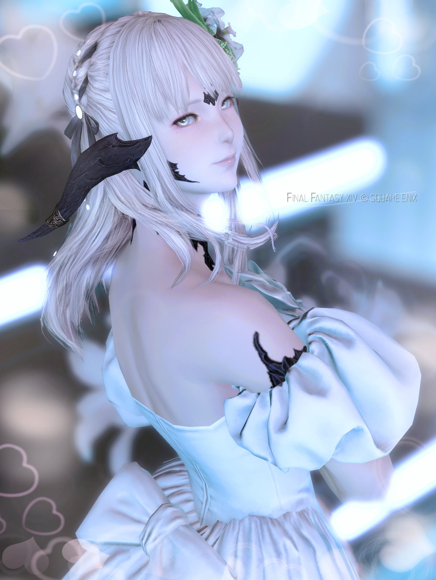 写真5枚目:階段とネオンをぼかして背景画面として用いた利用者様の作品です!薄青のネオンラインが華奢な首元を強調し、美しいドレスをまとった背中をロマンティックに惹きたてています…!おひとりで撮るときの参考に!