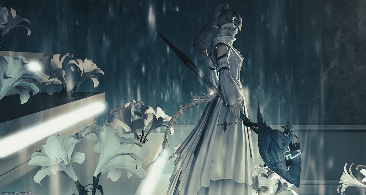 写真7枚目:両側のウォーターパーティションを雨に見立てて、追憶の中に佇む女性を利用者様が撮影してくださいました!繊細なライティングでキャラクターの輪郭を浮き上がらせながらも、表情を見せないことで物語性を高めています。
