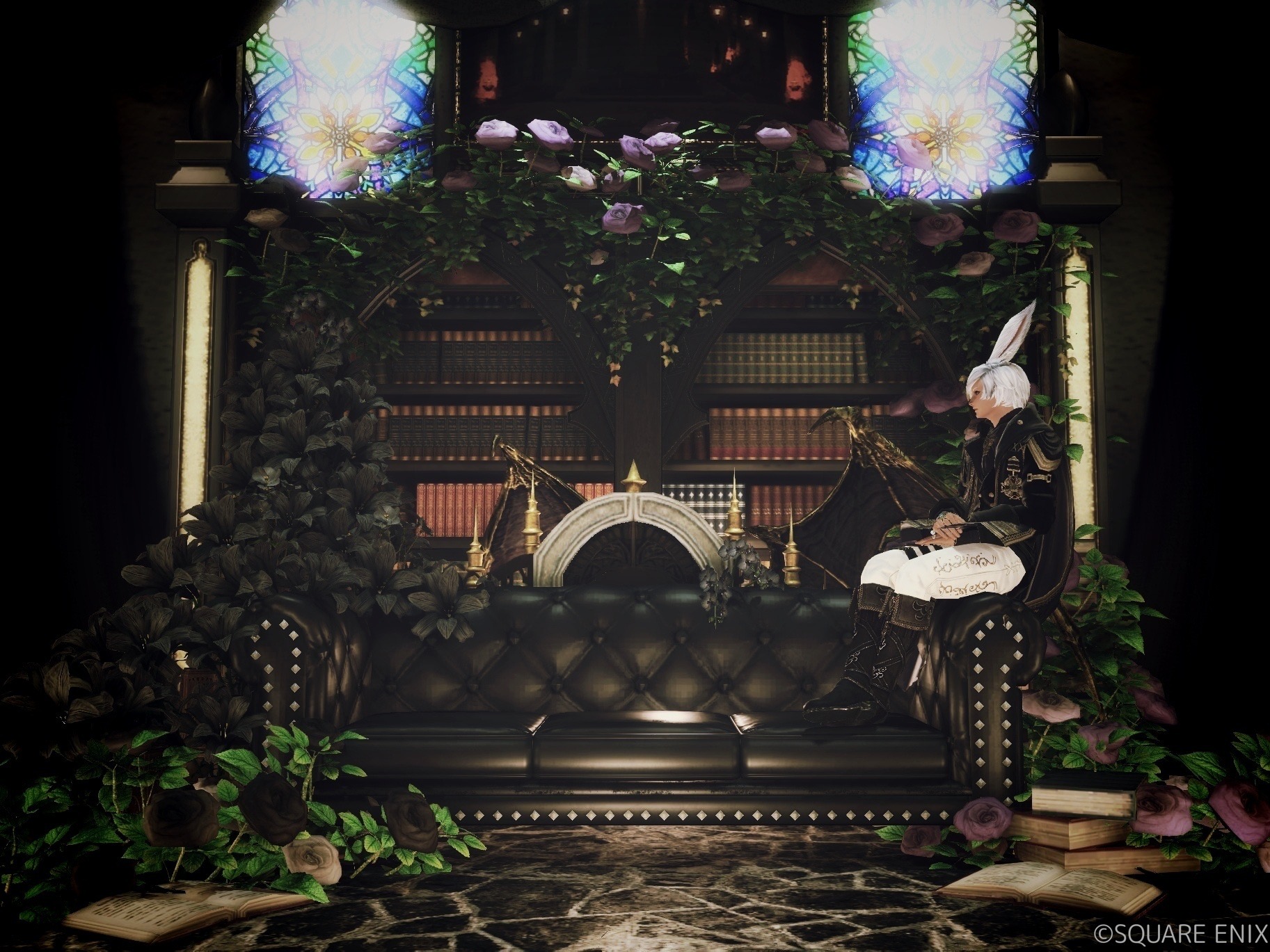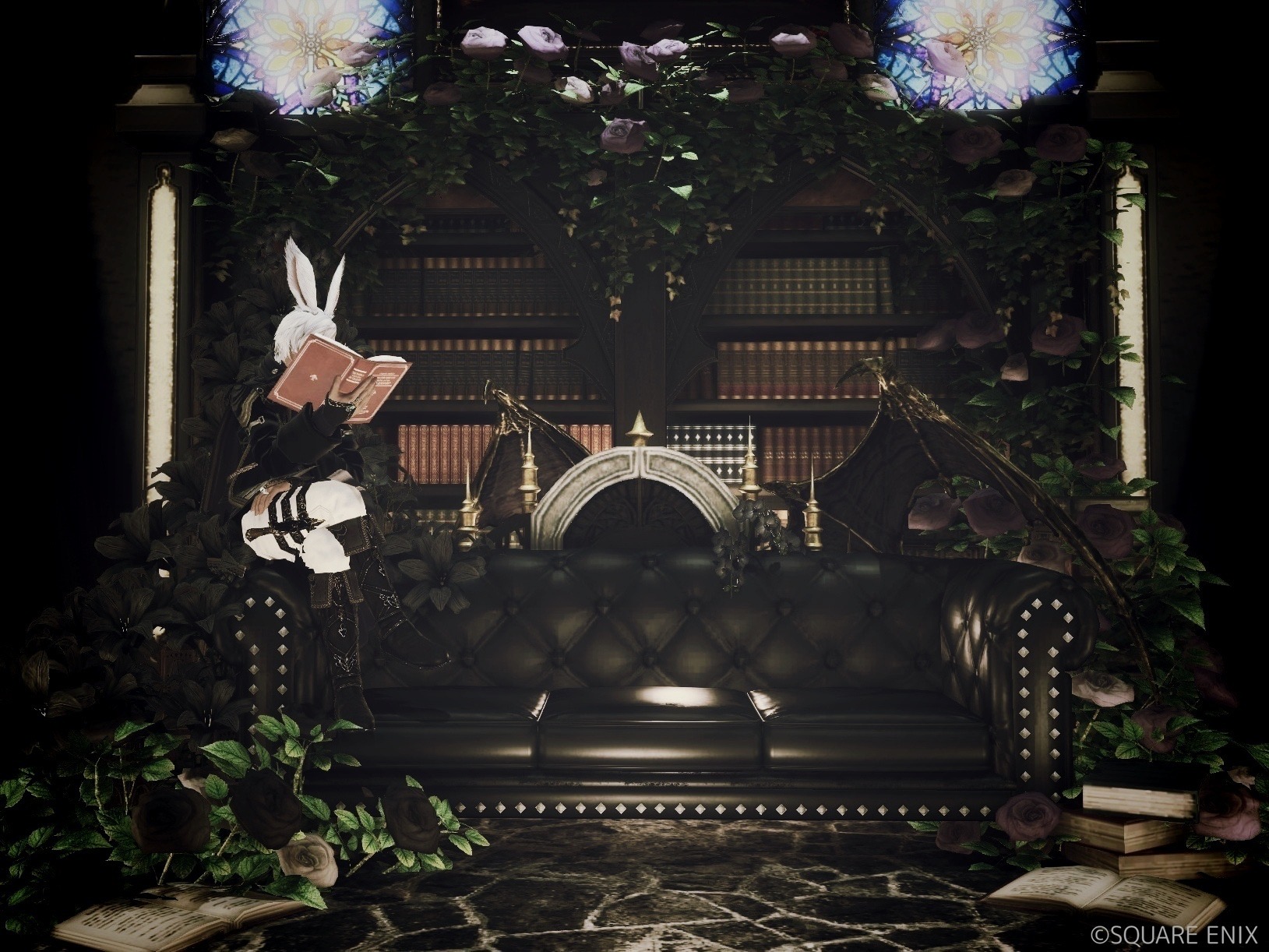 a forbidden archive by ある(||BR||)🌐Meteor / Ramuh(||BR||)📍ミスト・ヴィレッジ11区(||BR||)アパルトメント41号室(||BR||)封印された扉の向こうにある禁書庫をイメージして作りました(||BR||)ソファ両サイドのアームに座ることができます(画像参照)(||BR||) (||BR||)※こんな作りですがライティングはアップ撮(||BR||)#ST_rasia(||BR||)https://studio-xiv.com/studio/83741/