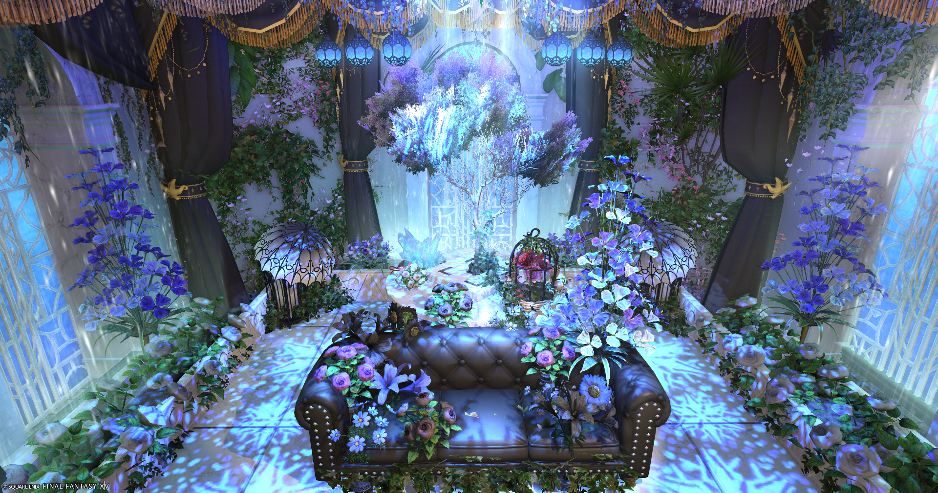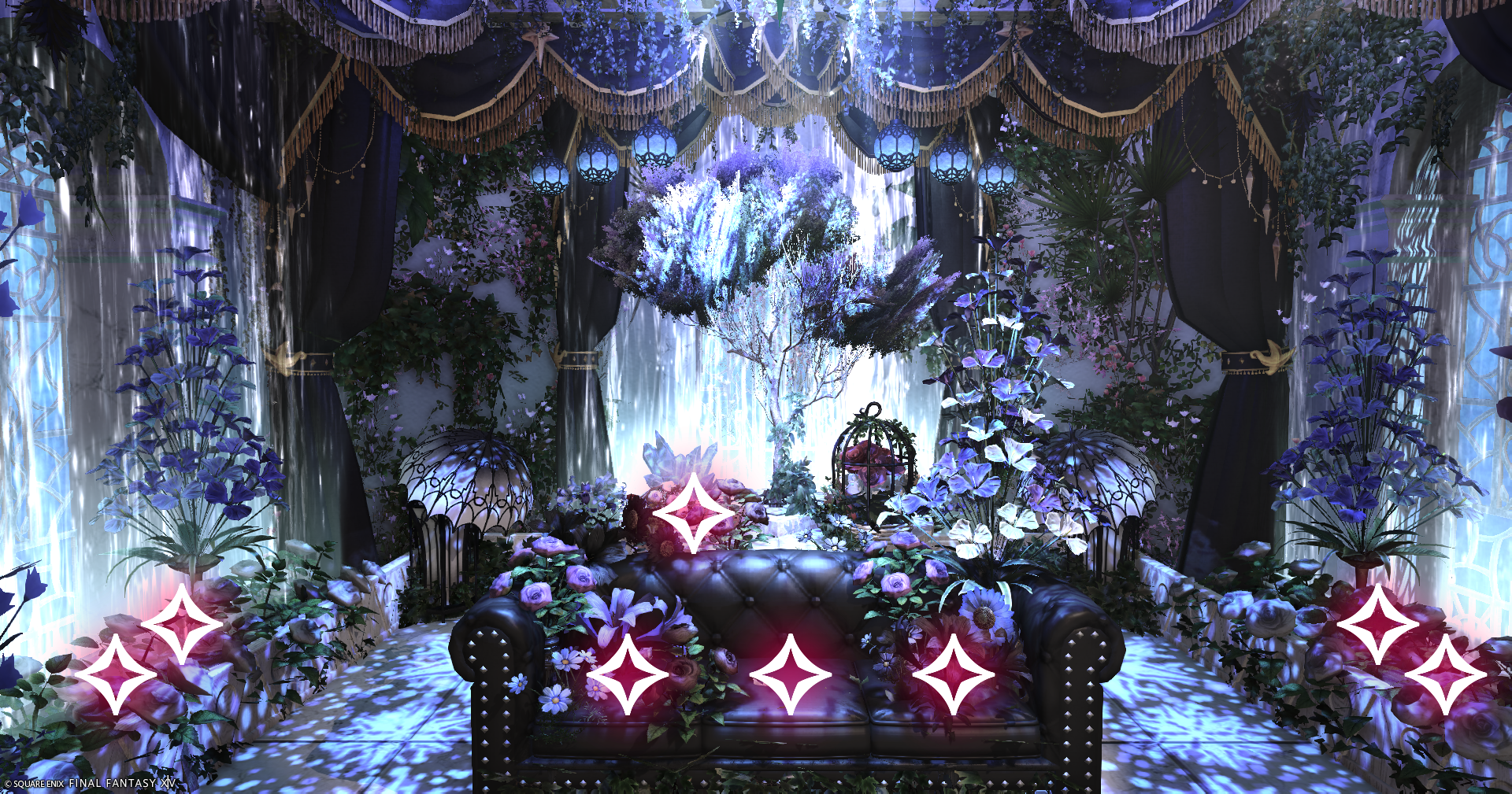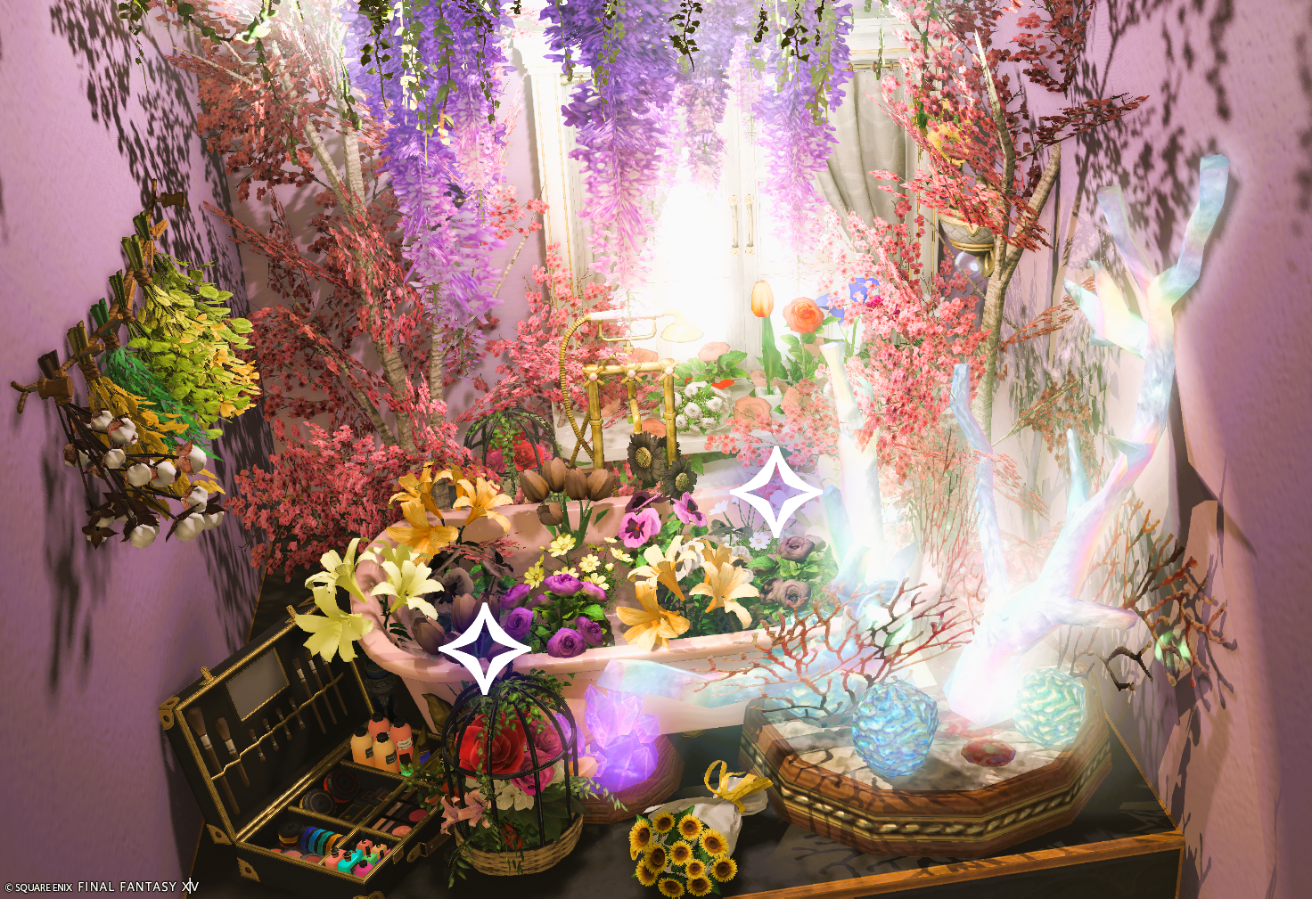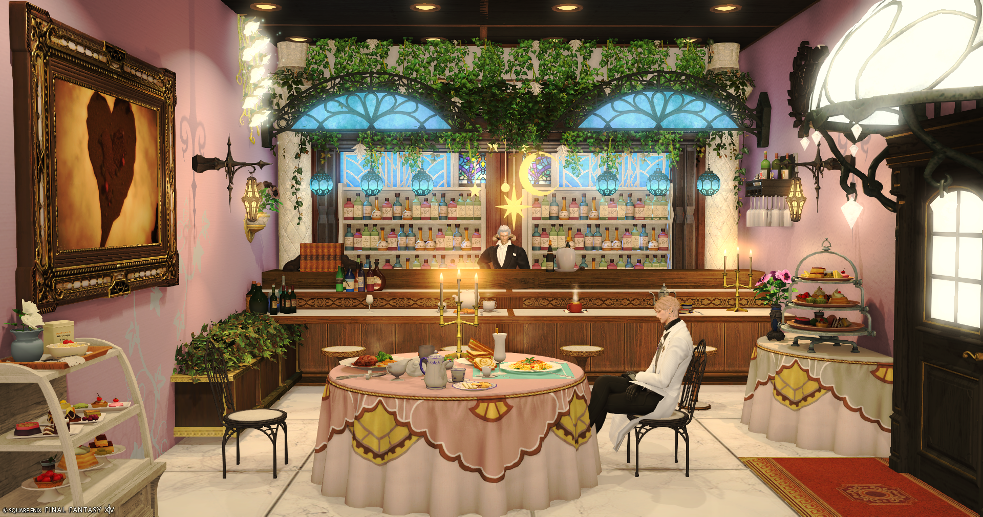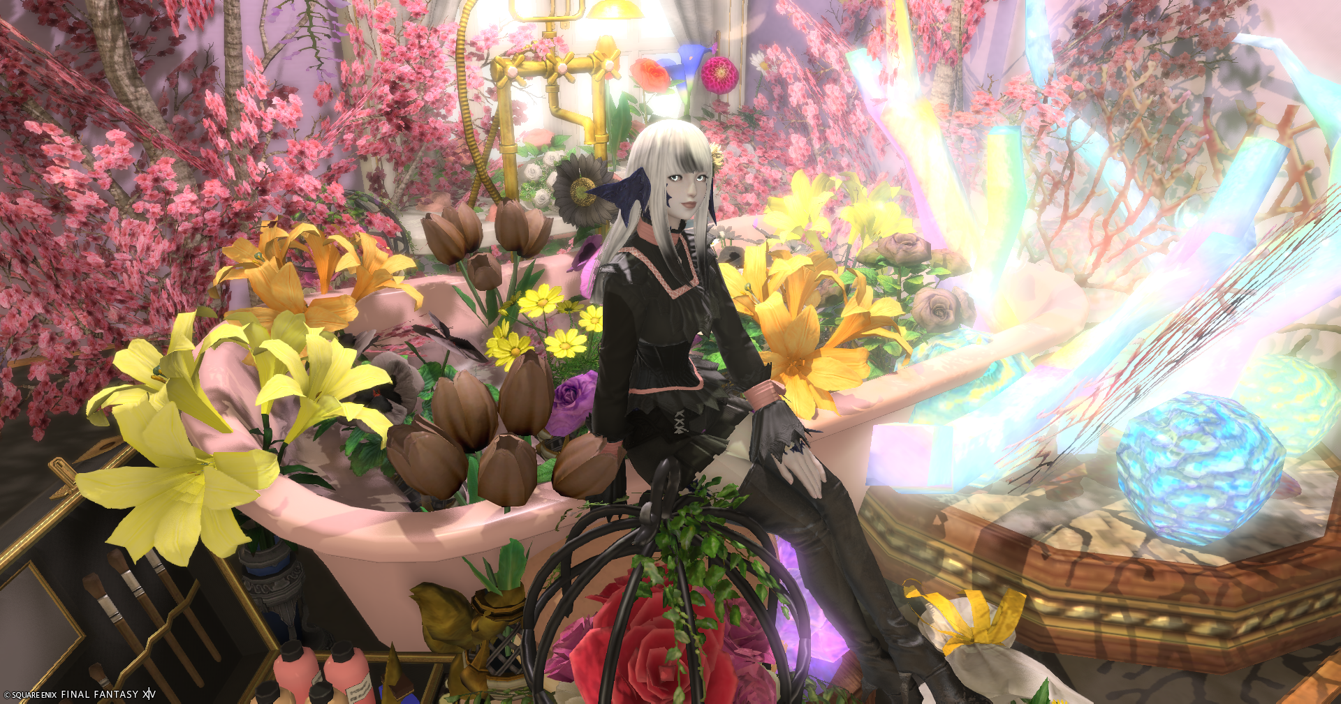 入って右側に進み地下に降りて頂くと淡いパープル・ピンク・暖色系の花がテーマのブースと、カフェバーのようなブースもあります。