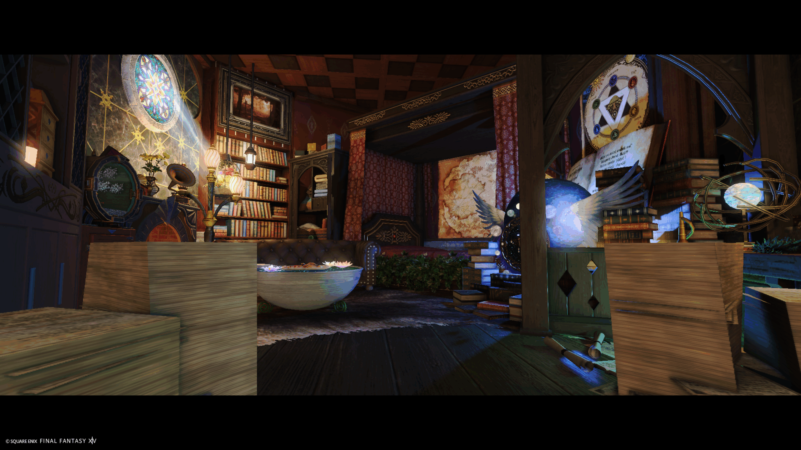 一方、鍛冶屋の地下には店主の自室がひっそりと佇み、神秘的な雰囲気が漂うこの空間は、色とりどりの本棚に囲まれ、ステンドグラスや魔法の光が部屋を優しく照らします。