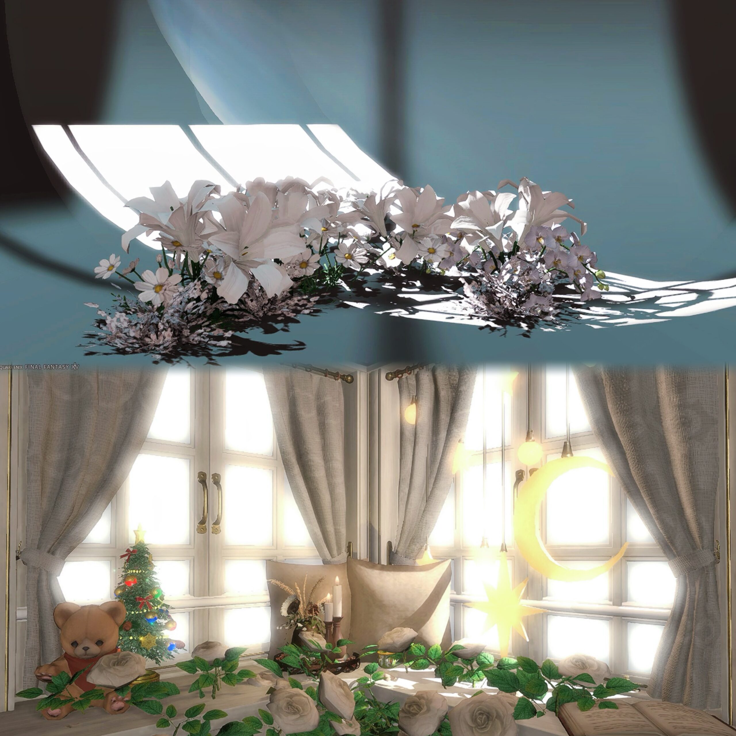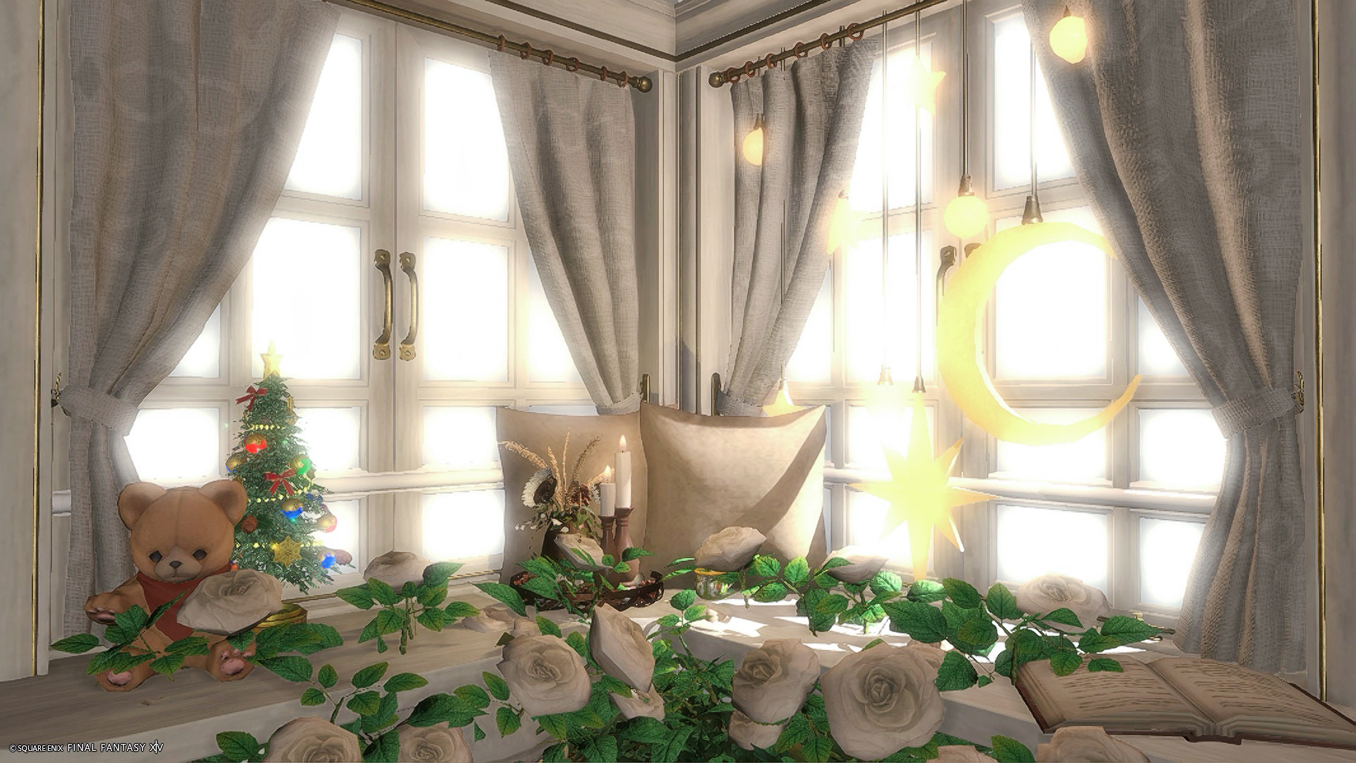 白い窓辺ブースはミニクリスマスツリーとクッションの間に1名座れます。