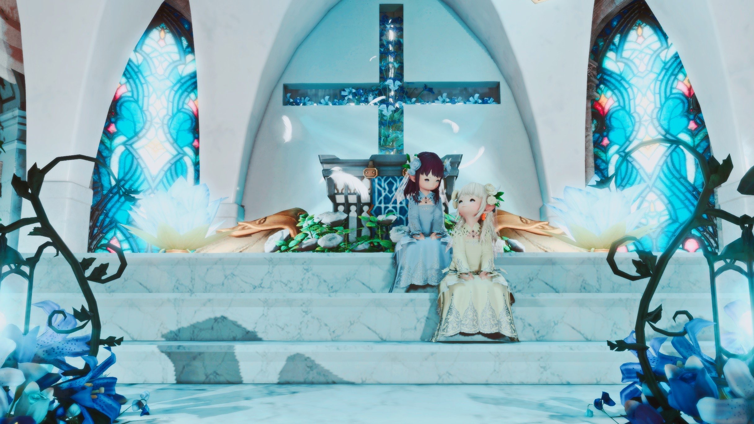 花と羽根が舞う中で、穏やかな幸福が訪れる。」