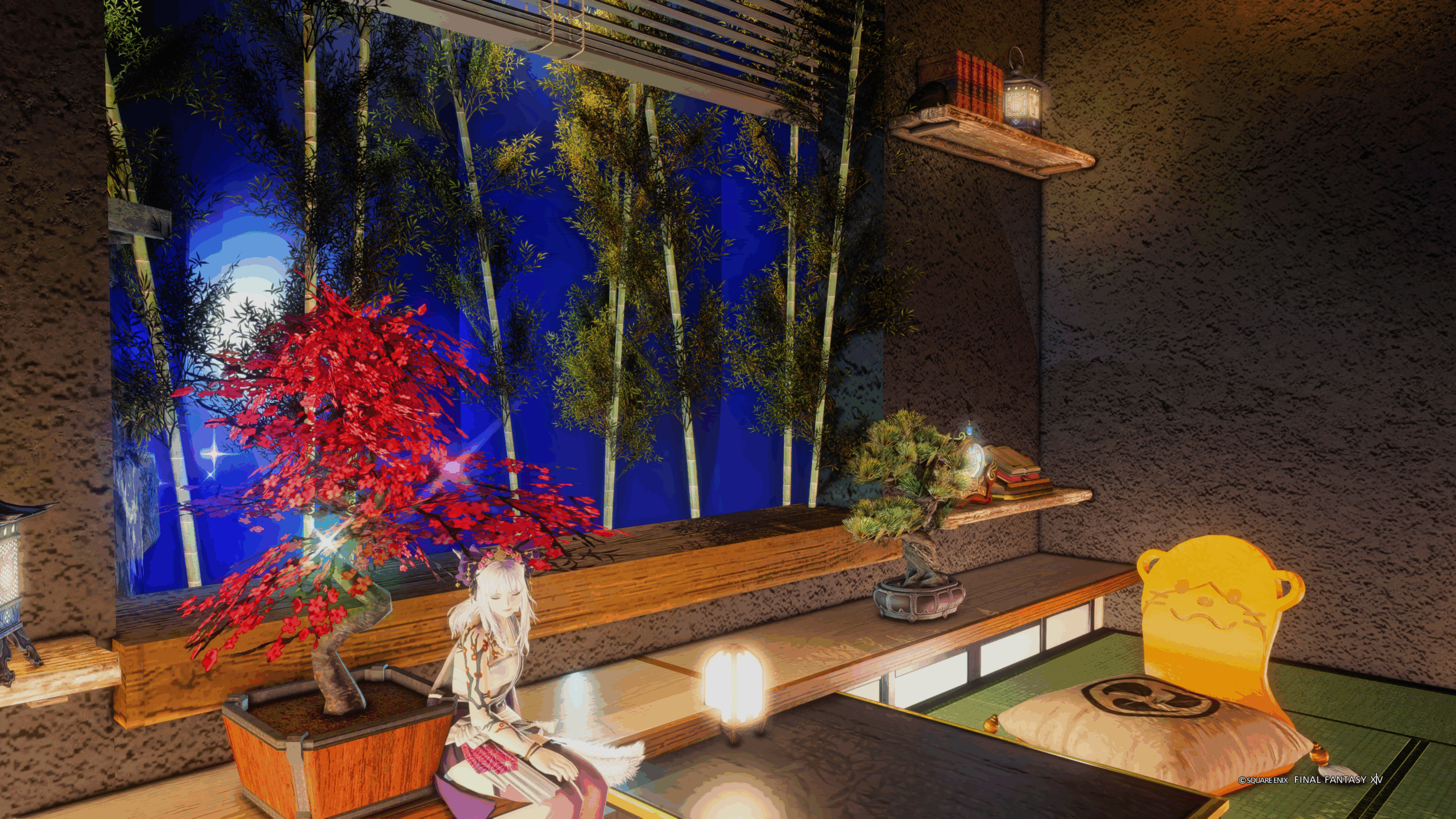サンプル画像にありますとおり、桜の鉢の横と松の盆栽の横に腰掛けて座ることができます!