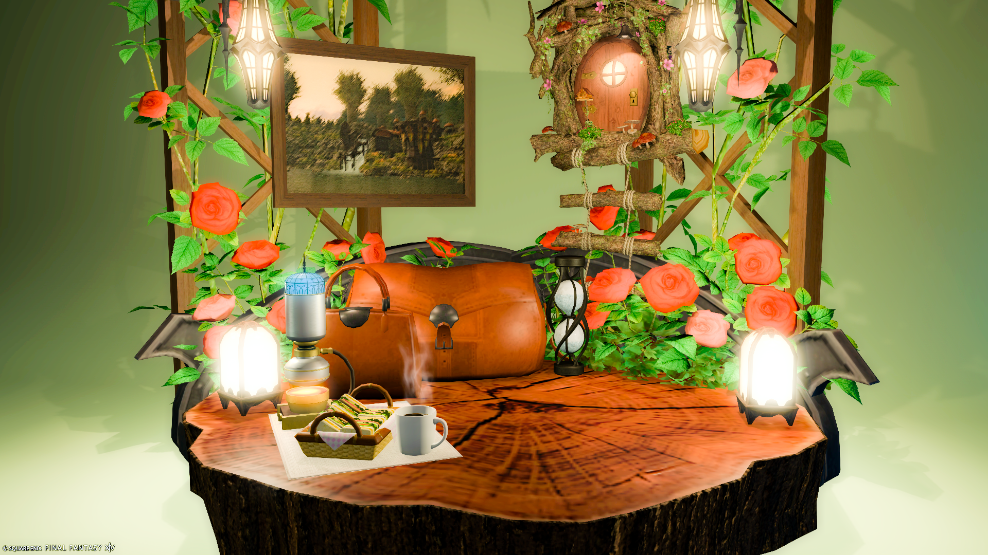 切り株の食卓をベースに使用した撮影専用スタジオになります。場所は拡張街のアパルトメントです。 ※ララフェル向けですが種族関わらず撮影可能です。