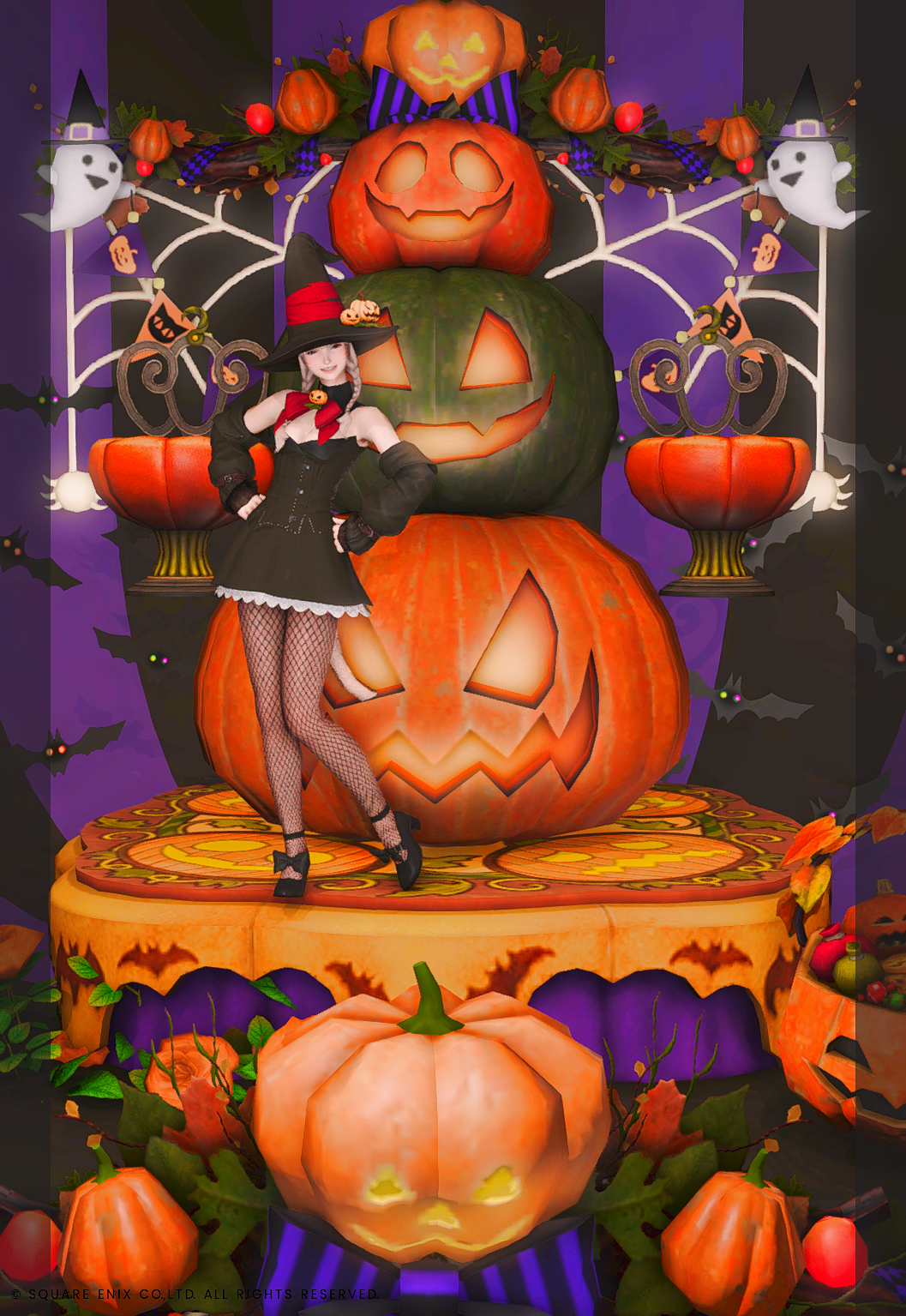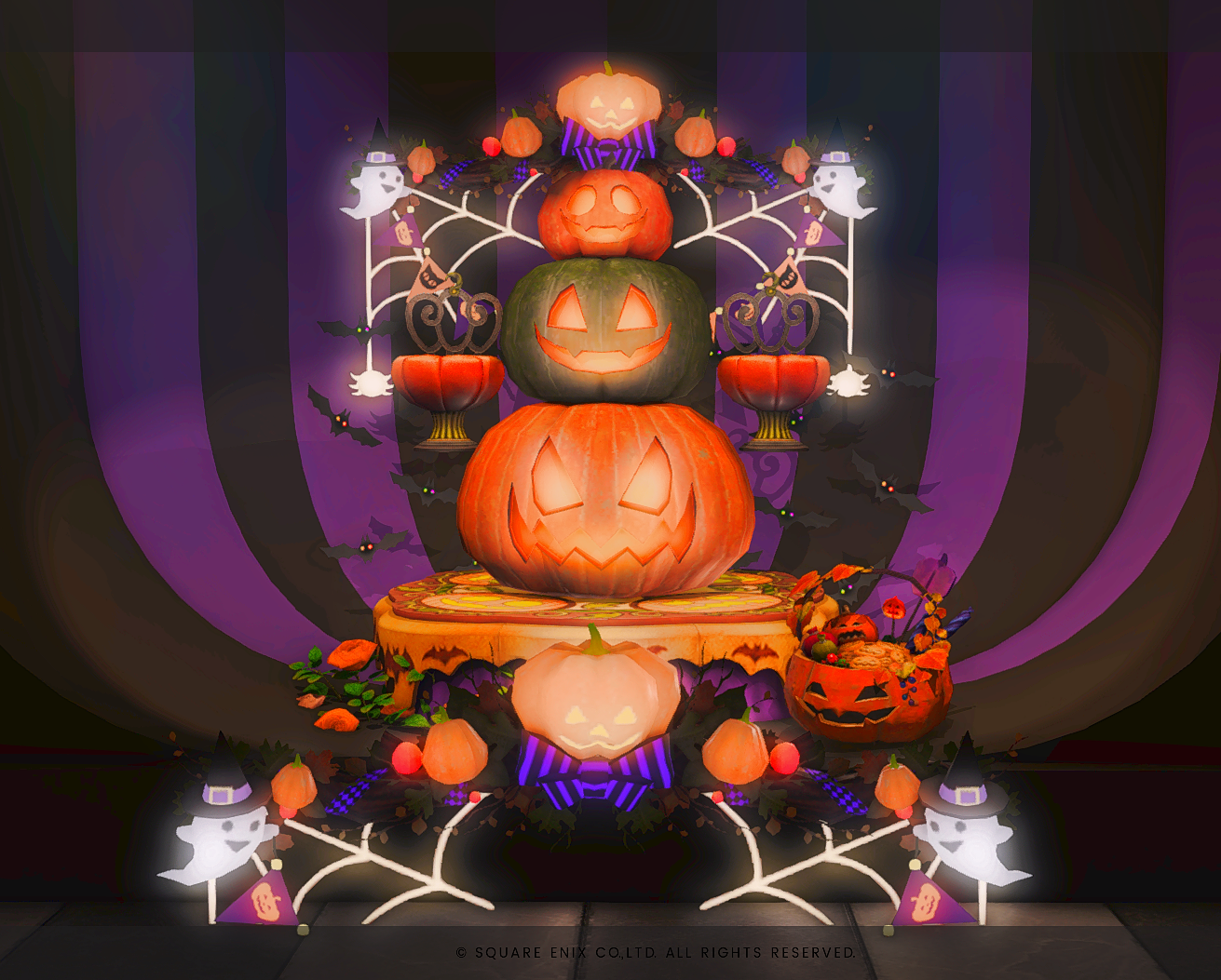 大きなカボチャが乗っている台座の前に2人距離近めの腰掛ポイントがあります