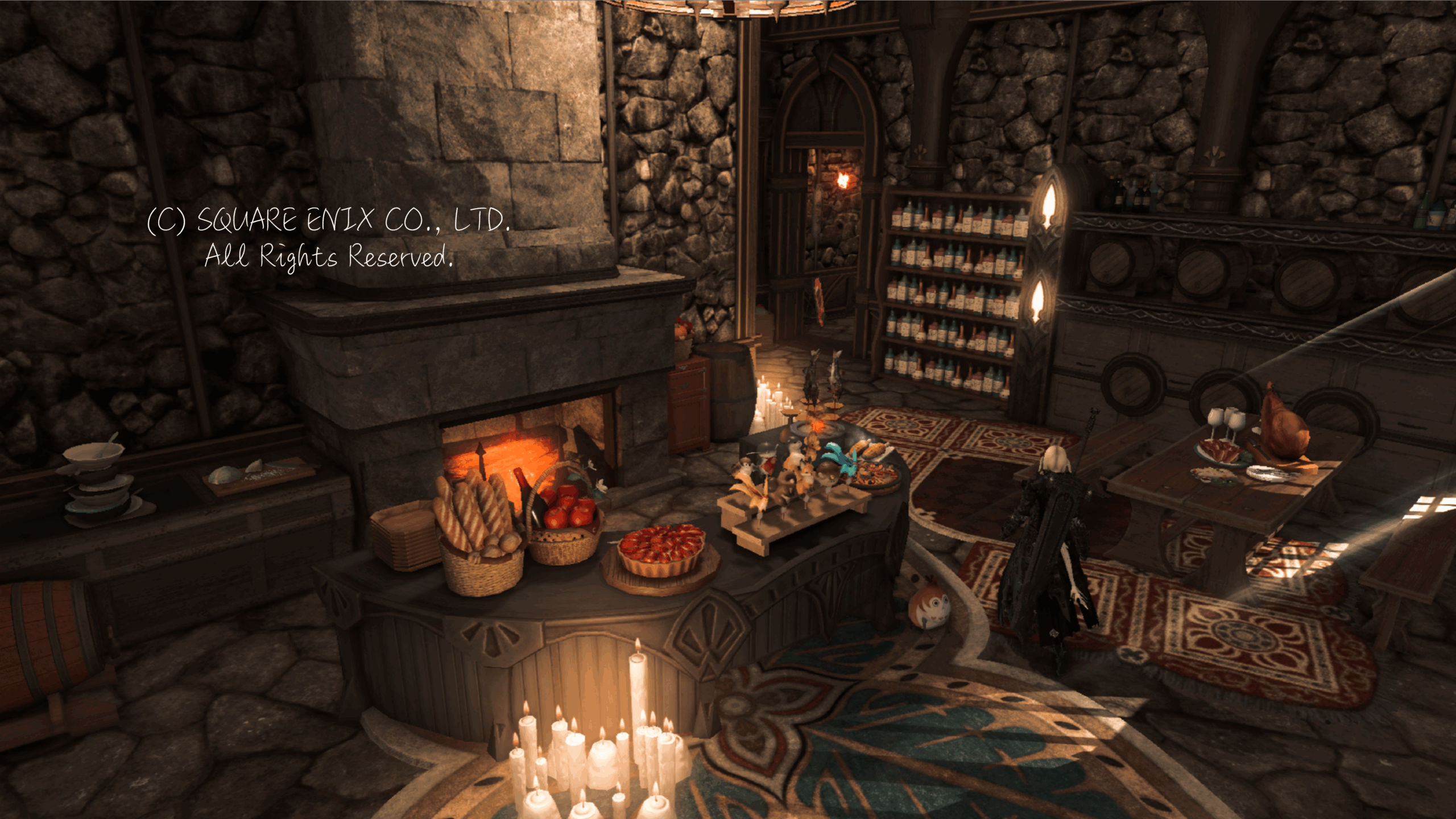 1階は簡易的な食事場を設けています。やはりハンターといえば体が資本。いろんな食材を集めてきたら、豊富な狩猟飯を仲間の皆様とご一緒にお楽しみください。撮影にはやはり「乾杯する」のエモートがおすすめです。