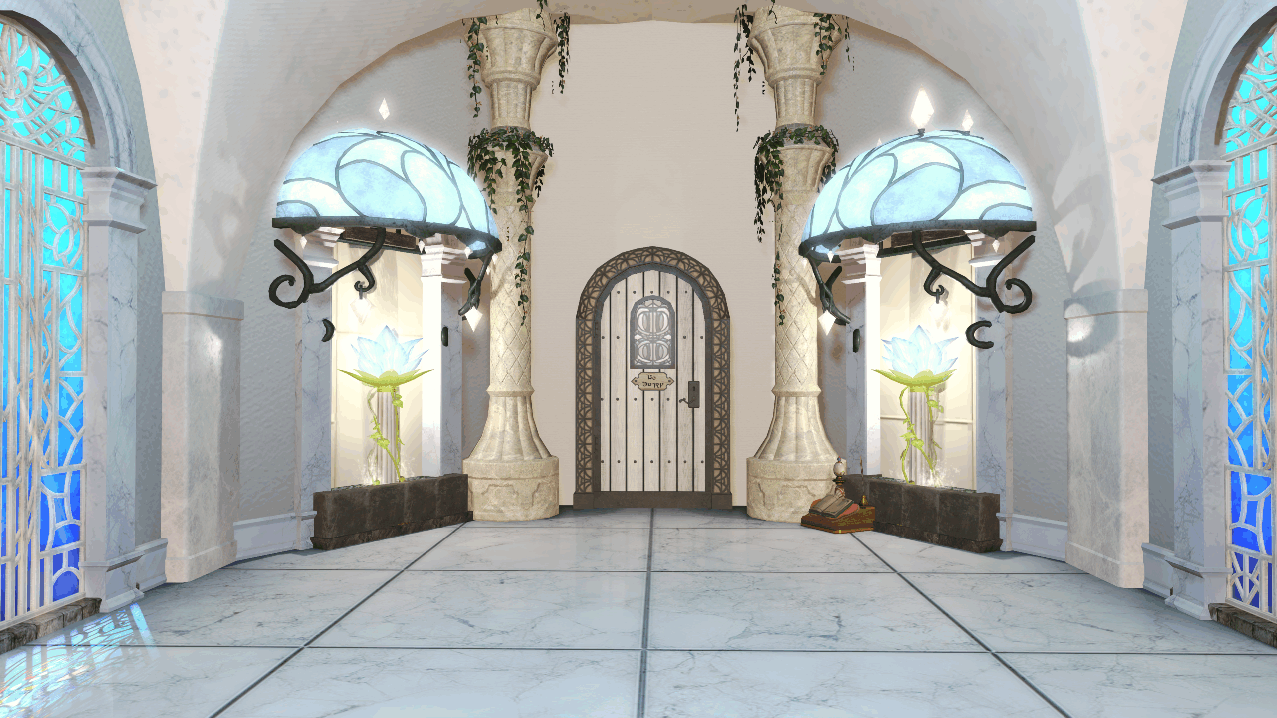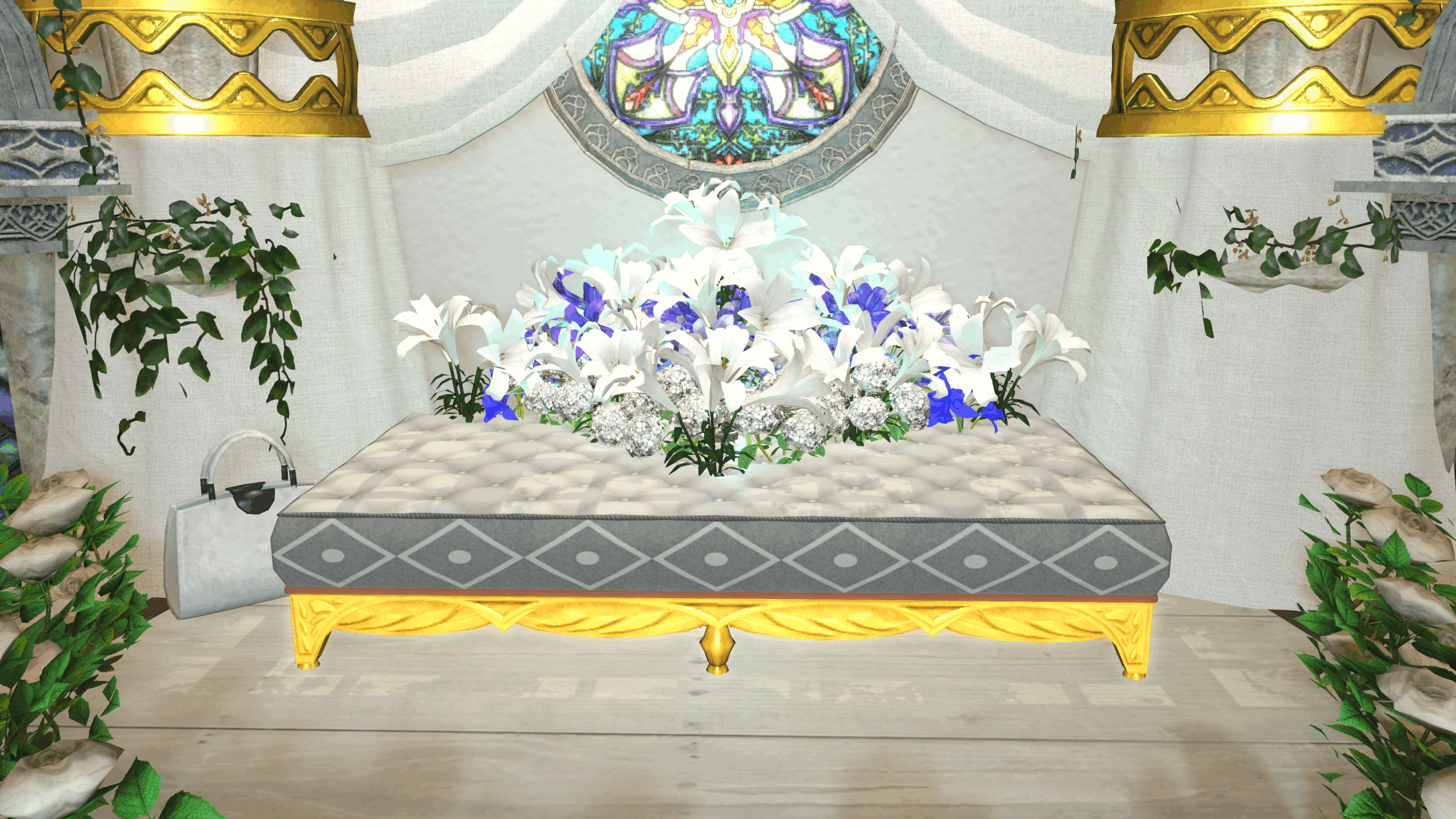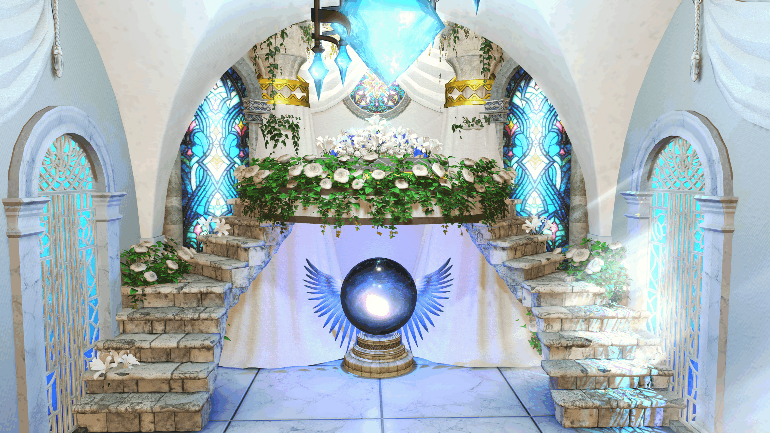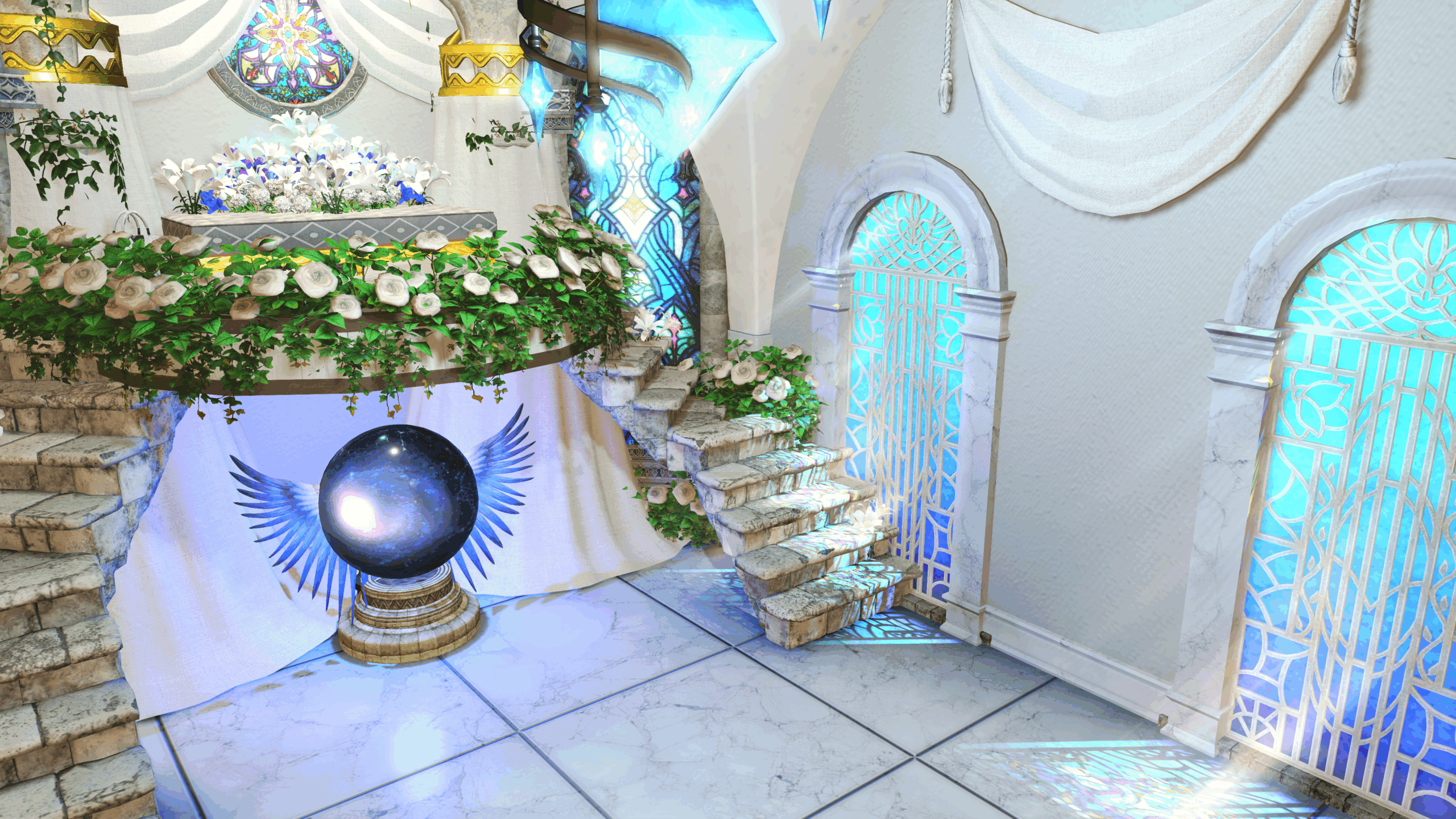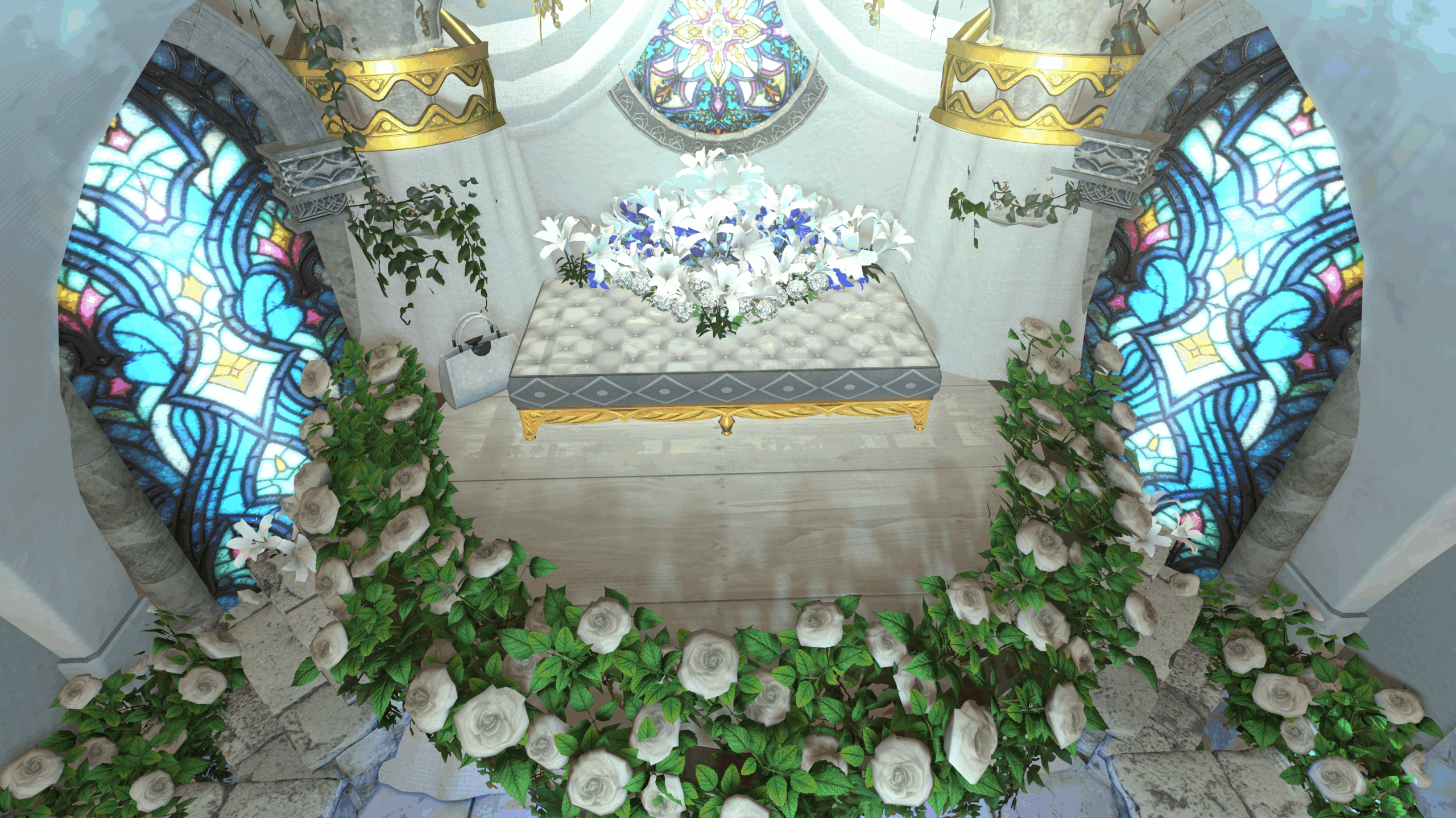 青いステンドグラスから差し込む柔らかな光が幻想的なスタジオです。透明感のある空間になるよう白い花を沢山あしらいました。 これにET8時頃~ET16時頃~が光が入ってきてきれいです。フィルターは鮮やか2がおすすめです。 ソファー周りの配置と光源を修正しました。