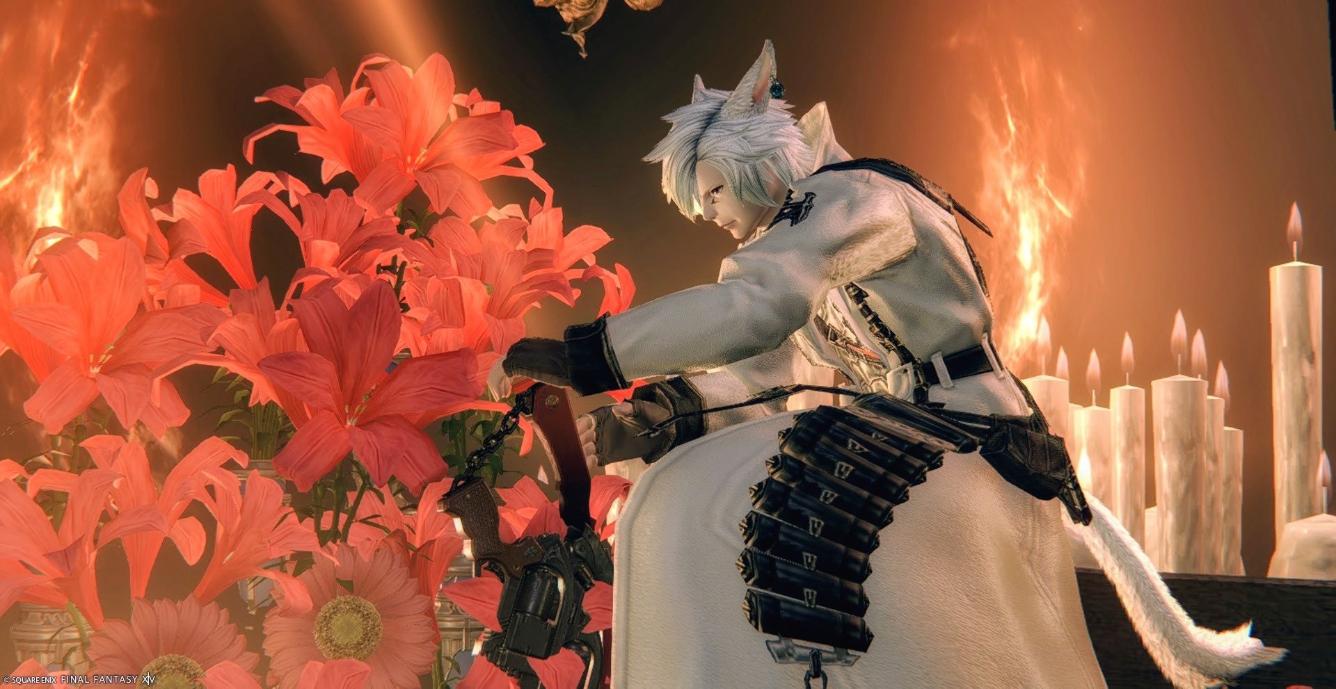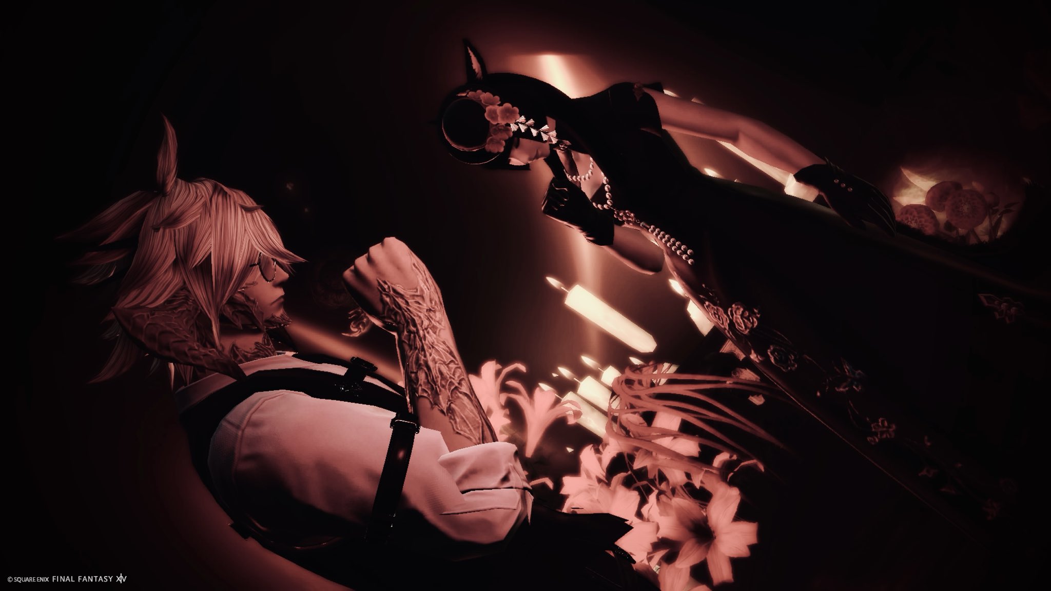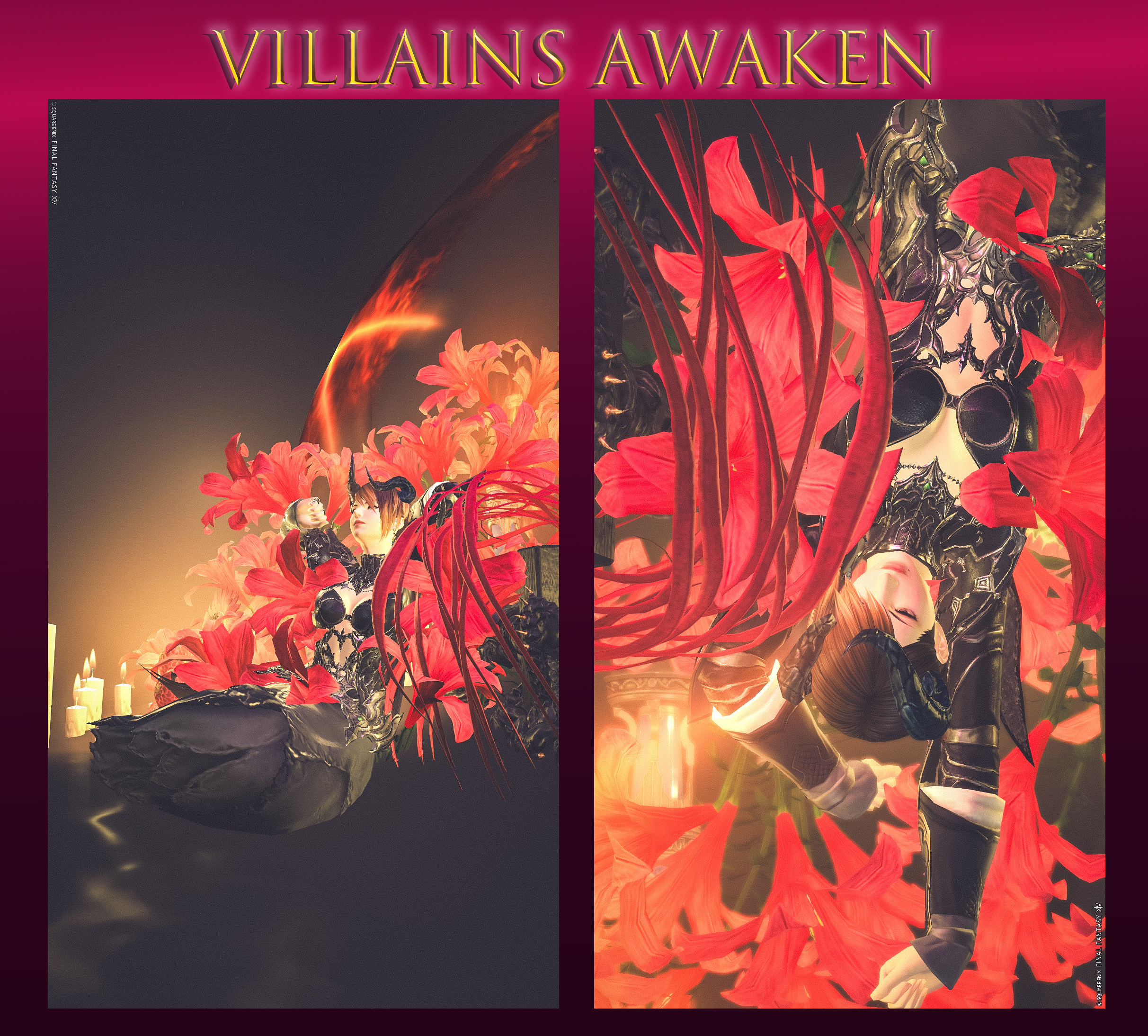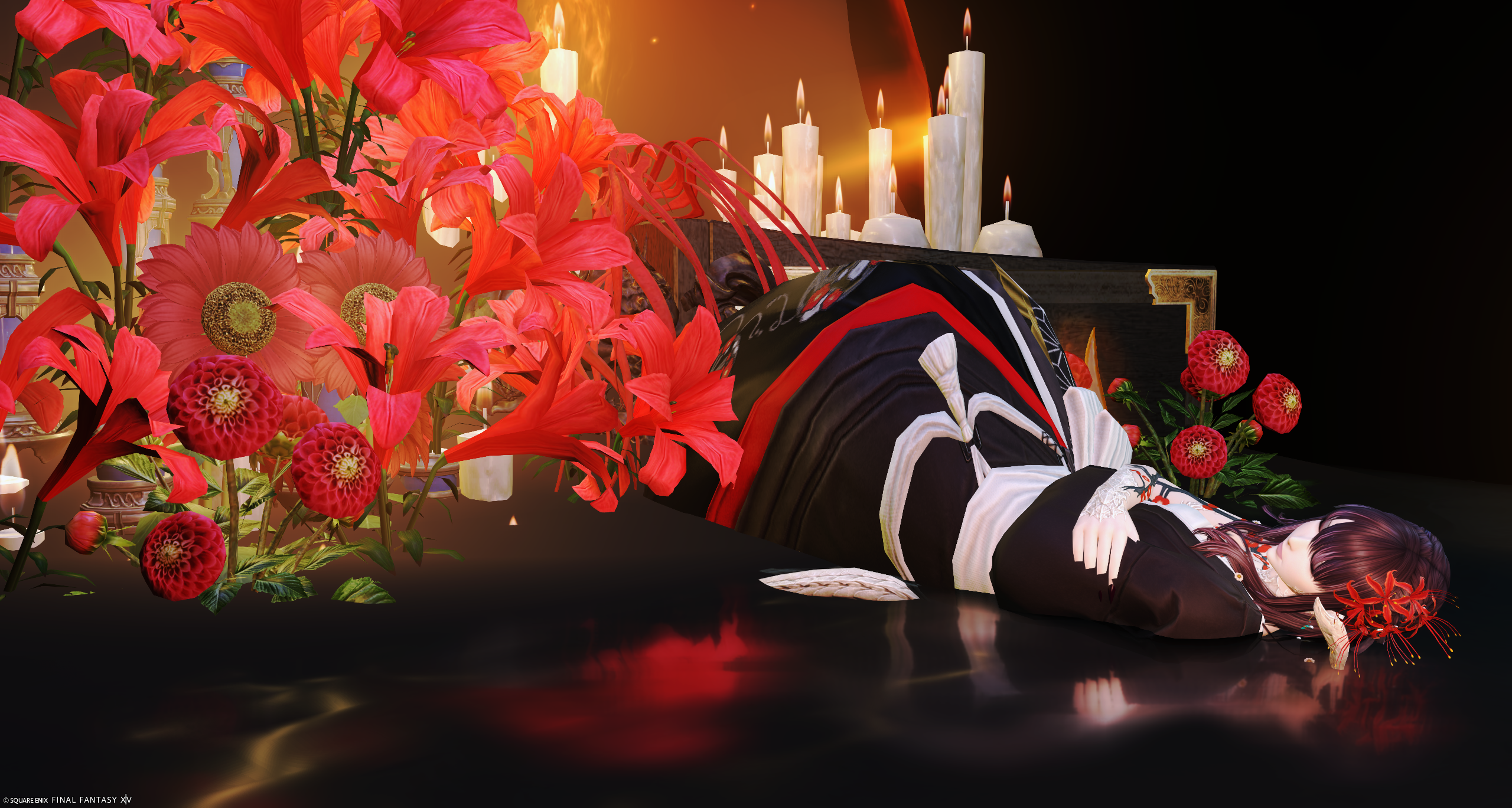 写真5枚目:利用者さまがハロウィン前に目覚める妖魔を表現してくださいました!右は伸びをしているエモートを上下逆にすることで、赤い花に埋もれるように見せています。ストーリーやテーマをもって撮影していただくのは僕にとって本当に嬉しいことです。ありがとう!
