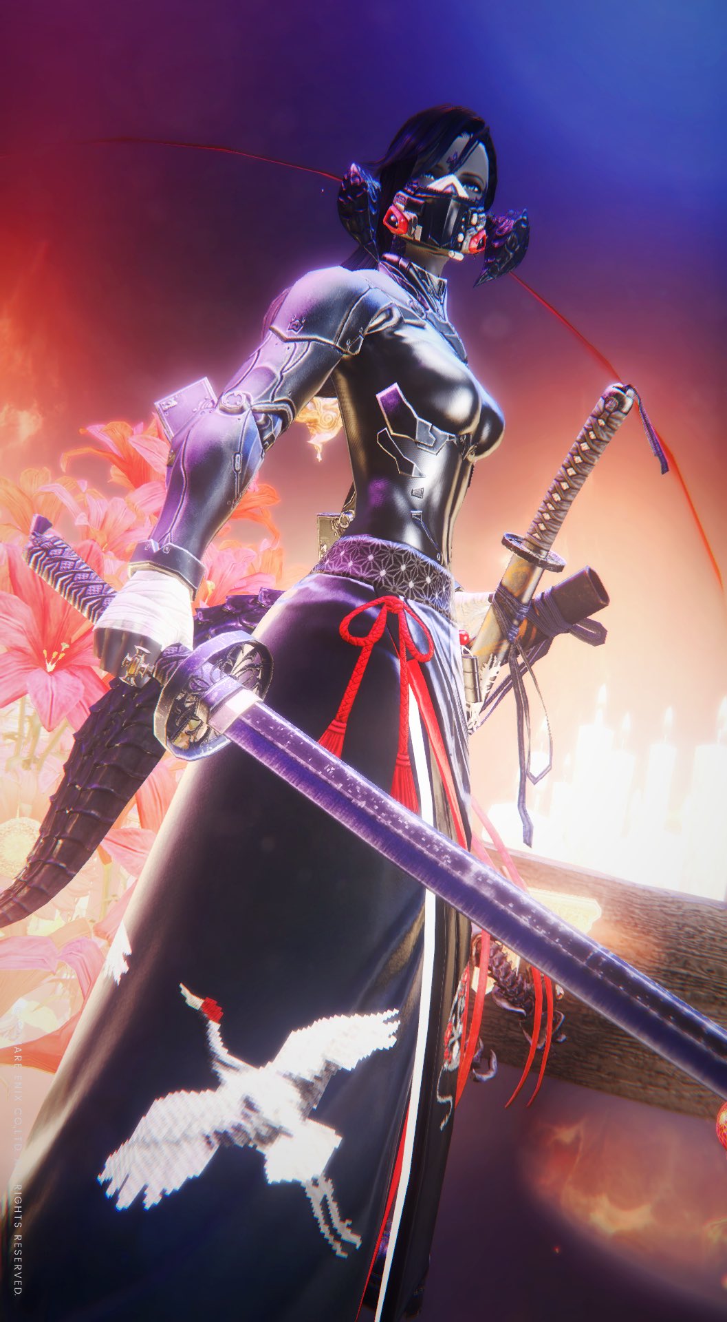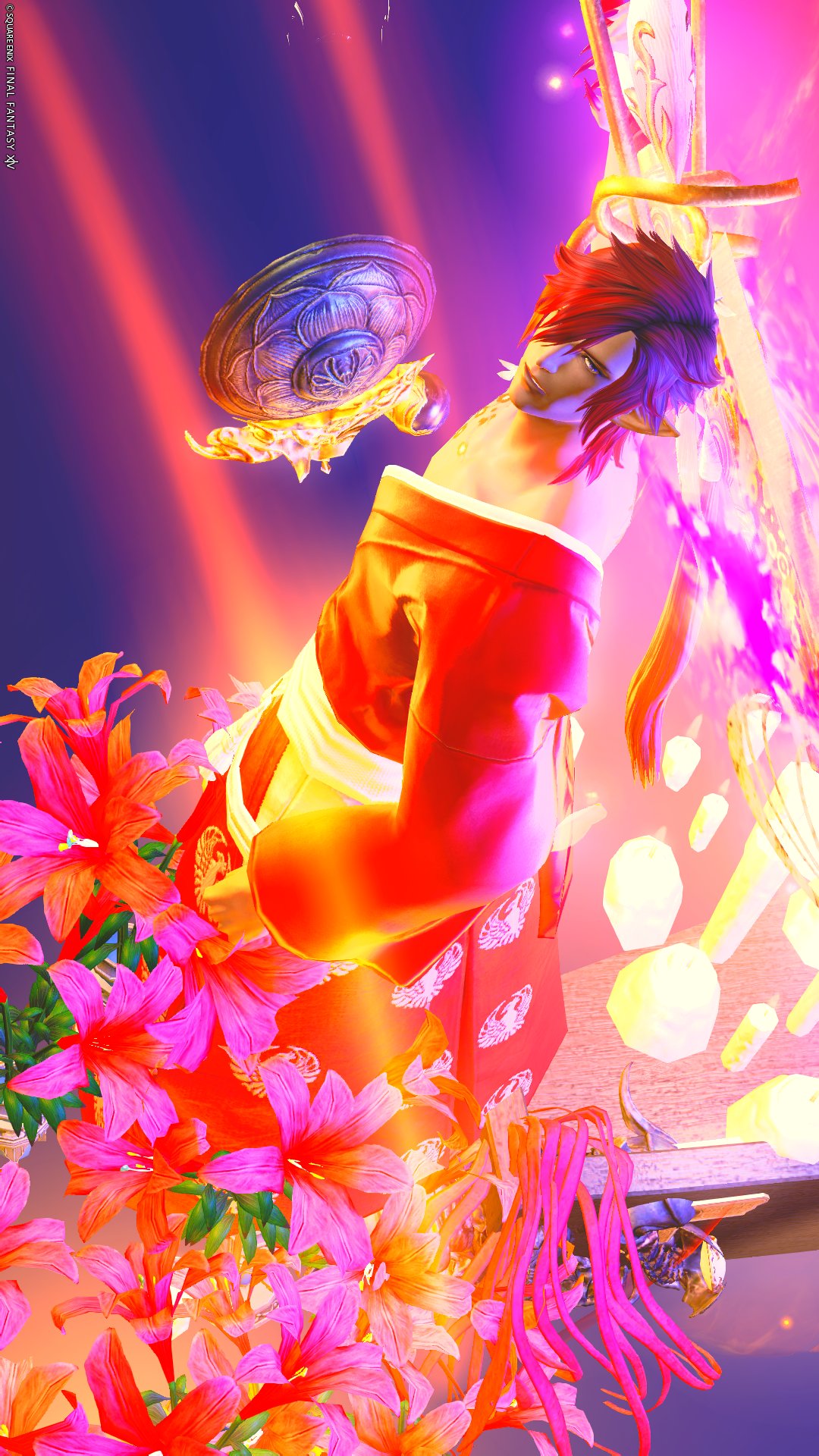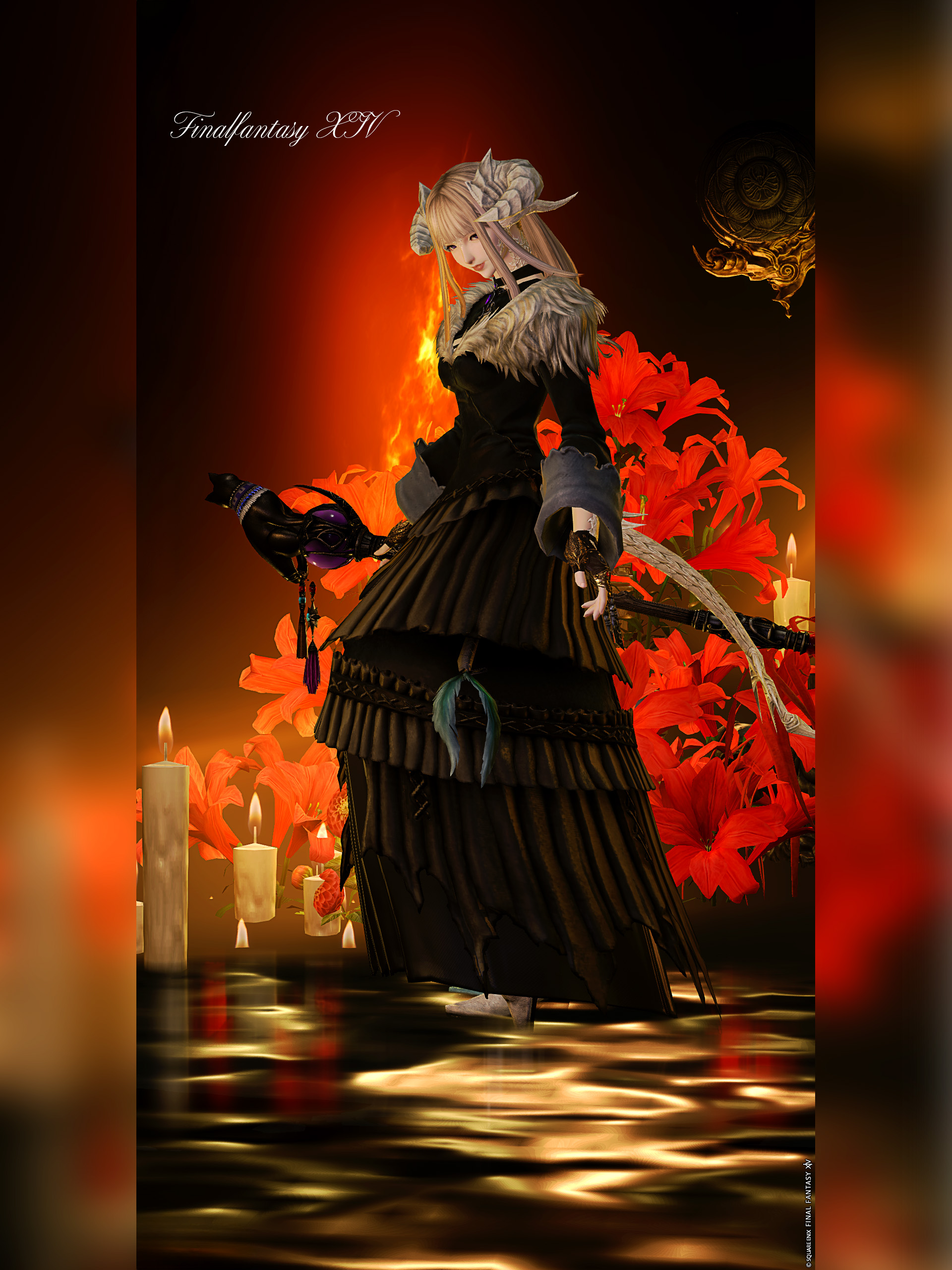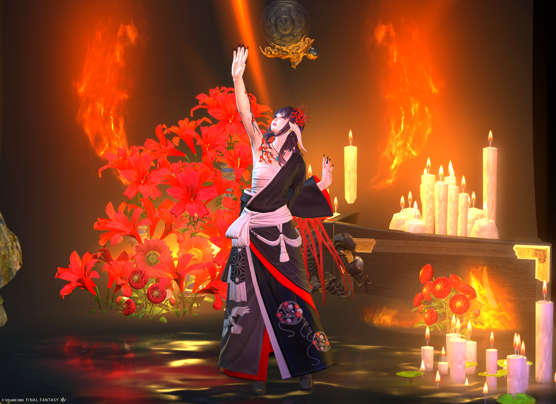 写真3枚目:利用者様作品です。──月読盾が見下ろす中、花はひとつまたひとつ色褪せ燃え尽きていく。 セピアのフィルターを薄くのせることで、赤が前に出がちなこのブースの色味を制御し、人物像を浮き立たせています。影やコントラストのつけ方で迫力も変わりますので試してみてね!♬ゆらいでいる ゆらいでいる 花のように意思を繋ぐ…