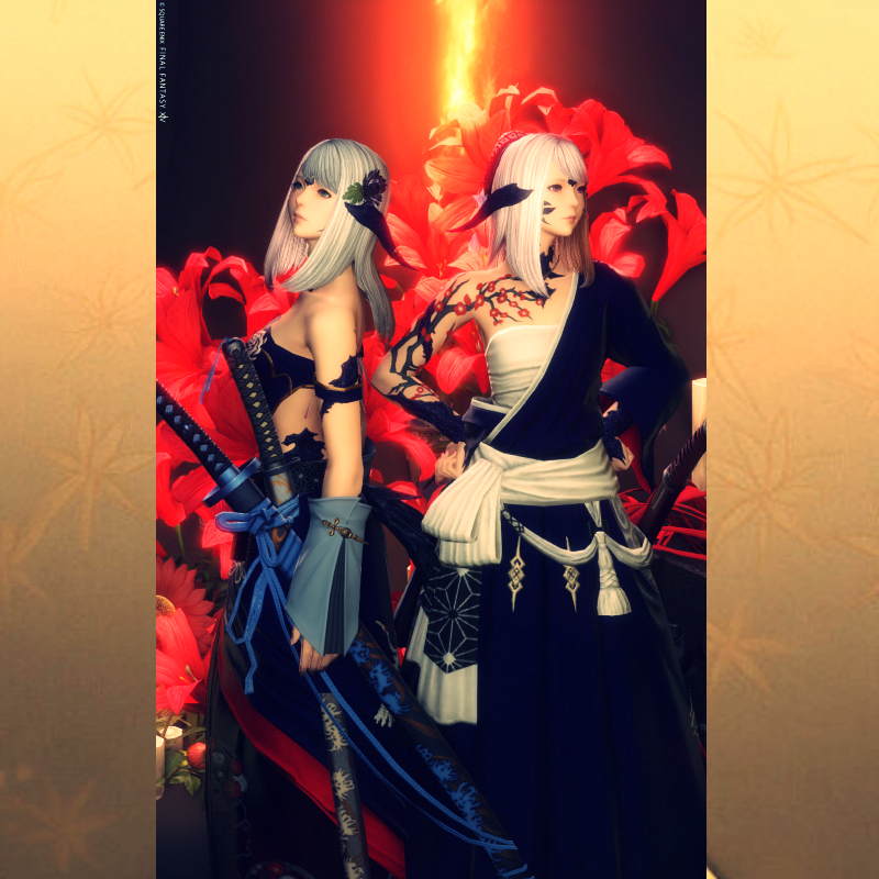 写真10枚目:利用者様がお二人で小説の表紙のように物語を感じる一枚を撮ってくださいました。二人の立ち姿と背景の花の呼応、剣の青い房飾りと白い帯止めの優雅な対比、背景中央の明るい光と左右を占める金色のグラデーション…大変緻密なバランスで成り立っている素晴らしい作品です!