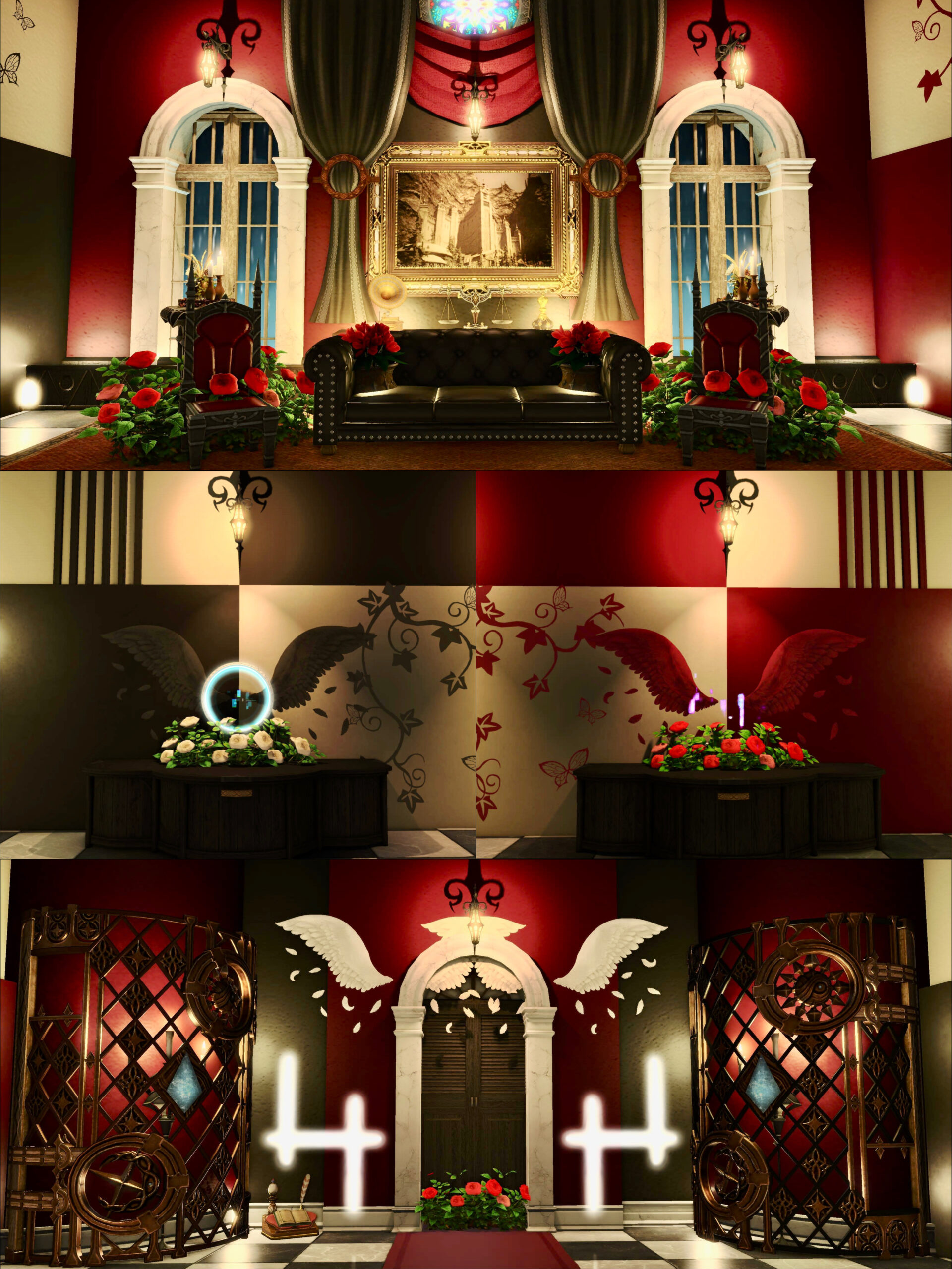 「The Red and the Black」 by Sophia Versus(||BR||)🌐Meteor / Mandragora(||BR||)📍ミスト・ヴィレッジ20区(||BR||)アパルトメント60号室(||BR||)赤と黒をメインにゴシック調に仕上げました。(||BR||)4方向の壁面に、撮影スポットあります。(||BR||)羽のテーブルにも座れるようになってますが、羽の位置(||BR||)#st_sophivers(||BR||)https://studio-xiv.com/studio/87450/