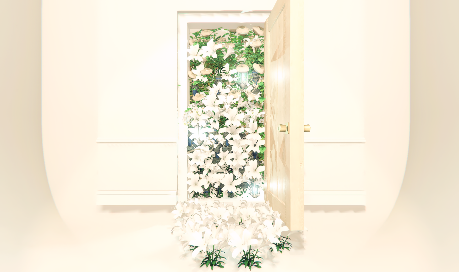 扉から溢れ出そうな白百合がポイントで床に生えている白百合もSS映えすると思います。