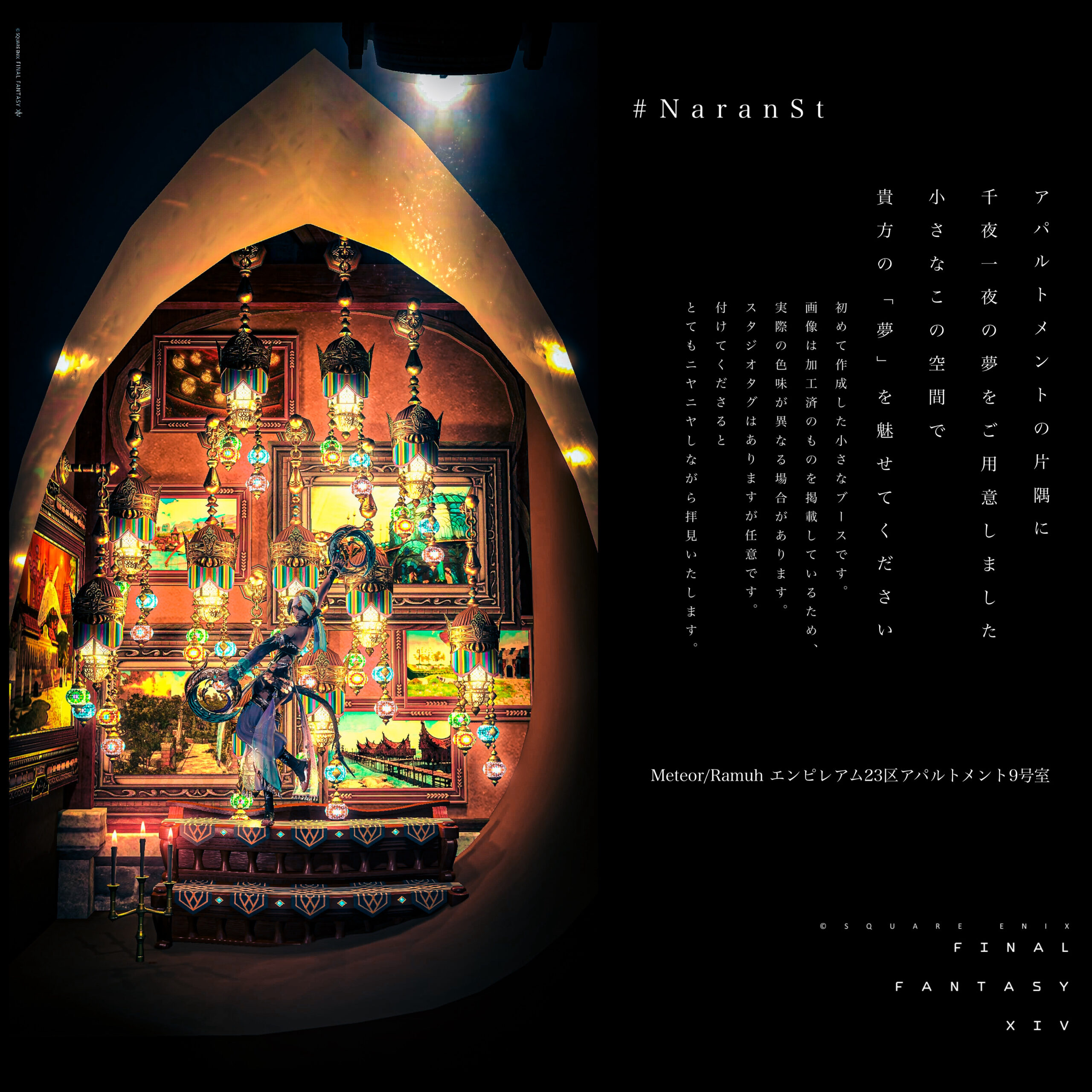 千夜一夜の夢 by Narangerel(||BR||)🌐Meteor / Ramuh(||BR||)📍エンピレアム23区(||BR||)アパルトメント9号室(||BR||)とても小さいブースです(||BR||)画像の色味は実際と異なる場合があります(||BR||) (||BR||)規約の範囲内でお好みの表現でお楽しみください(||BR||)#NaranSt(||BR||)https://studio-xiv.com/studio/88552/
