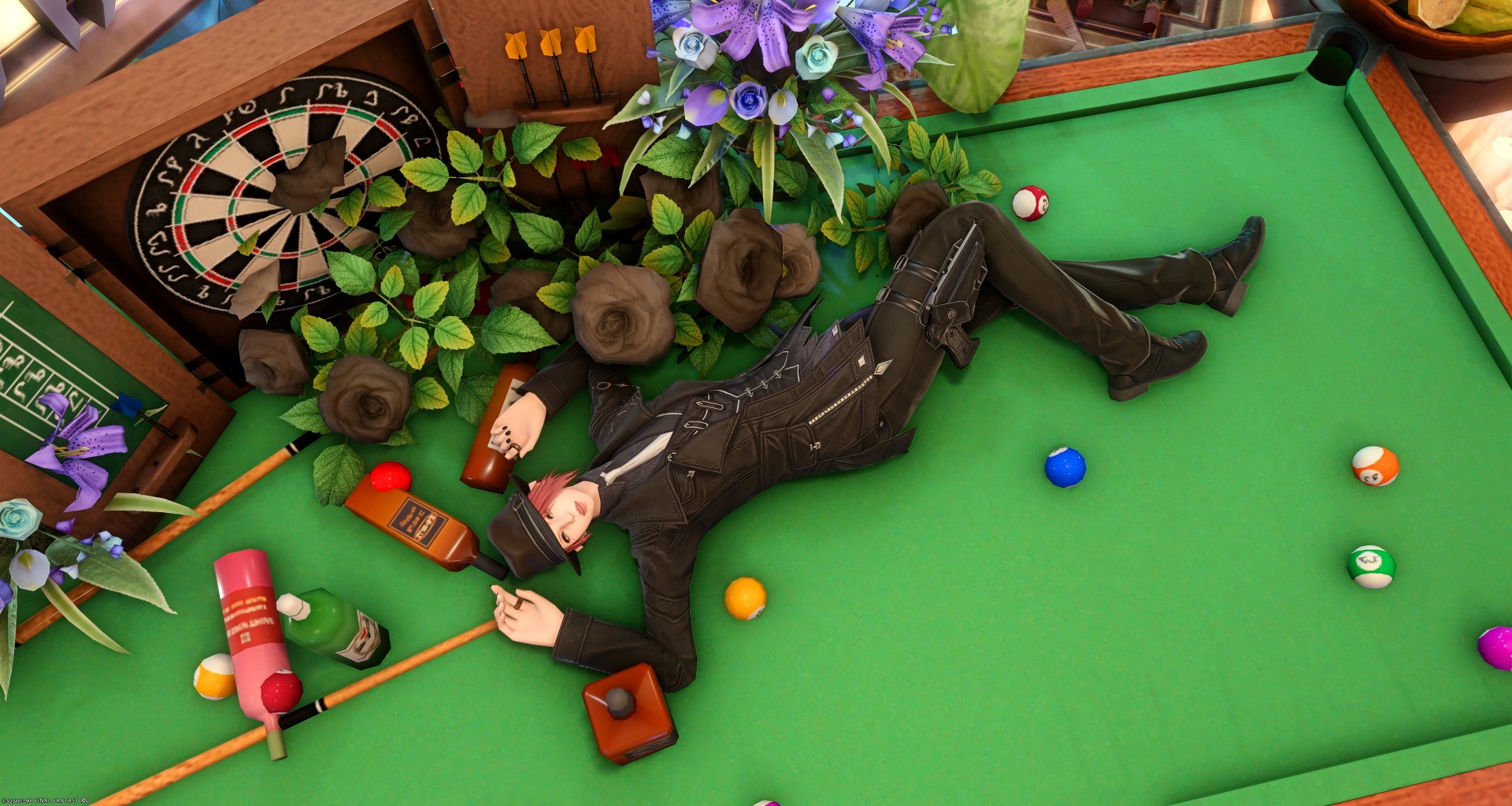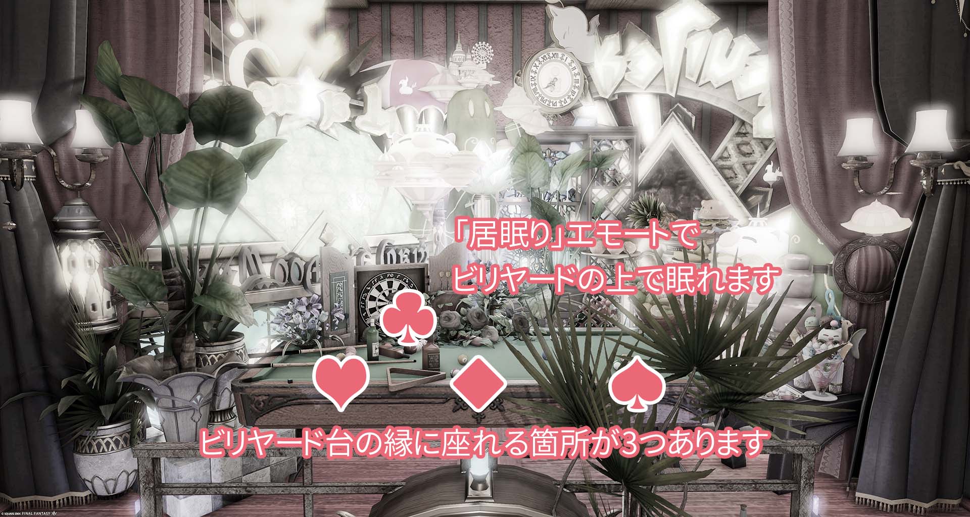 Rouge ou Noir by Mosco(||BR||)🌐Elemental / Typhon(||BR||)📍ミスト・ヴィレッジ15区(||BR||)アパルトメント12号室(||BR||)Rouge ou Noir?(||BR||)*********(||BR||)ビリヤード台で「居眠り」をすると、ビリヤード台の上で寝ることができます。(||BR||)また、ビリヤード台の縁に座るこ(||BR||)#stadio_bonbon(||BR||)https://studio-xiv.com/studio/88910/