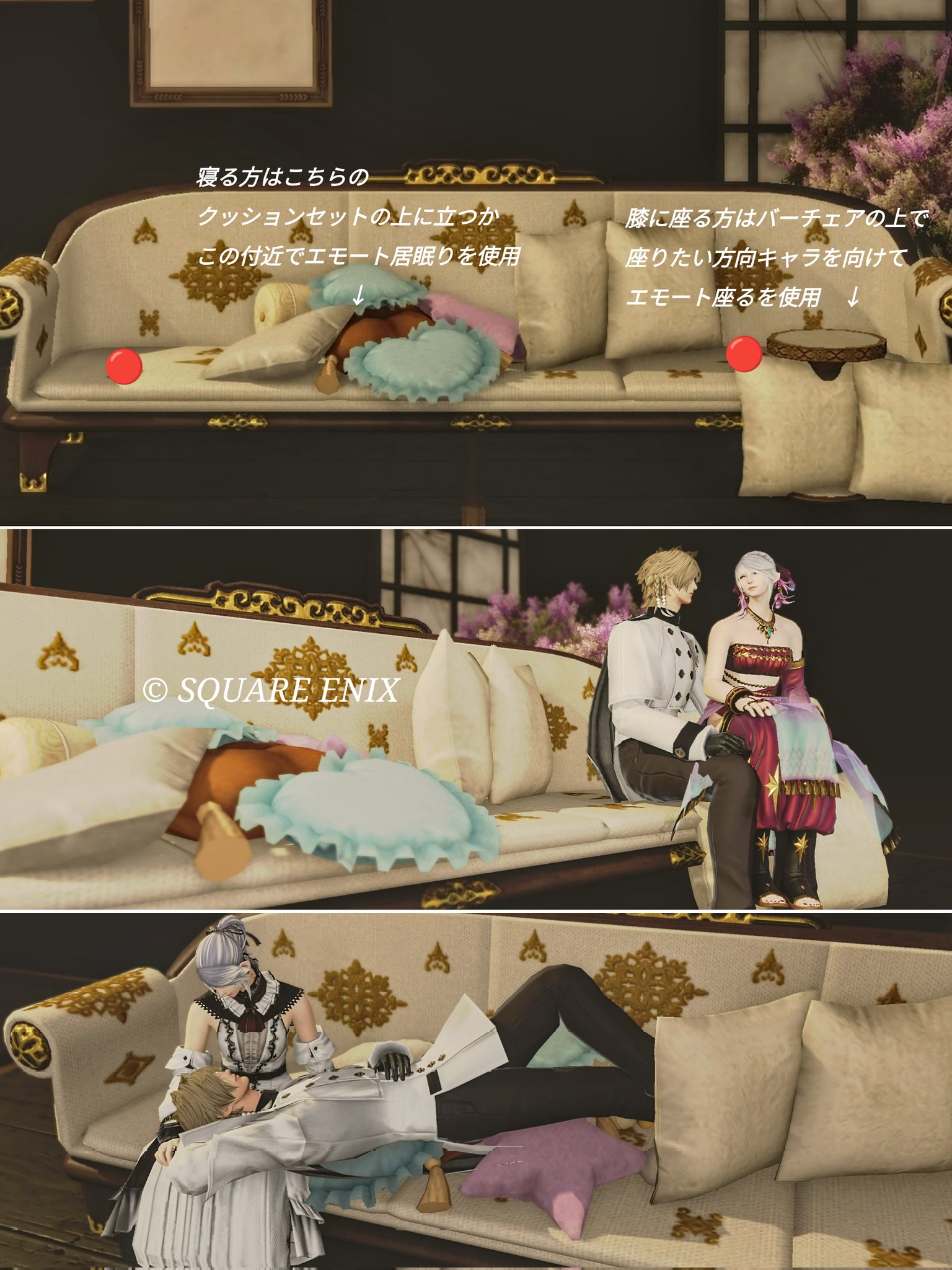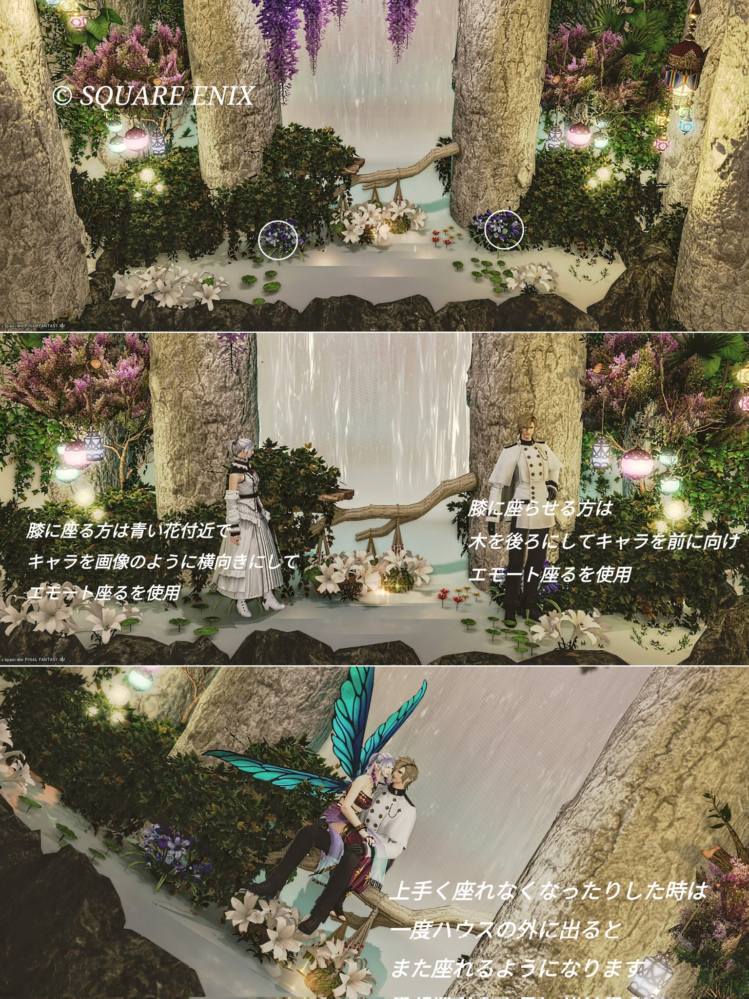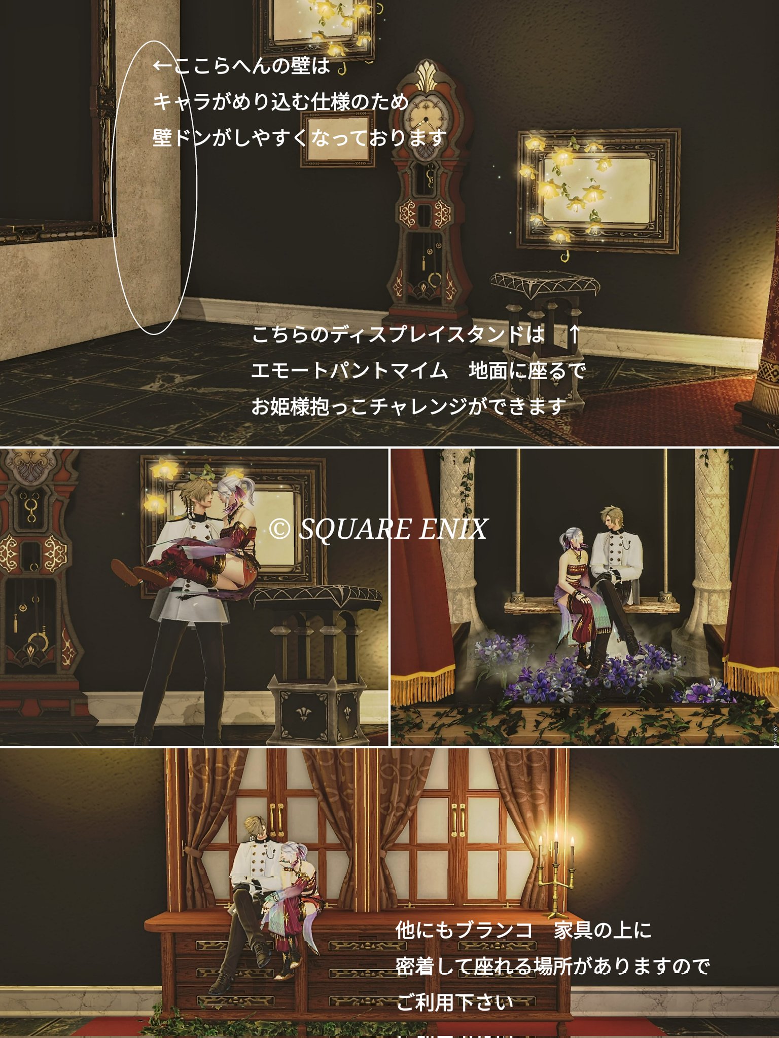等ハウスはエレオス、エレメスでの調整のため、他種族の場合仕上がりが画像と異なる場合もありますがエモートを使うことでより良い撮影ができたりします