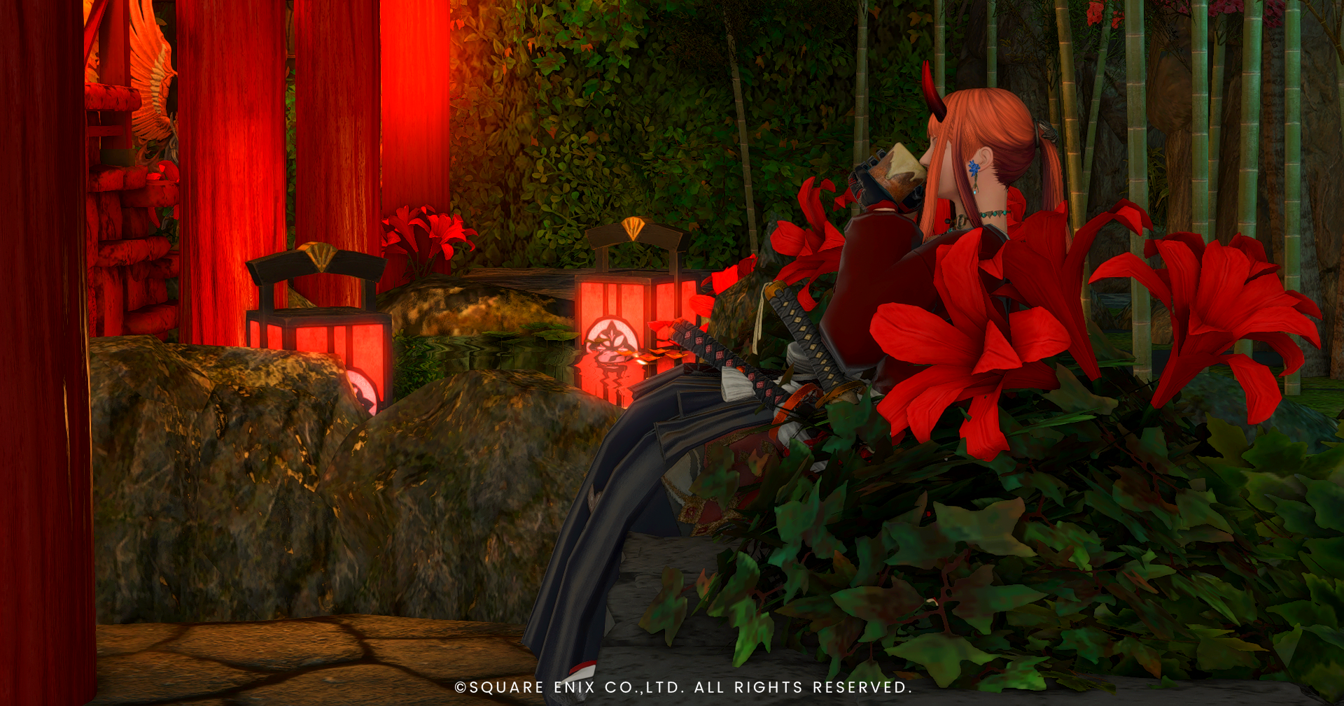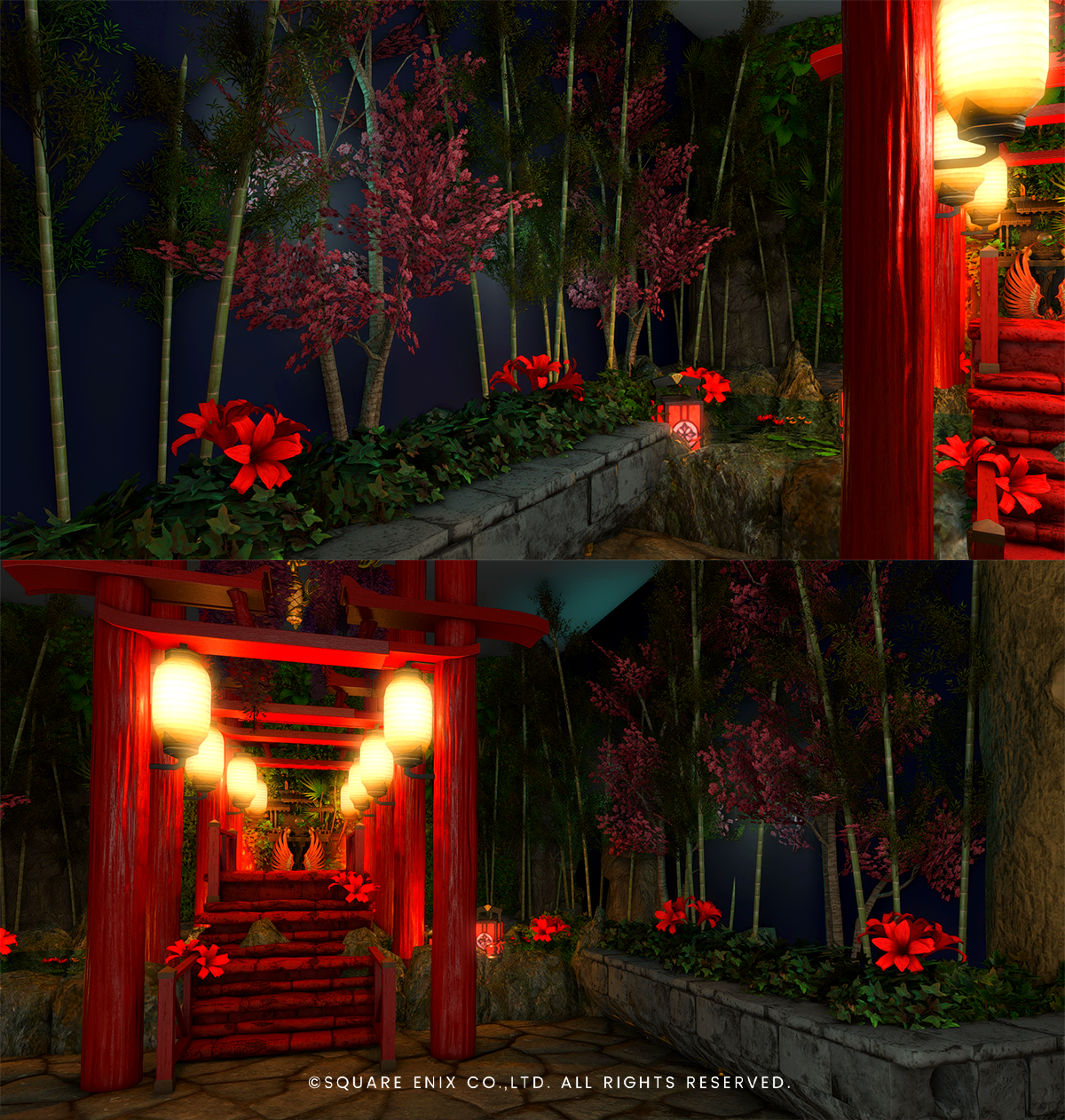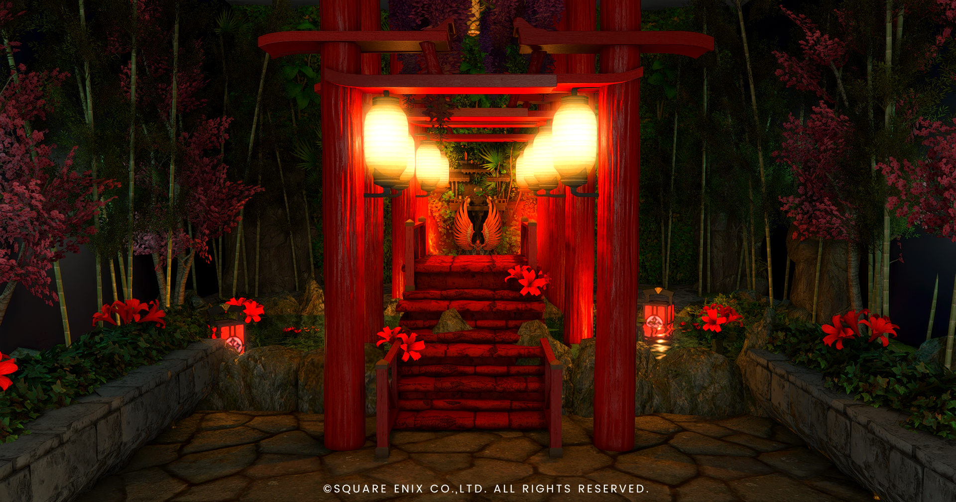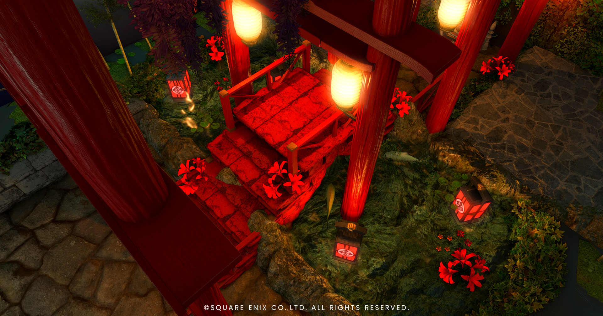 鳥居がある和風系の庭です。真ん中に橋があって、奇妙な朱雀像が橋の向こうにいます。