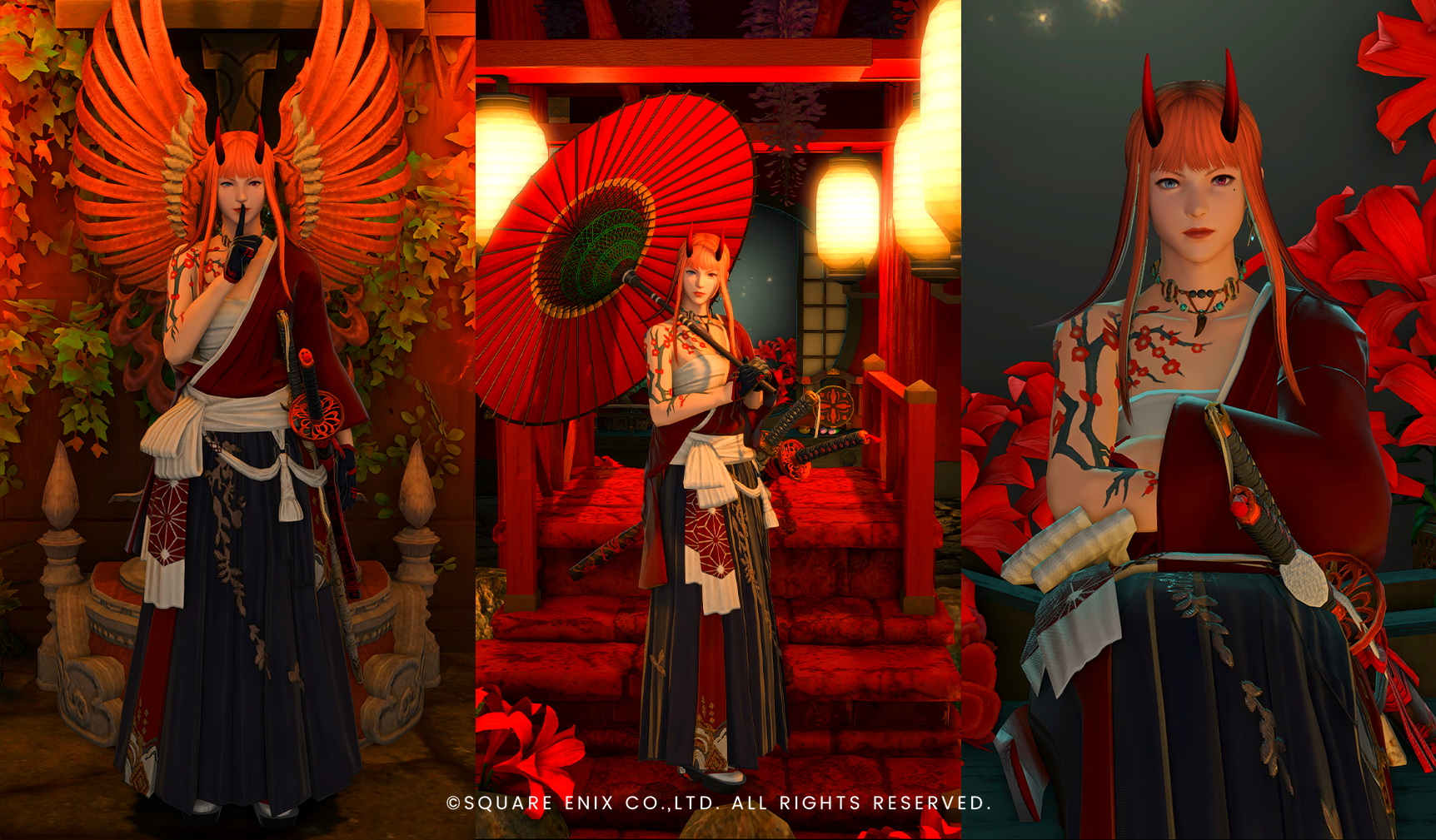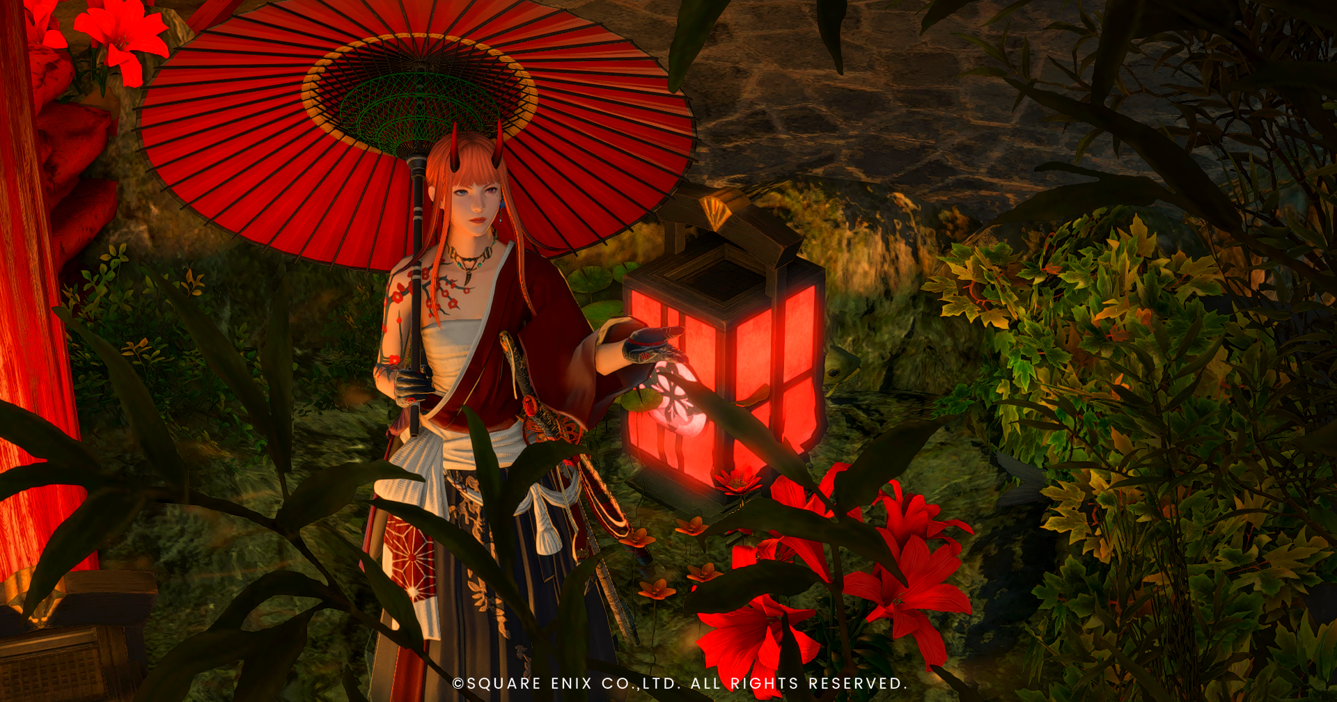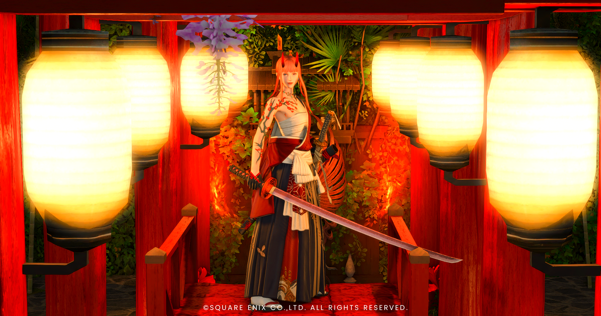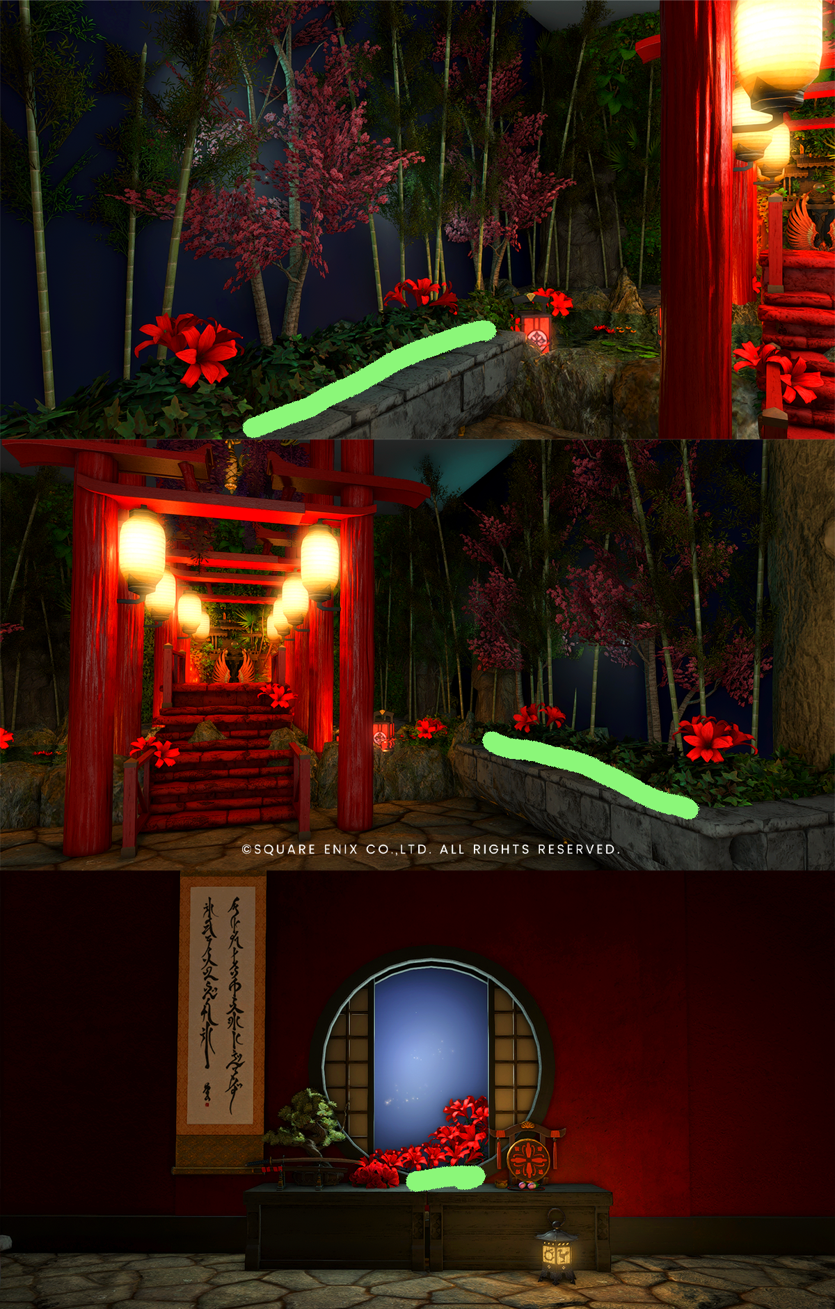 鳥居がある和風系の庭です。真ん中に橋があって、奇妙な朱雀像が橋の向こうにいます。