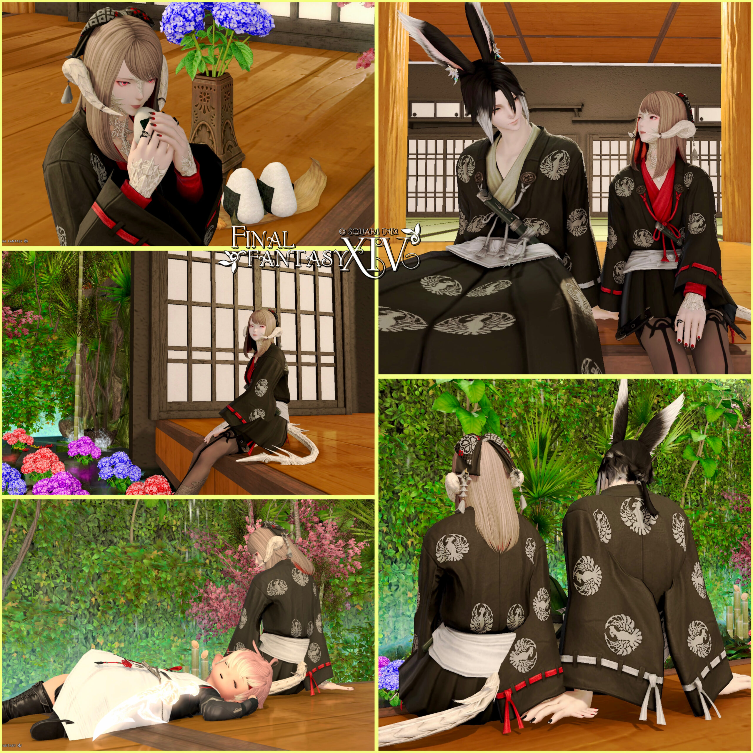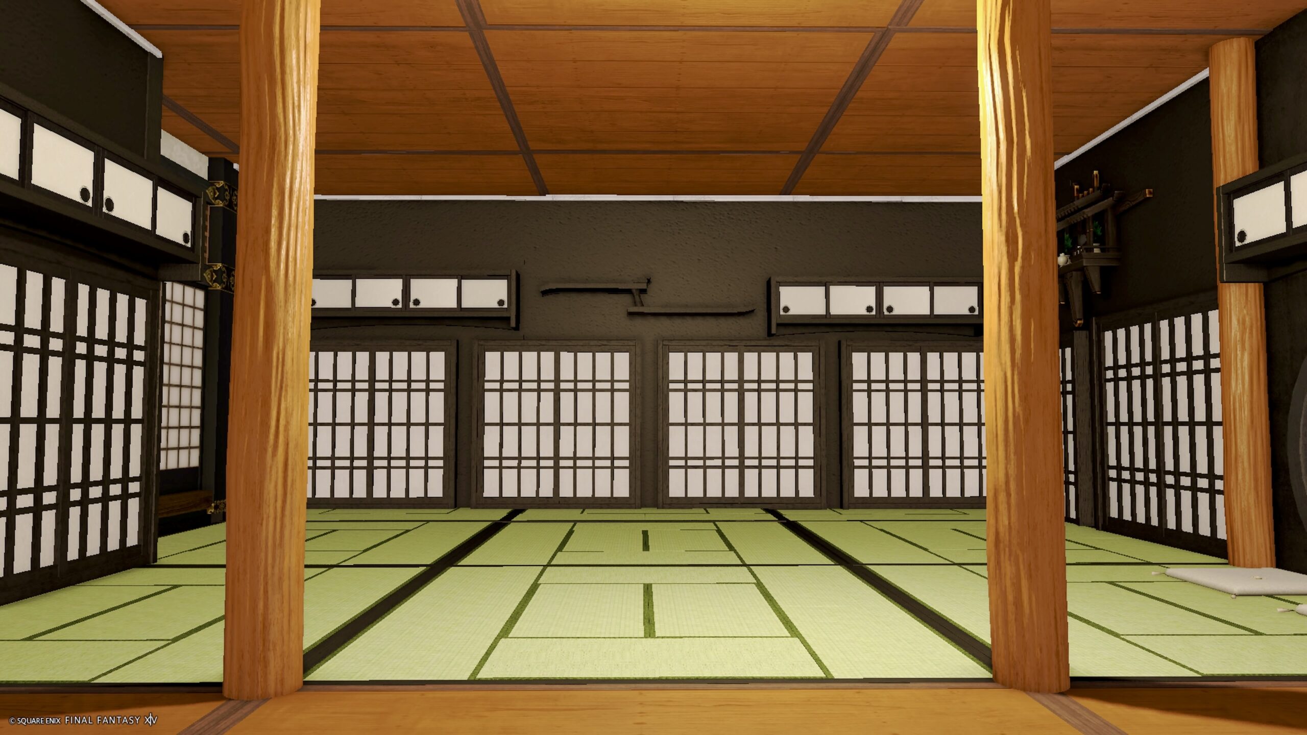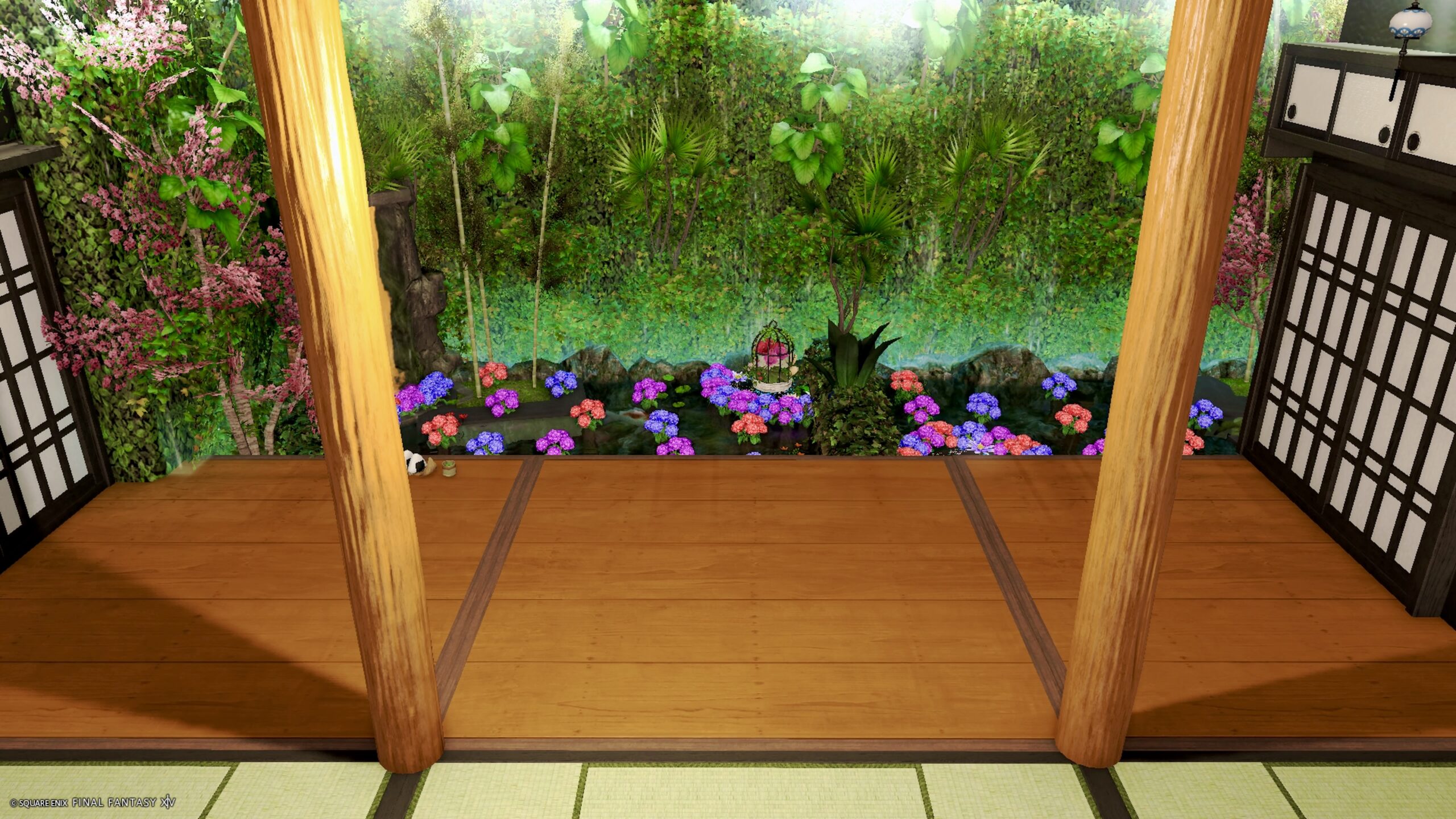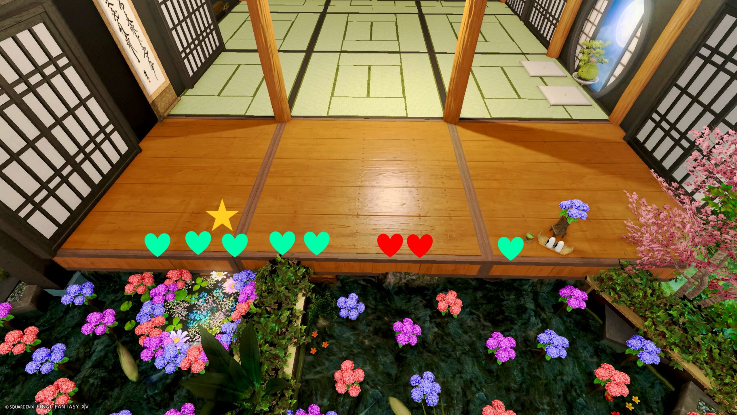 初和風ハウジング 💚は座れます! ⭐️はエモート「居眠りをする」をすると寝転がれます! ❤️の部分は4枚目SSの右2枚参考(右側に座ったキャラの手が上になります。)