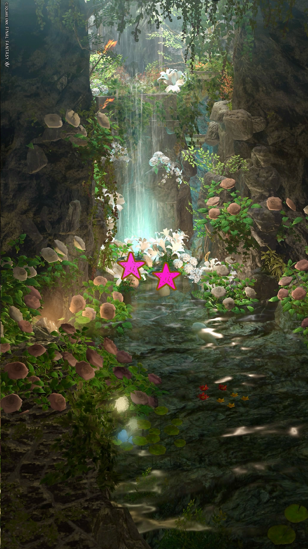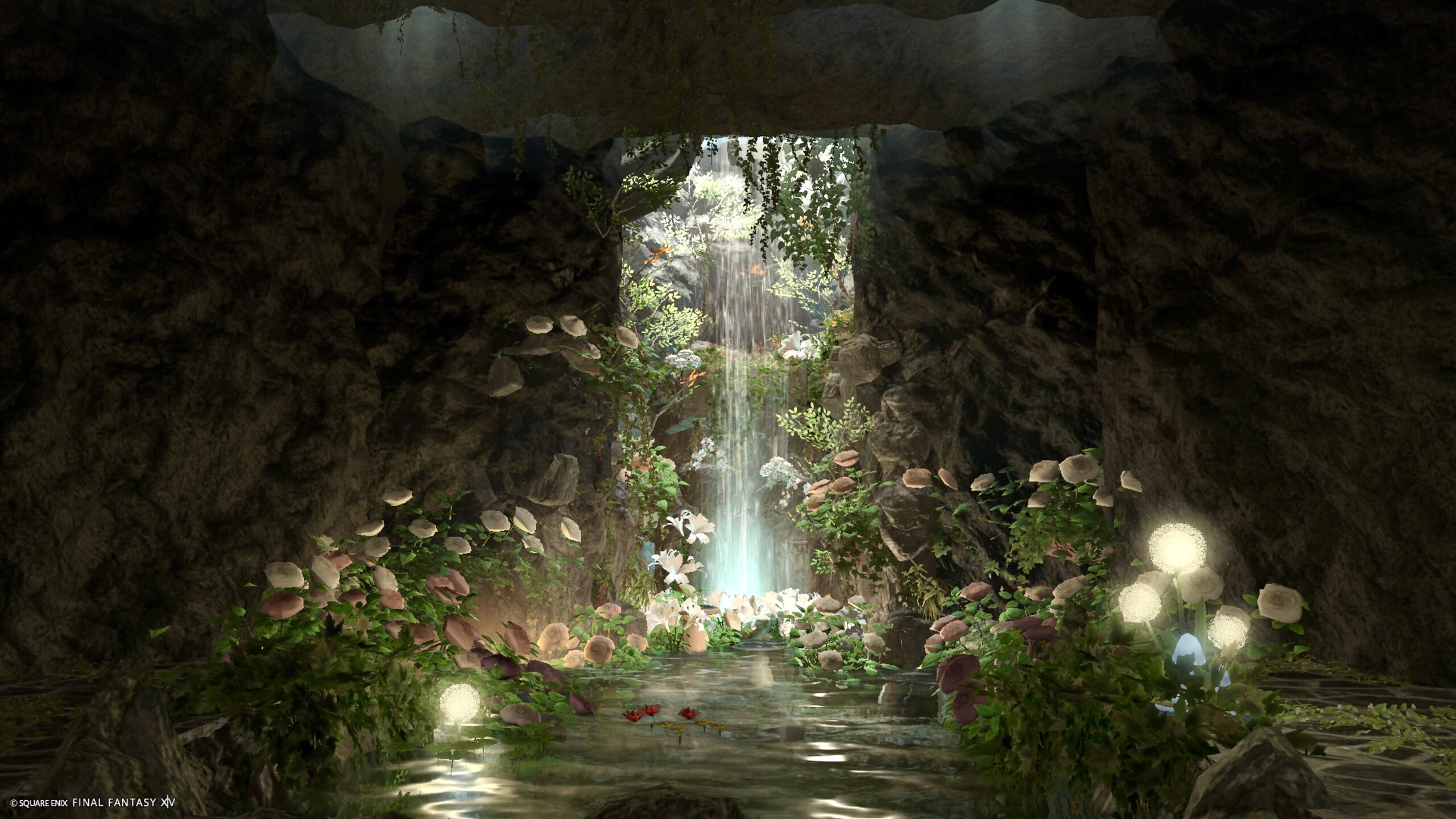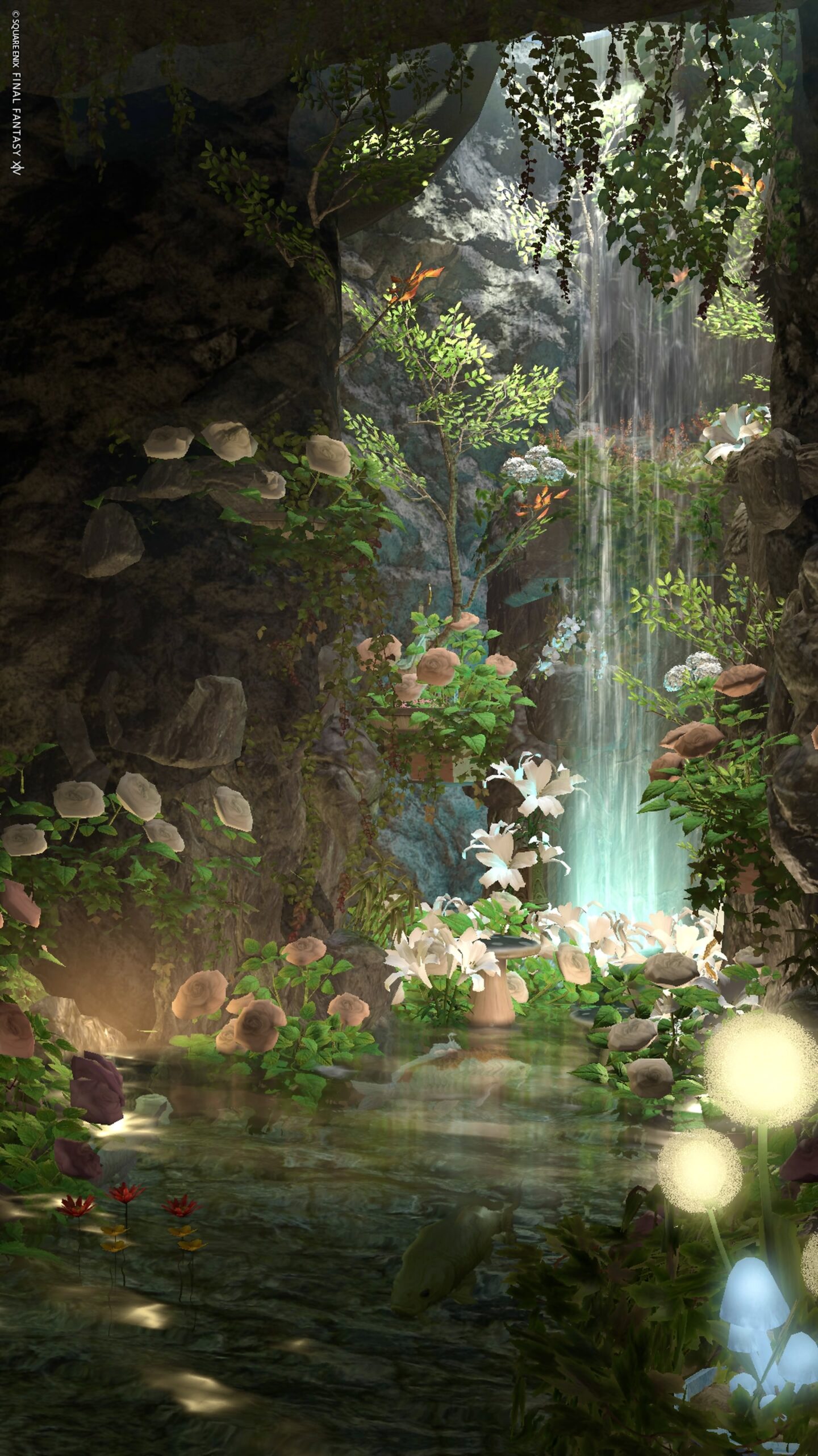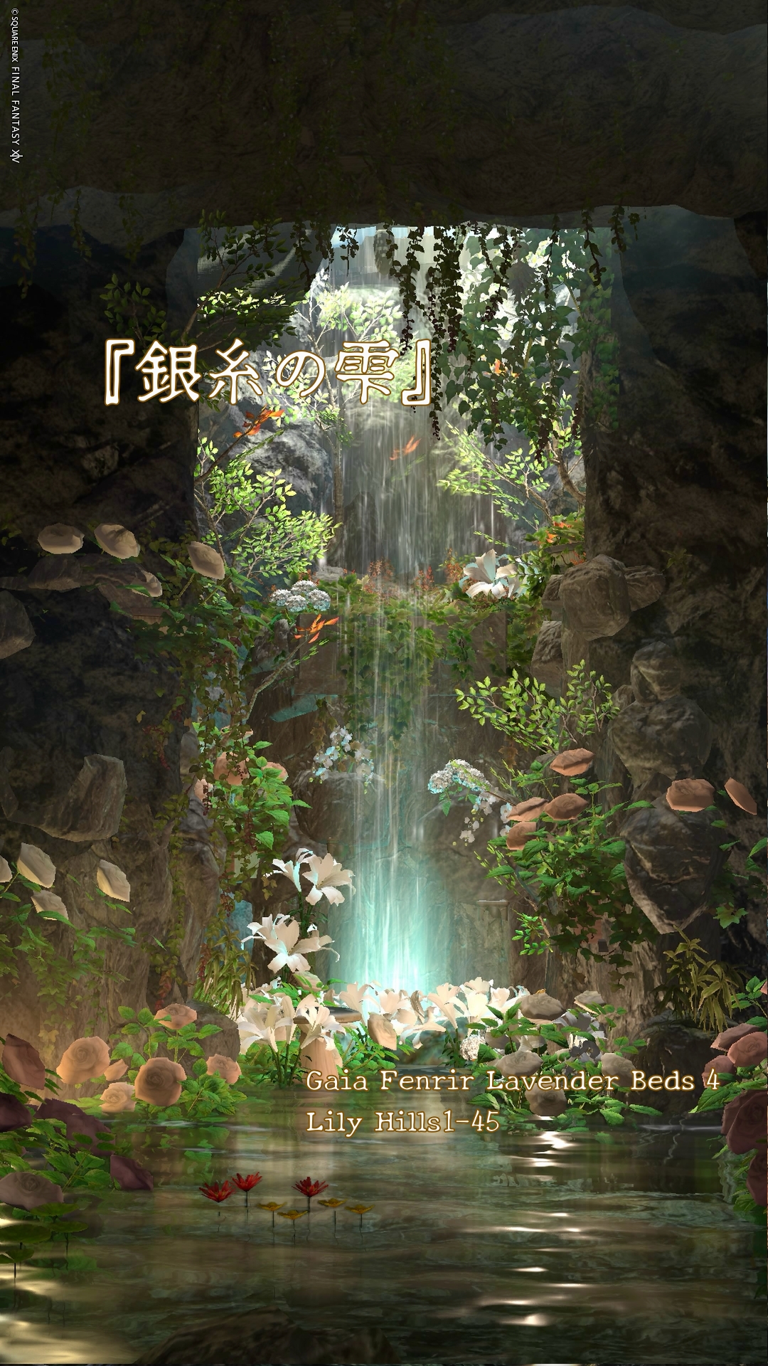 『銀糸の雫』 by きあ(||BR||)🌐Gaia / Fenrir(||BR||)📍ラベンダーベッド4区(||BR||)アパルトメント45号室(||BR||)(||BR||)「銀糸の雫」(||BR||)岩間の奥、光降り注ぐ滝のほとり(||BR||)柔らかな花々に囲まれて、静かなひとときを…(||BR||)フィルターやライトの当て方次第で、爽やかな朝の空気感から、少しミステリアスな(||BR||)#kiar_st(||BR||)https://studio-xiv.com/studio/91237/
