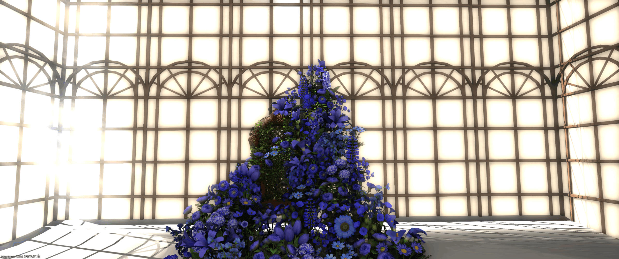蒼い花と光が溢れるシンプルな撮影ブースです。