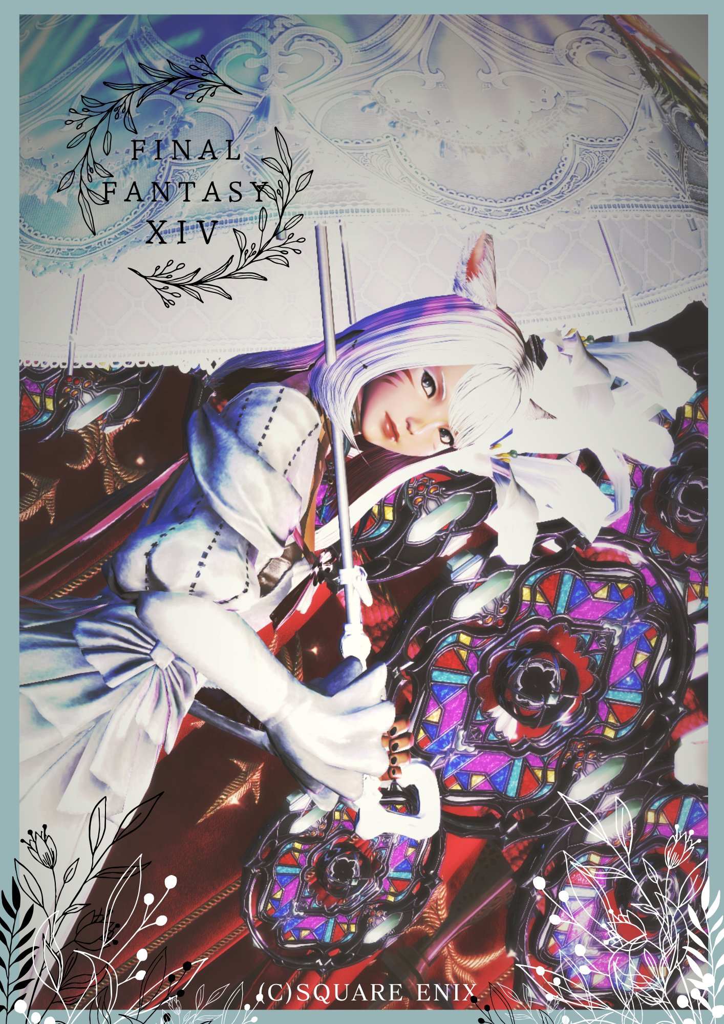 写真2枚目:利用者様が、ファーストライト武器の鮮やかな色彩と真っ白い傘の対比でかっこよく撮ってくださいました!この武器と赤い祭壇布の鮮やかな組み合わせを背景に自キャラを豪華に撮って頂きたいッ!