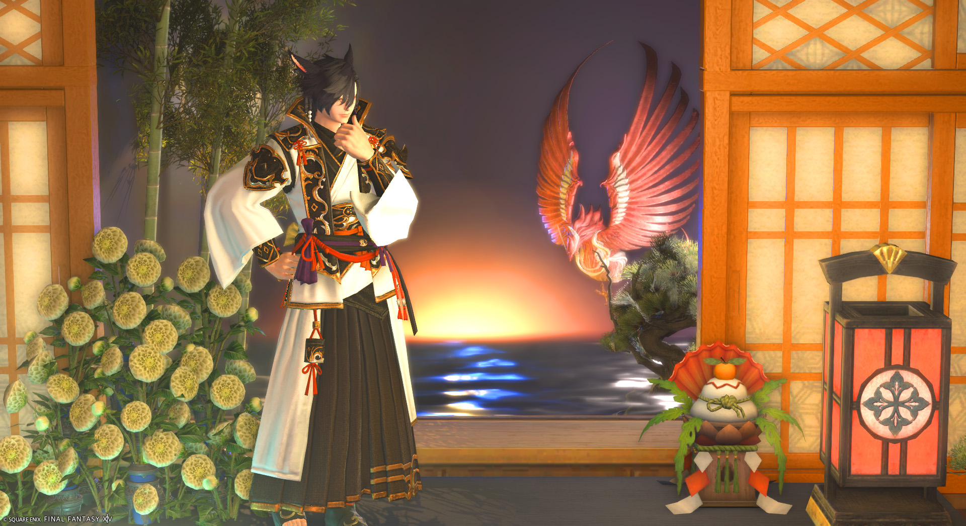 謹賀新年~Japanesque by Aki NAplus(||BR||)🌐Mana / Asura(||BR||)📍シロガネ11区19番5号室(||BR||)新年のご挨拶に最適!(||BR||)夜明けの海に朱雀が舞う景色を作りました!(||BR||)一押しは水面です!朱雀とか鏡餅とかはおまけだと思ってください!(||BR||)青と赤に複雑に揺らめく朝もやの海と、自キャ(||BR||)#studio_AkiNA(||BR||)https://studio-xiv.com/studio/92401/